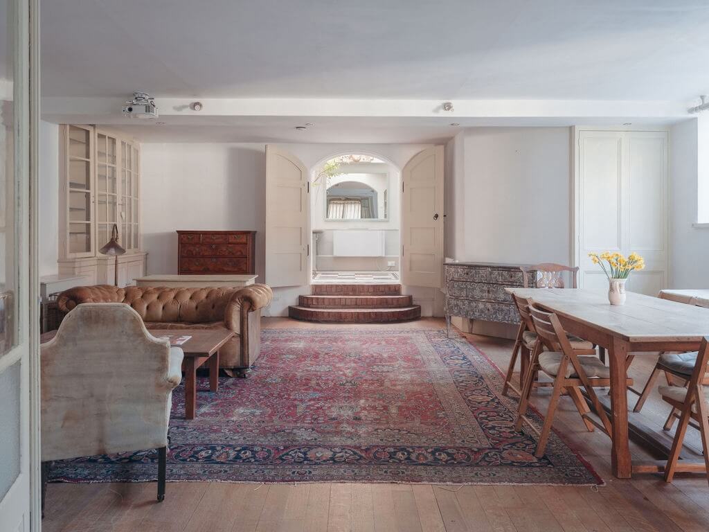 Studio 9 is conveniently unlisted, whilst also being of particular architectural interest as it was built by Manenti as his own personal residence. The front door opens into an elegant hall with tiled floor and Vitruvian scroll skirting. This leads into the open-plan airy living room – a lovely generous space with oak floor and expansive crittal windows. This houses a sitting area with chimneypiece and open fire, flanked by architectural niches, with a large inbuilt bookcase. The other side of the room is set up as a sociable dining area with space for a long dining table.
