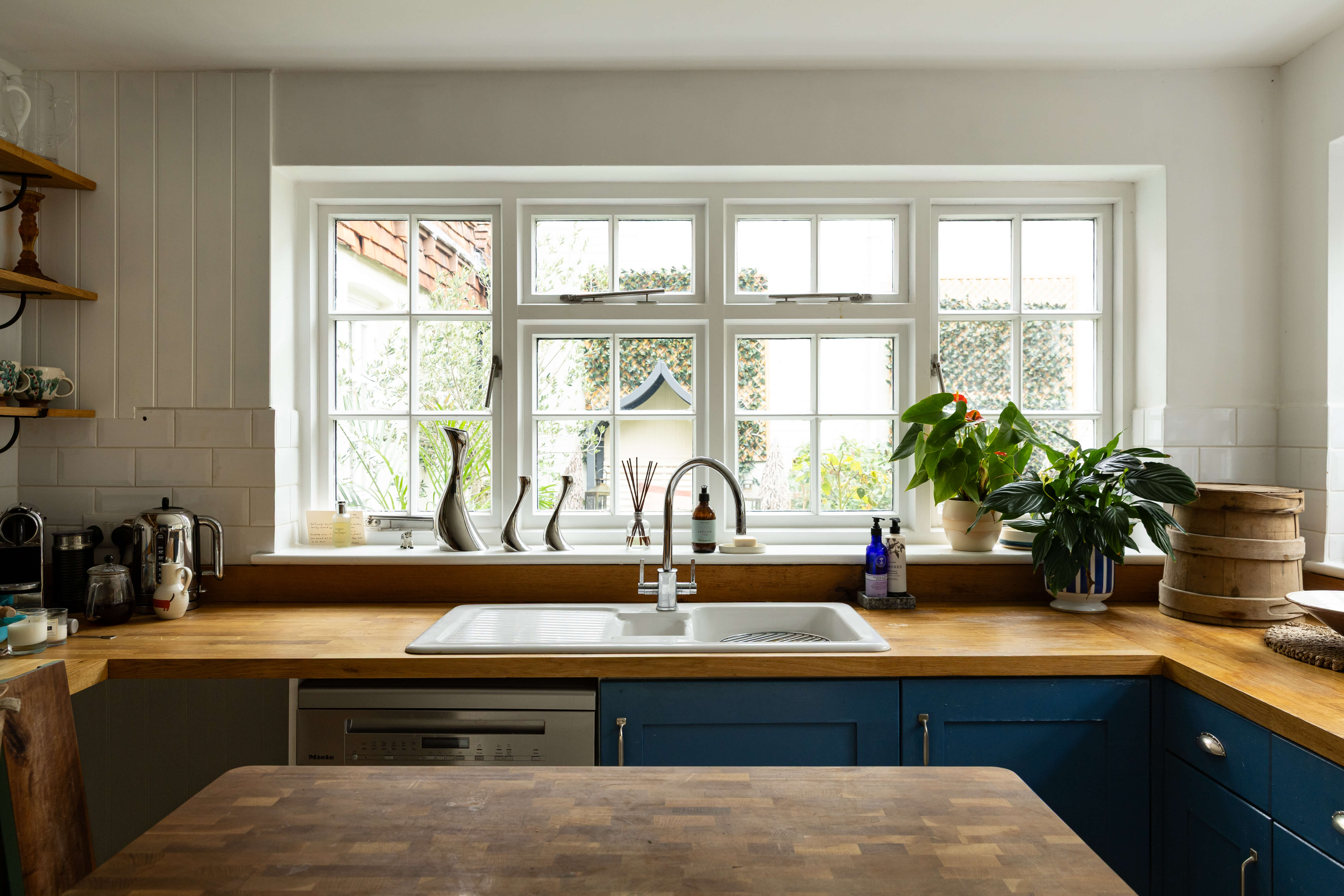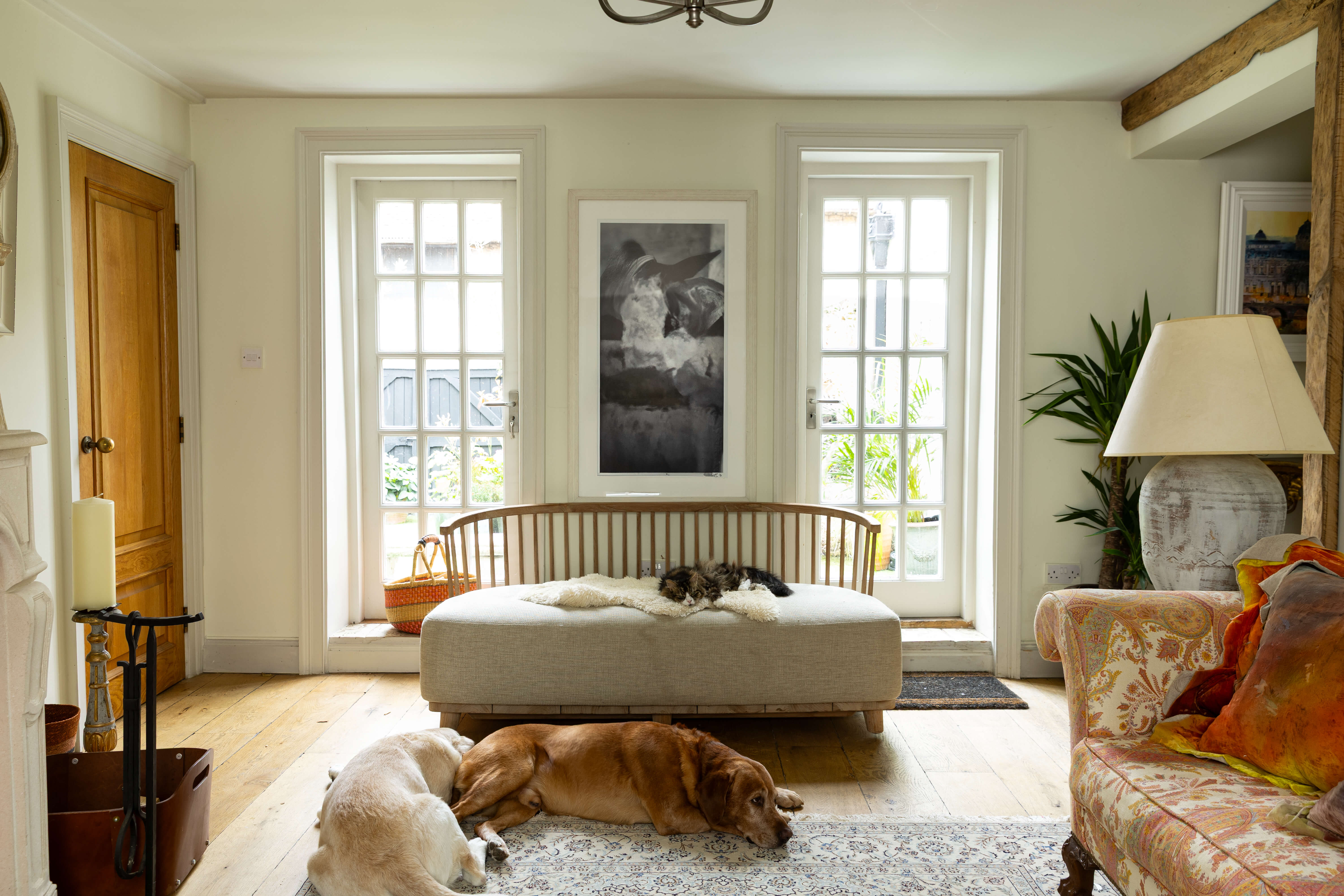 The front door opens into a welcoming hallway-come-dining room, with smart oak flooring, painted panelling, original beams, and lovely-height ceilings, which continue through the house. The bright and airy dual-aspect sitting room next door has a new Chesney stone mantlepiece, cosy open fire, and two sets of glazed doors opening out onto the garden. The dual-aspect kitchen with fitted cabinetry, new wooden worktops and pretty open shelving and a dazzlingly handsome La Cornue range cooker, is situated through double doors off the generous entrance hallway, overlooking the garden.
