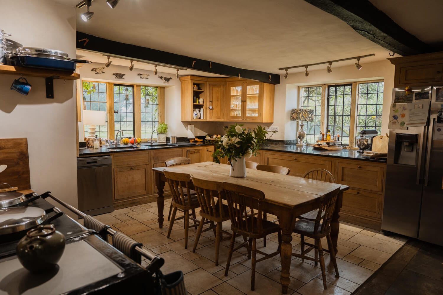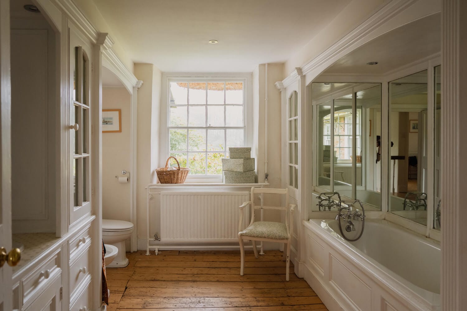 The generous dual aspect family kitchen with its flagstone floor is located at the back of the house. It has been refurbished by Neptune with beautiful fitted limed oak units lining the walls and space for a breakfast table to comfortably sit at least eight people in the centre of the room. Integrated appliances include a wine fridge, as well as an oil-fired 4-oven AGA. The kitchen also has an adjoining pantry with traditional stone shelf, and a scullery/utility room with butler’s sink next to the back door, where further white goods, coats, boots and washing can be hidden away.