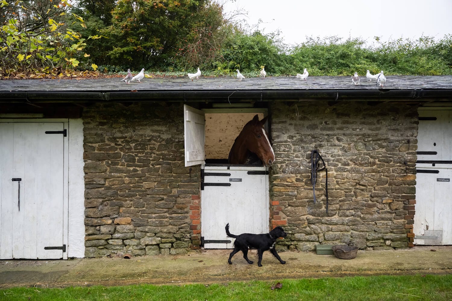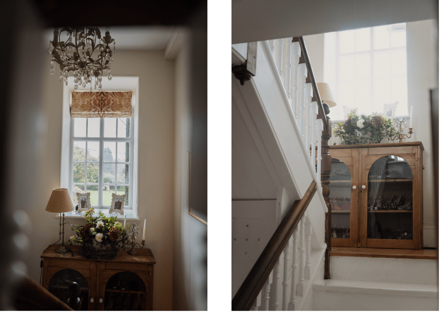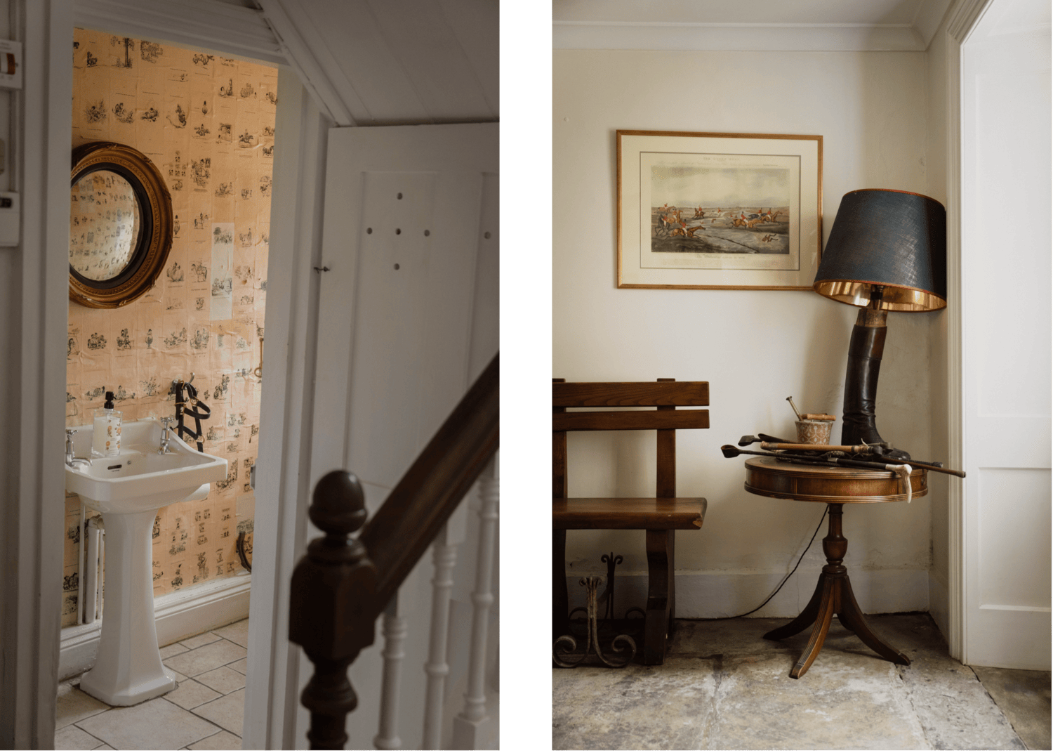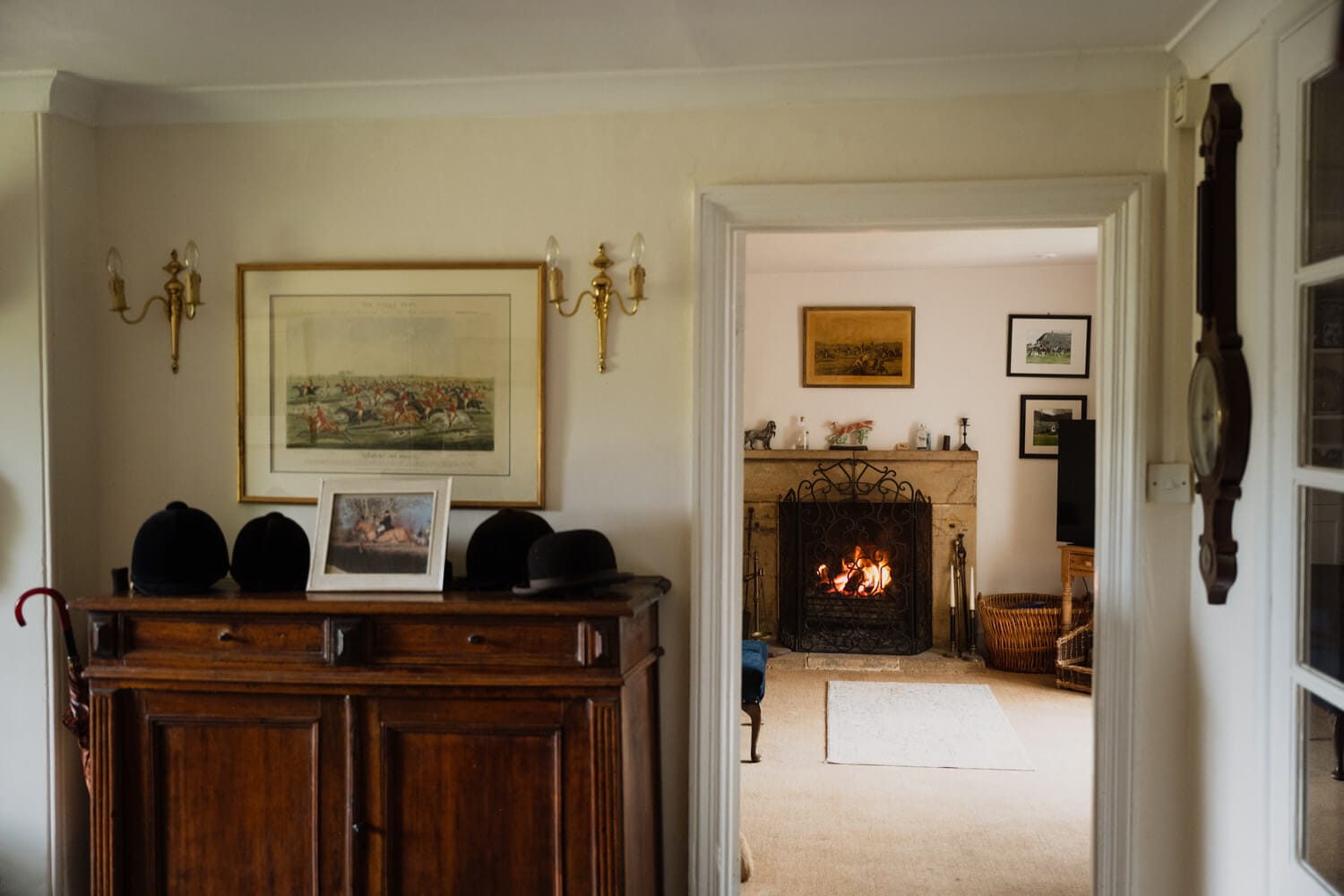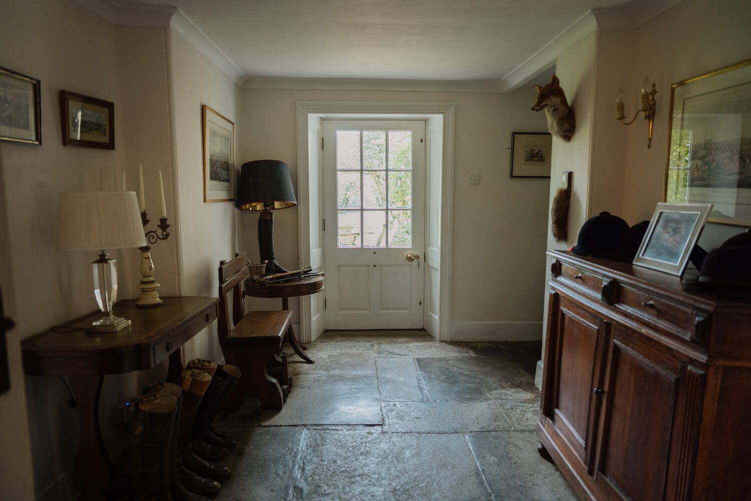 A gravel driveway sweeps around the side of the house to the rear of the property where there is plenty of parking for several cars, as well as vehicular access to the stables. The front door is topped with a pretty painted classical porch and leads through an internal glazed inner hall into the front hallway with original Blue Lias flagstone floor and sight right through the house to the back garden through a half-glazed side door.