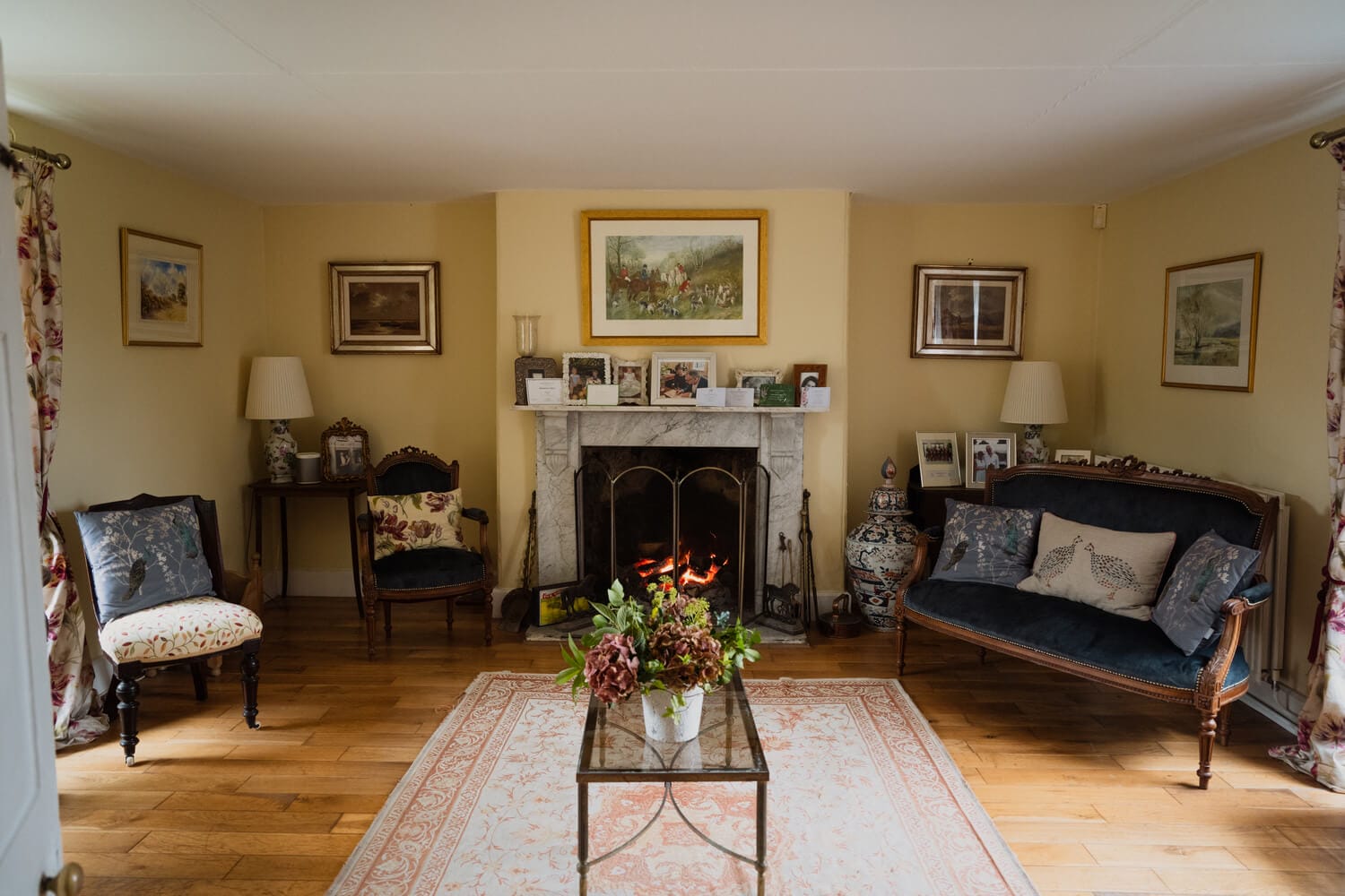 To one side of the hall sits the dual aspect drawing room with shutters, wooden floor smart inbuilt regency bookcases, and open fire with marble chimney piece, to the other side sits a cosy separate sitting room with open fire and stone chimney piece. The dual aspect dining room also includes an open fire with classical carved chimneypiece and herringbone parquet floor.