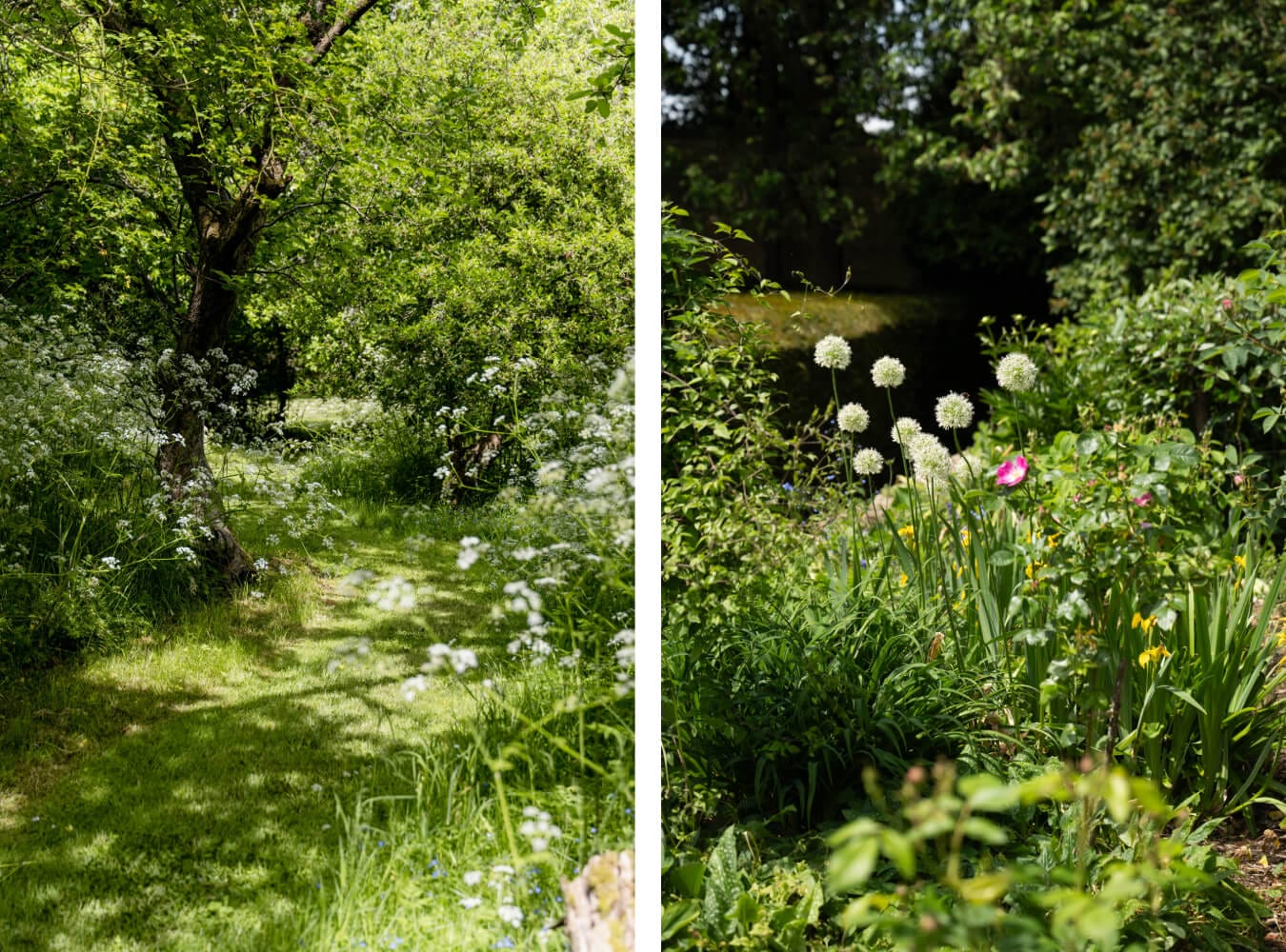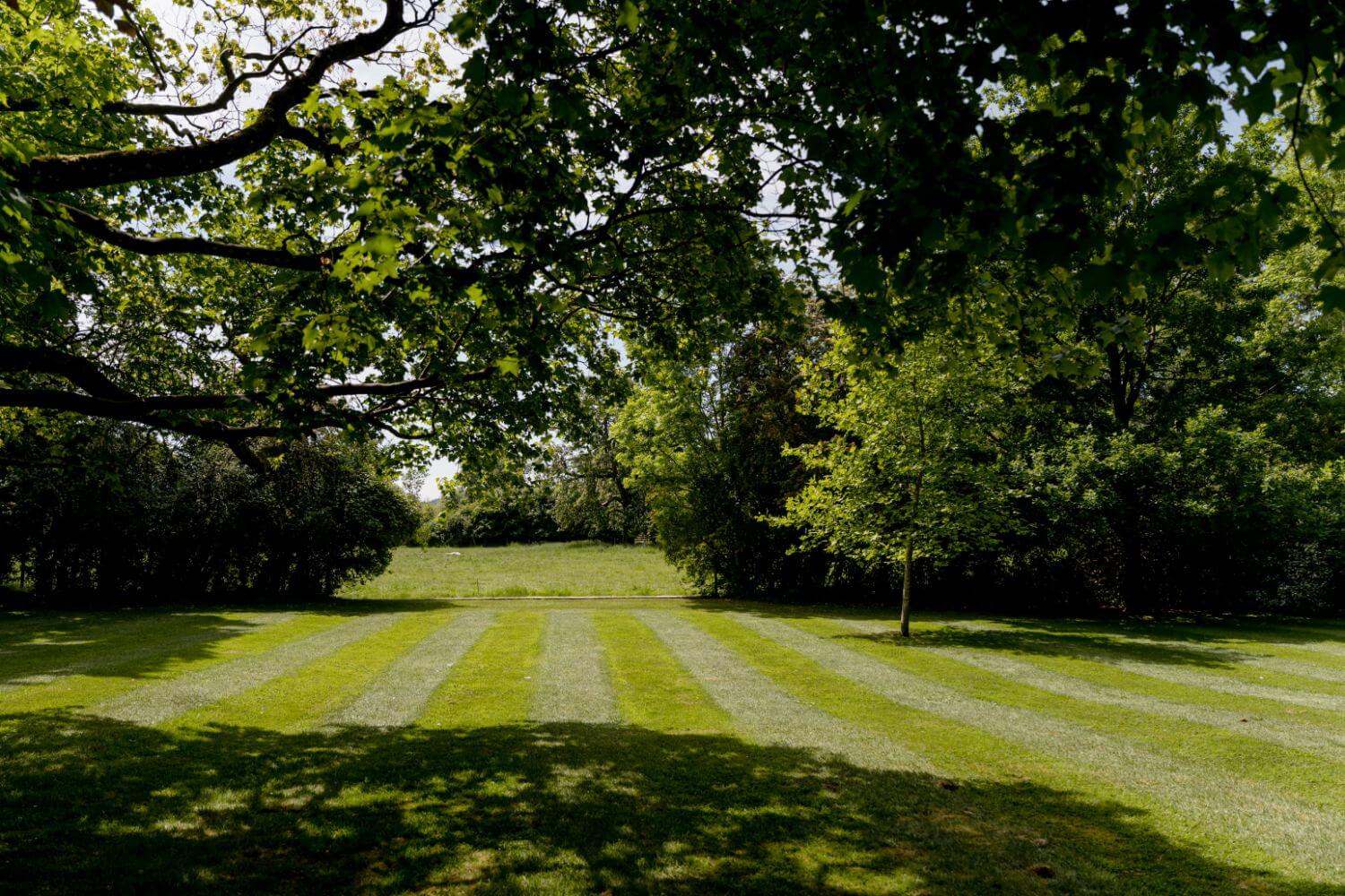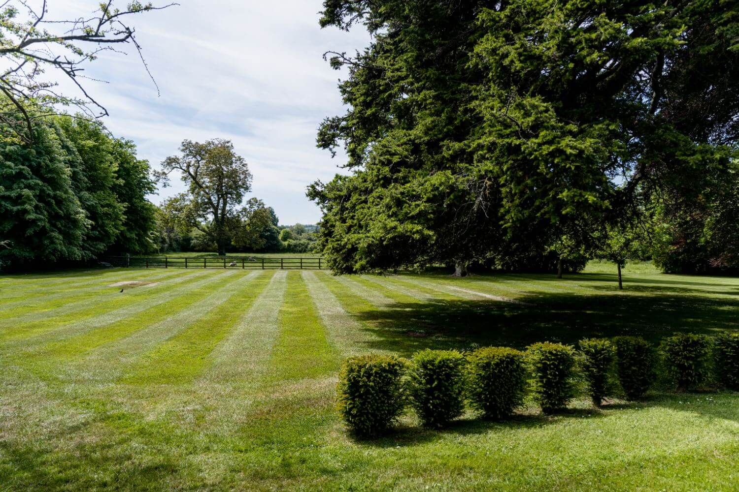 A ha-ha separates the lawns from the paddocks. An area of woodland gives a natural area which includes both new and mature trees, a duck pond, and mown paths.