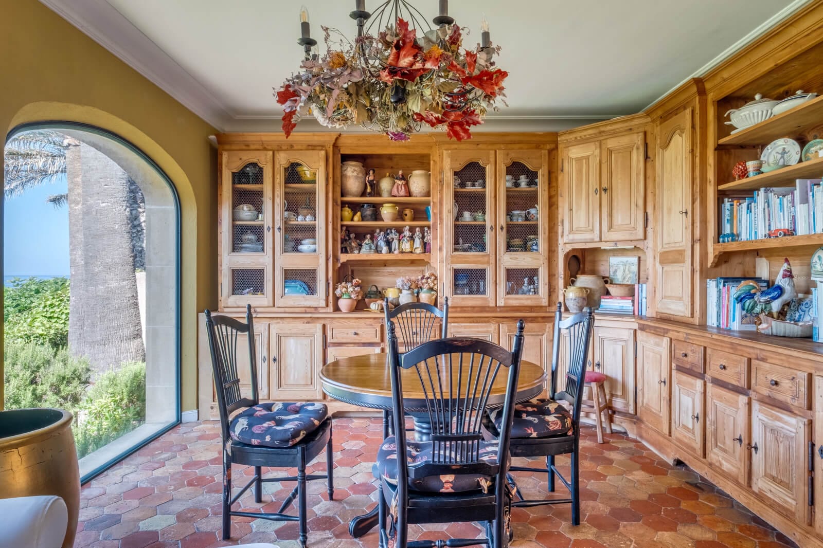Towering several metres over a coastal trail perched above the sea, which the region’s Mistral wind often whips into a frenzy, the garden of nearly 3,000 m² includes several shaded terraced areas, partially covered in lawn, which are planted with tall pines as well as a variety of other trees, shrubs or Mediterranean varietals. Below the villa, a 11 x 5-metre blue tile swimming pool, the edges of which are clad in limestone and terracotta, is surrounded by a terracotta deck with concrete benches, while an octagonal stone fountain, a little further back, is also bordered by terracotta tiles. Abutting numerous outbuildings, connected to one another by a patio decorated in an array of colourful terracotta floor tiles arranged in geometrical patterns, the whole is ideal for peaceful moments of relaxation facing the endless blue horizon and the verdant garden’s vegetation, while the nearby coastal control path is directly accessible from the property via a door.