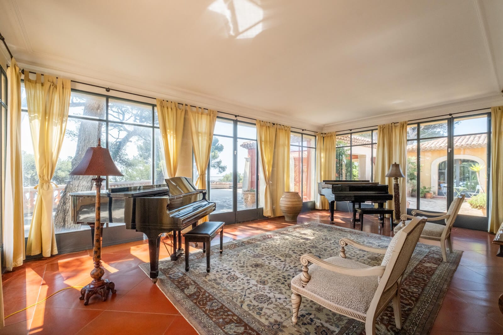 Around the ancient mill, successive transformations to the dwelling made it possible to create immense living areas extended outdoors by many patios, which overlook the Mediterranean’s crystal blue waters, while its understated, but bright ochre plaster-coated exteriors in shades of yellow pink and beige are punctuated with windows in a range of sizes and shapes, the surrounds and windowsills of which are in ashlar stone as are the house’s quoins. As for its barrel tile roof in a variety of heights and shapes – one, three or four sides as well as conical – depending on the layout of the villa’s different building structures, both circular and rectangular, it is bordered, for the most part, by genoise cornices.