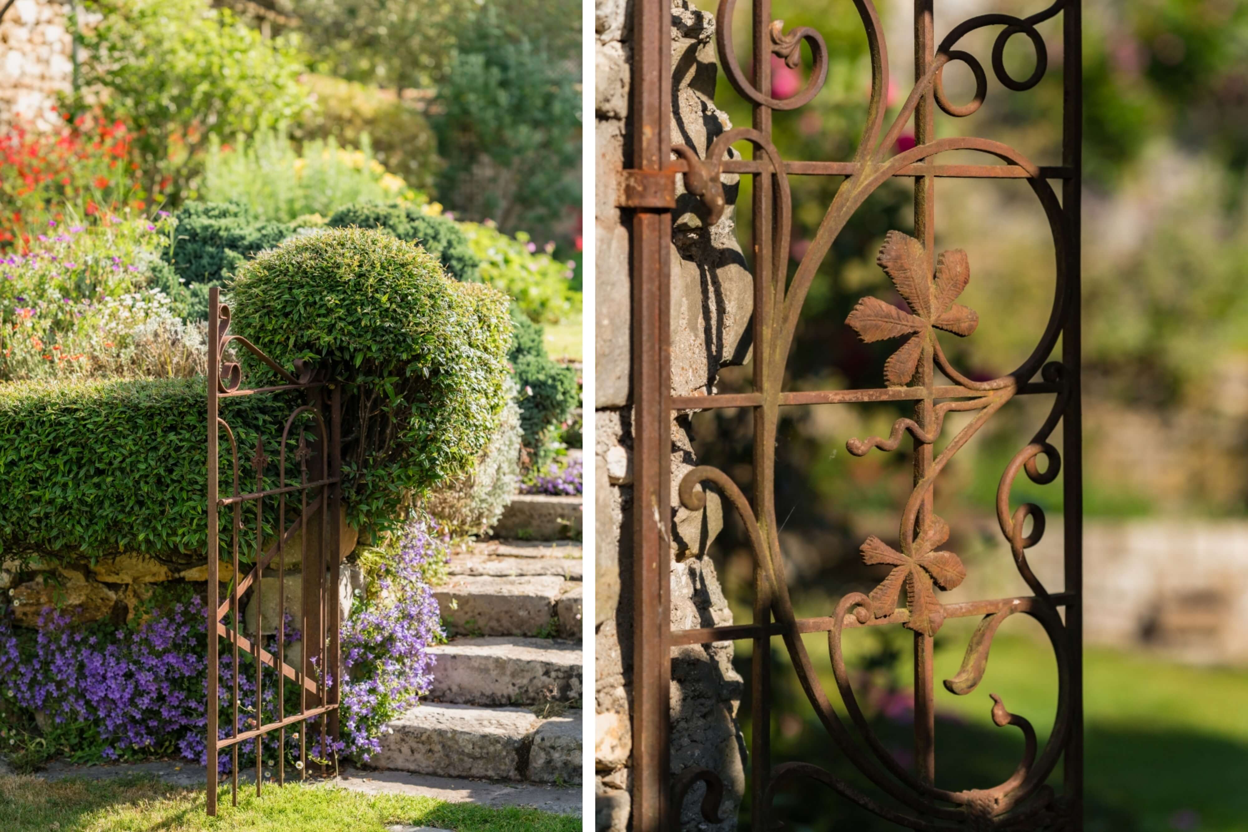 The garden is divided into four sequences of different levels as well as moods and makes up a veritable living décor. The focus of the first of these levels is the catalpa tree surrounded by cobbles. Stone is the dominant feature in this scene of cobbled paths, weathered steps and beds of pruned shrubs. Climbing roses, magnolias, irises and agapanthus punctuate this sober composition with nuances of purple and lavender blue, while daisies can also be found in between the cobbles. In the second picture, a few steps higher, a garden surrounded by a stone border boasts a colour palette ranging from white to violet, including touches of pale pink. A water tap and a cosy outside dining area are enveloped by the deep green of the foliage. Through a gate, the scene of the third section is freer in style. The path is lined with carefully chosen perennial plants and winds through a cornucopia of colours. In the background, a tall bamboo hedge underlines the verticality of the stone walls. Finally, through a larger gate, a last enclosed space opens out onto the rear façade of the house with a covered area and makes up the fourth canvas.