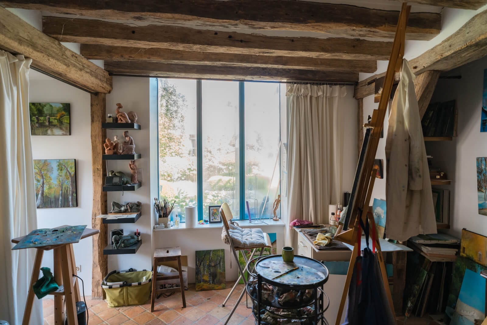 A north facing window allows light to generously stream into this 16-m² room and to remain constant, which is ideal for artistic activities. Adjacent to the main room are a shower, washbasin and a lavatory. The exposed beams, half-timbering and terracotta tiles provide a sober setting. Two adjoining outbuildings are used as storage space. They could be converted to form an extra bedroom when added to the surface of the studio.