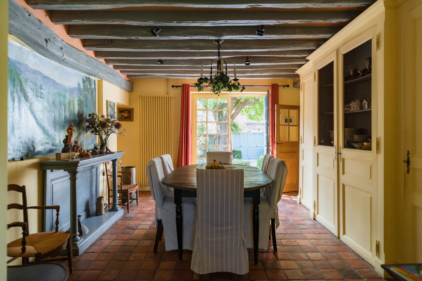 On the other side of the entrance door lies a 40-m² lounge whose floor is paved with Burgundy stone. Beneath the exposed beams on the ceiling painted in pearl grey, along one wall, custom-made bookshelves frame a fireplace with a moulded mantelpiece and a brick hearth, extending to a staircase boasting almost organic curves with sculpted oakwood panelling and upholstered walls. A small paned glazed door opens into a dining room with terracotta floor tiling, which can also be found in the kitchen, lavatory and hall opening onto the garden. This dual aspect room is equipped with a china cabinet boasting moulding and cornices, beneath a ceiling with exposed beams. The fully fitted kitchen boasts visible half-timbering, while an old plate warmer and oven bestow it with an authentic atmosphere. The garden can be reached through French windows.