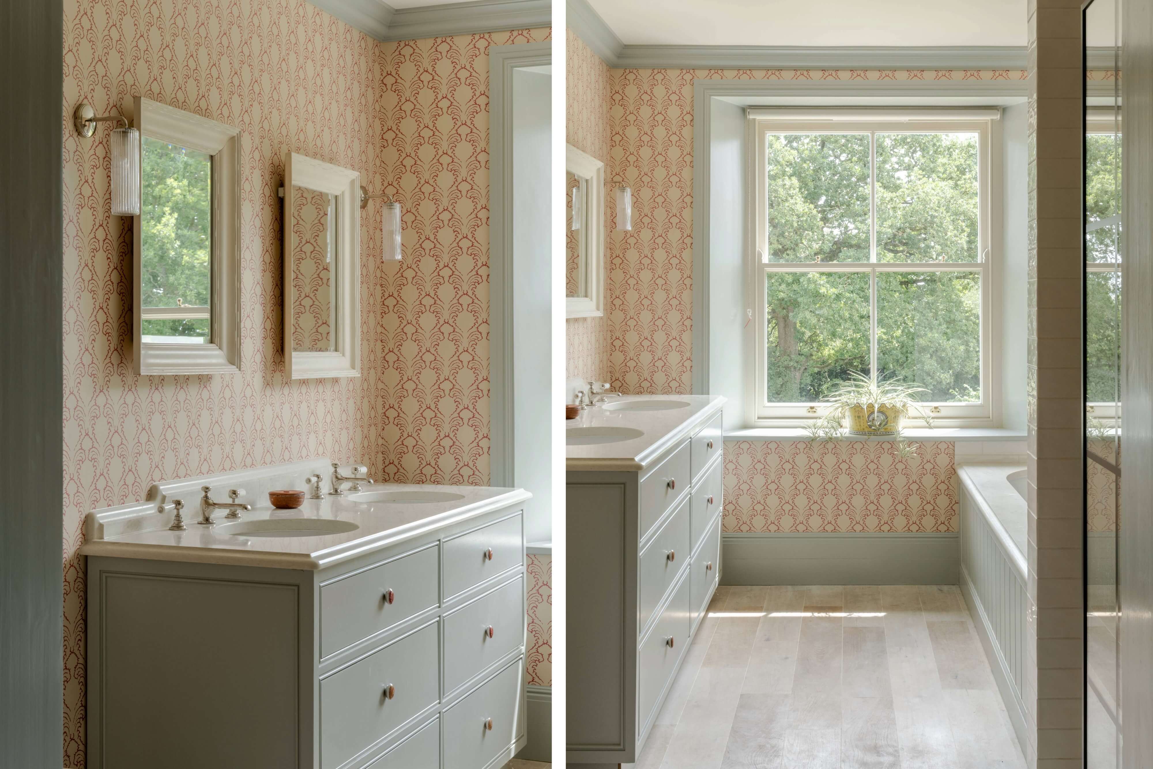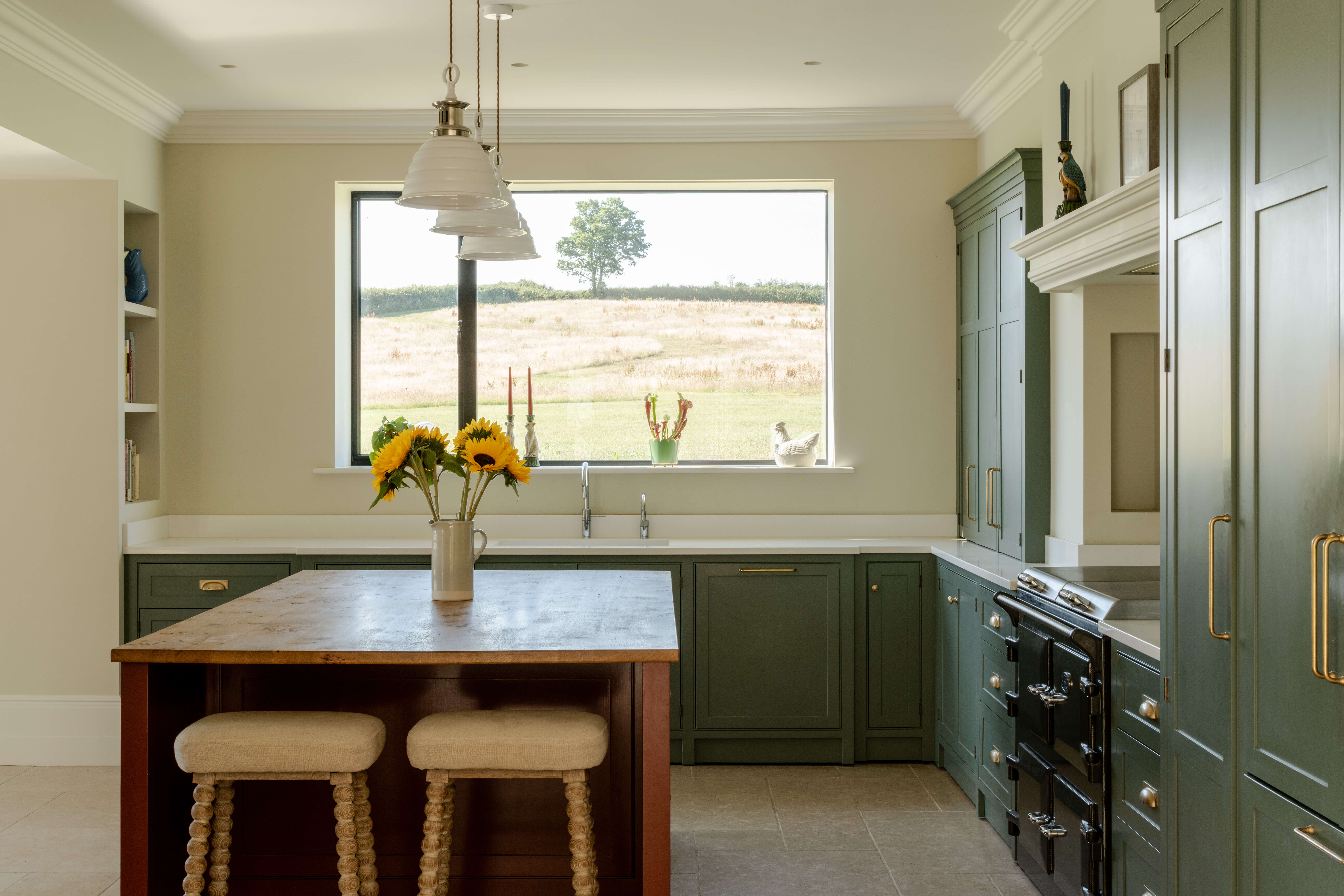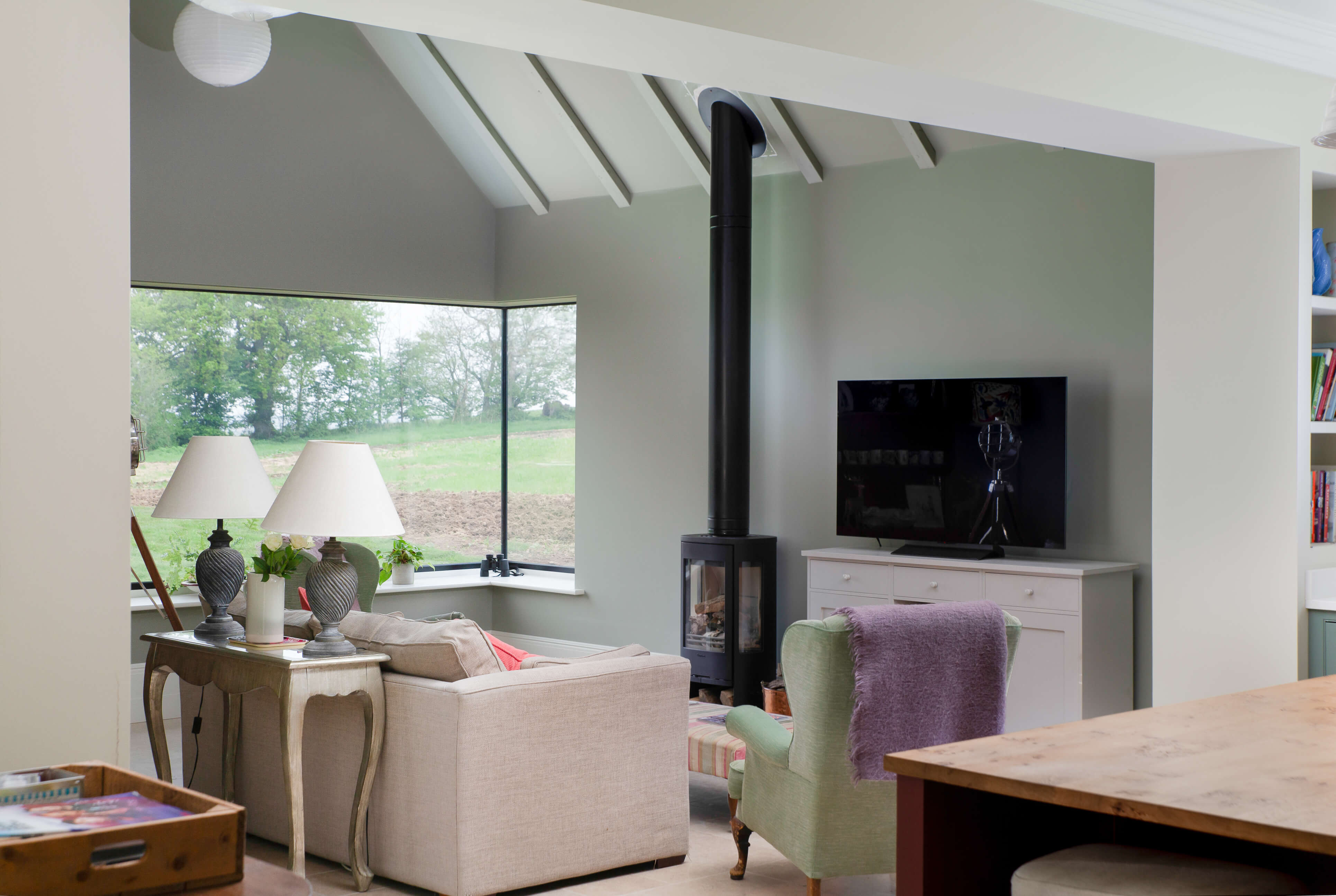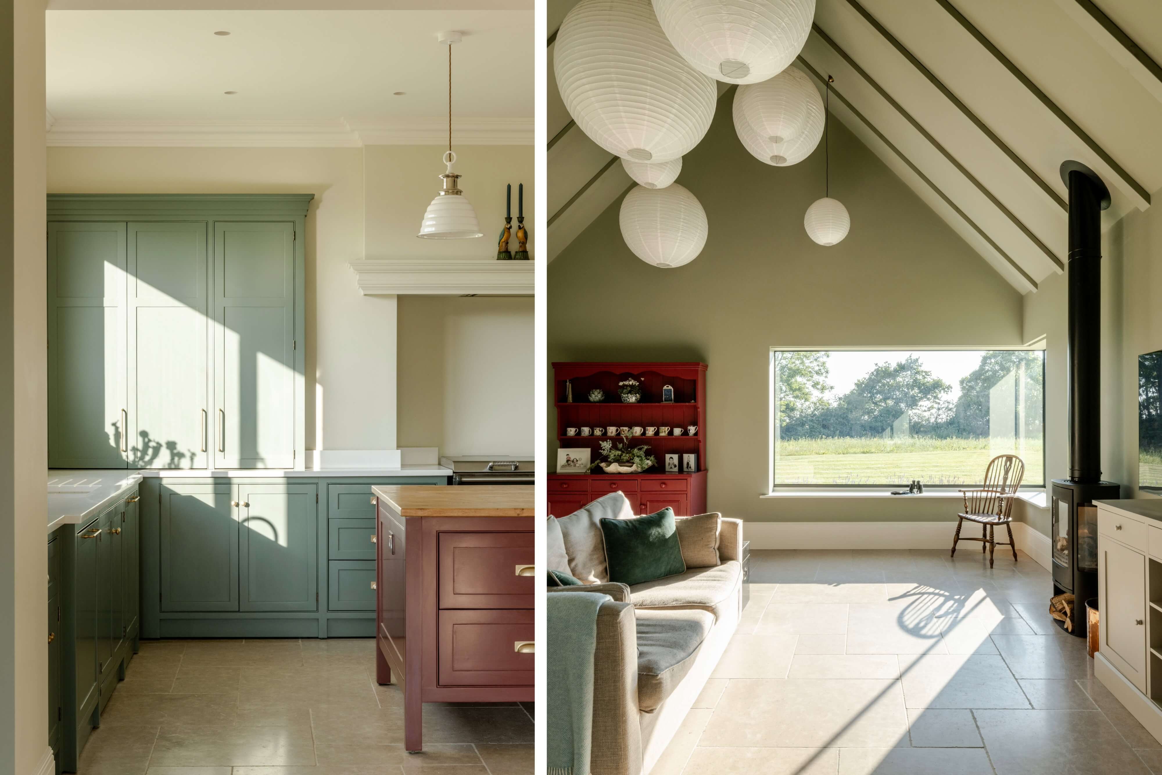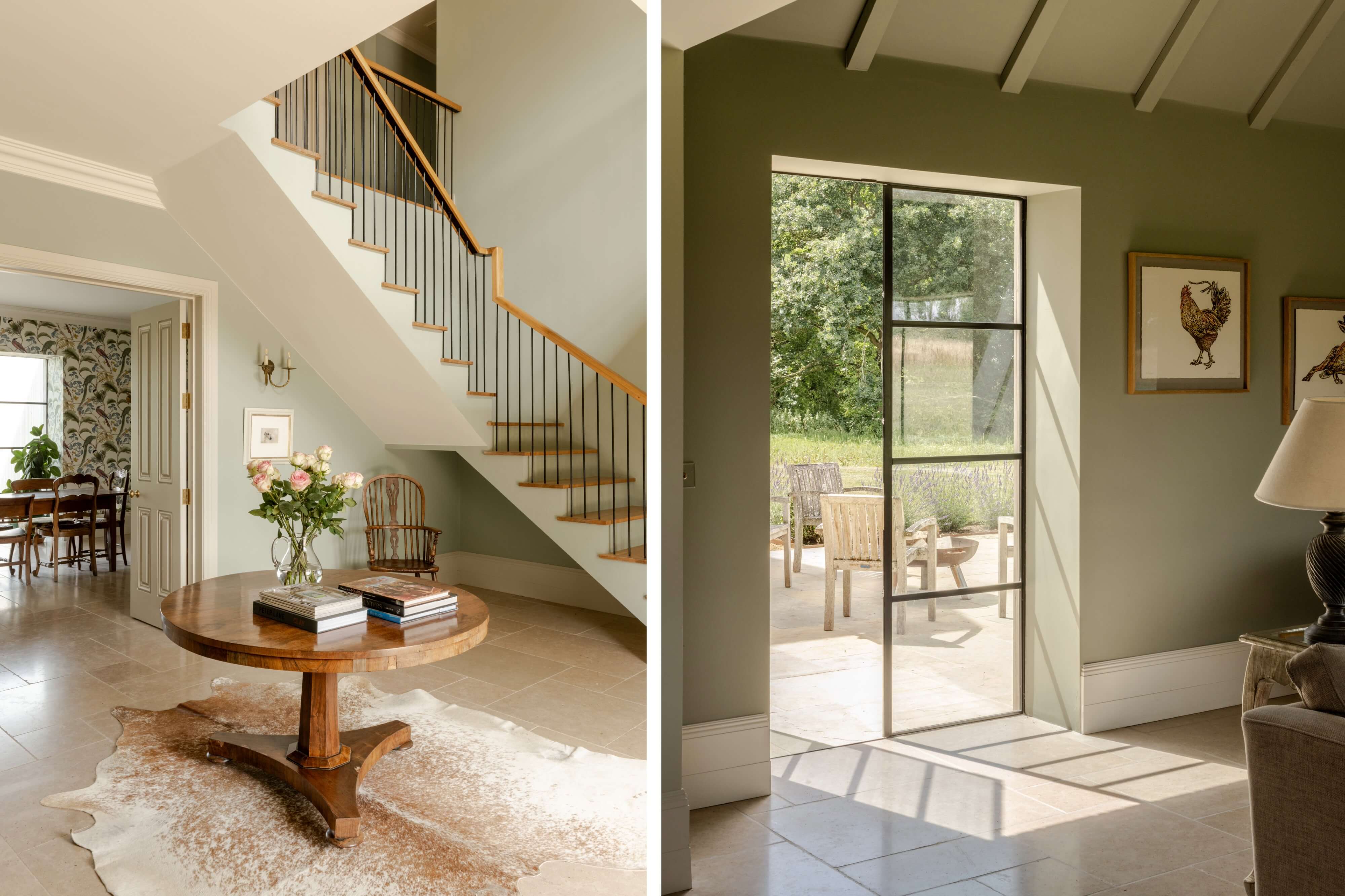 Inside, a wide flagstone hall forms the heart of the house, from which all the high-ceilinged rooms flow effortlessly. The 38ft kitchen, dining and sitting room is the natural hub of family life, with flagstone floors and frameless corner glazing that dissolves the boundary between house and garden. Both this space and the large drawing room — with its triple aspect, elegant stone chimneypiece, and more formal atmosphere — open directly onto the south-west facing terrace via crittall French windows. A further family sitting room, currently used as a games room, adds flexibility to the ground floor.