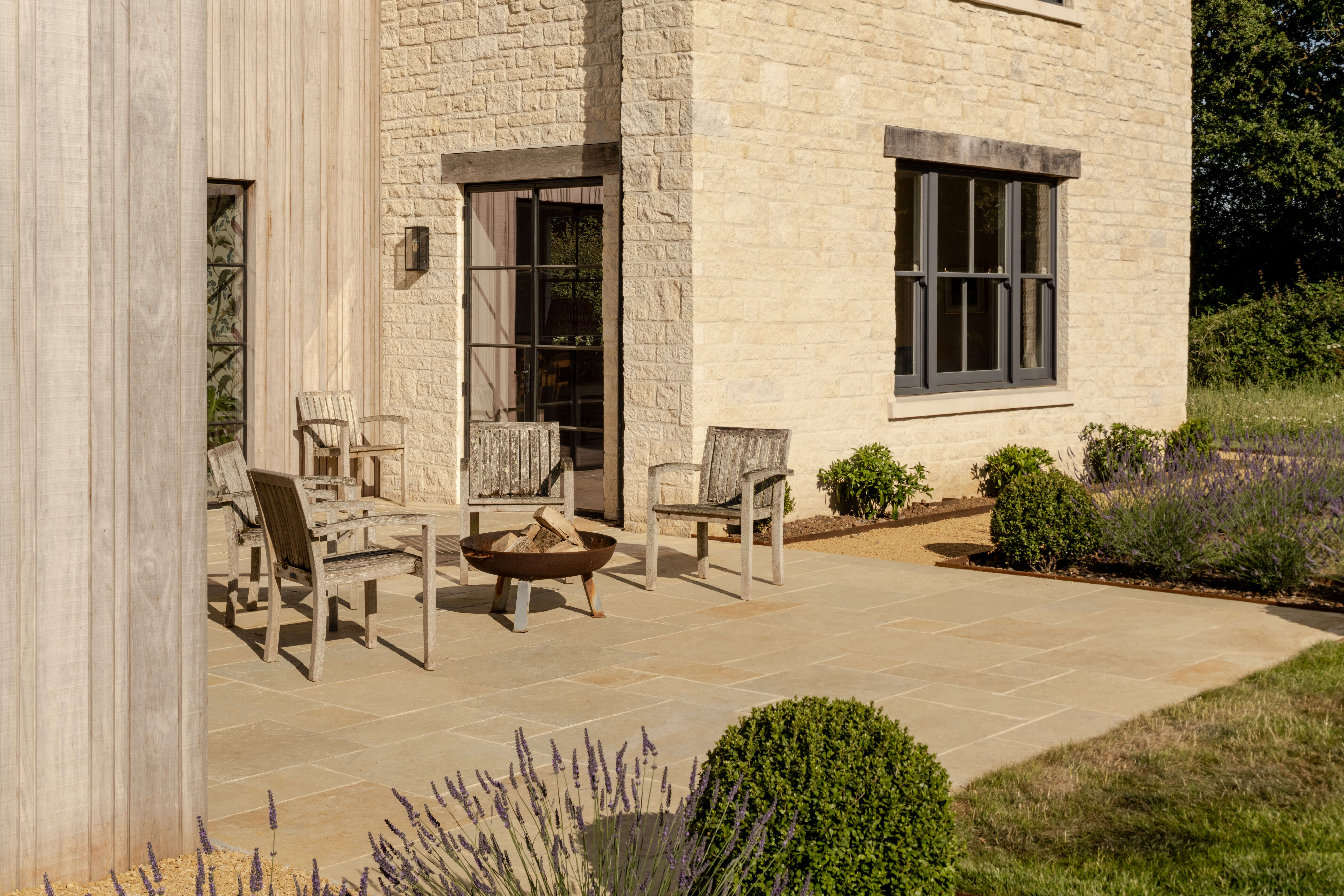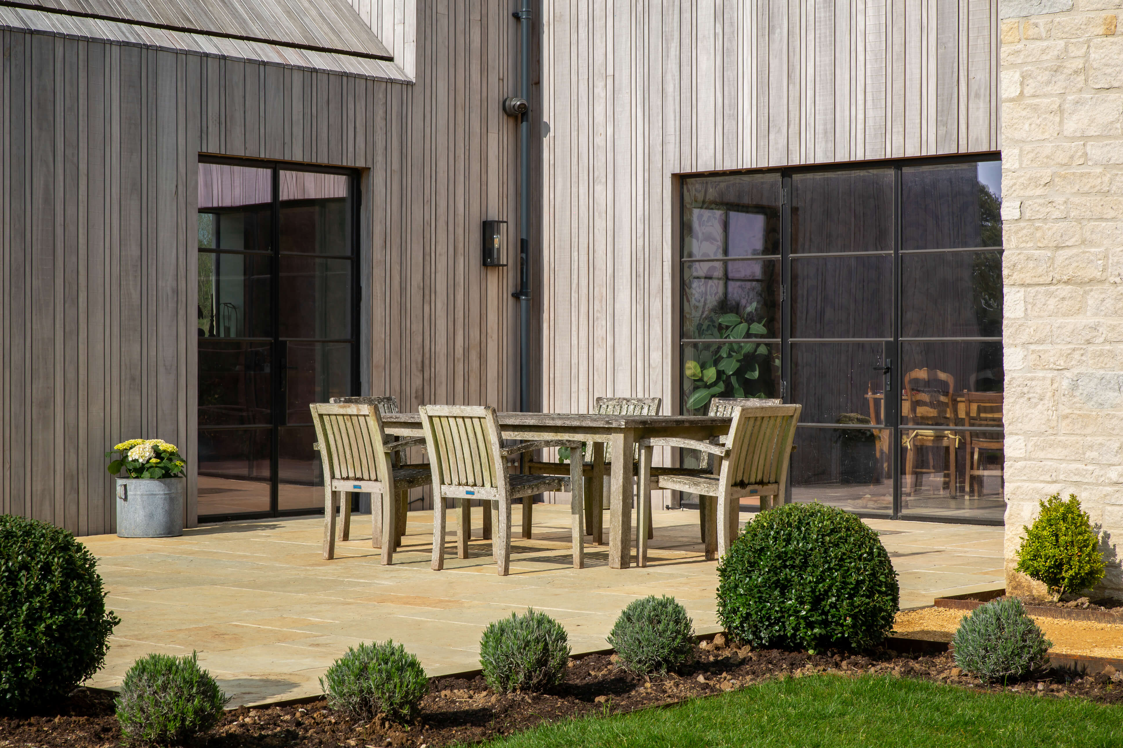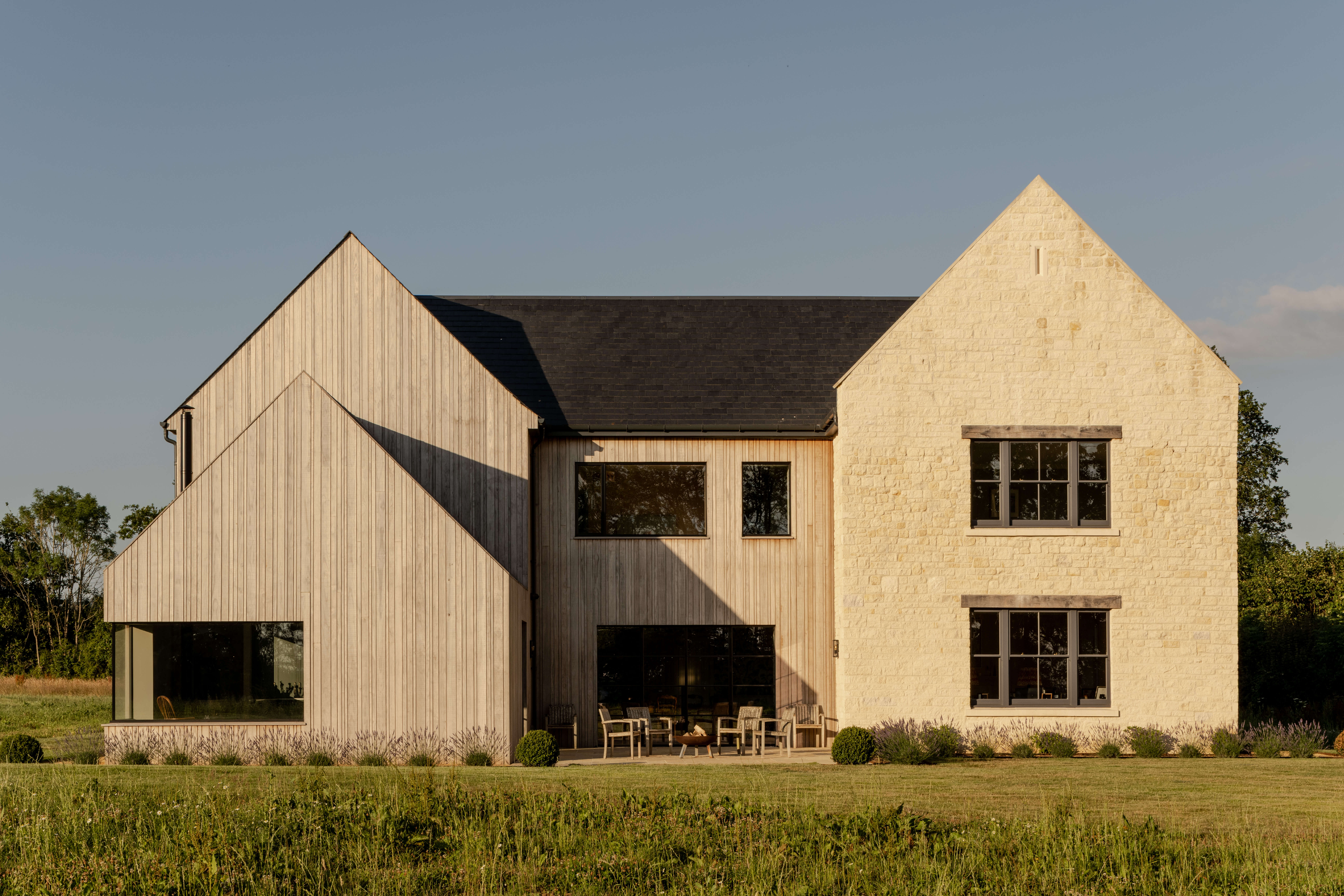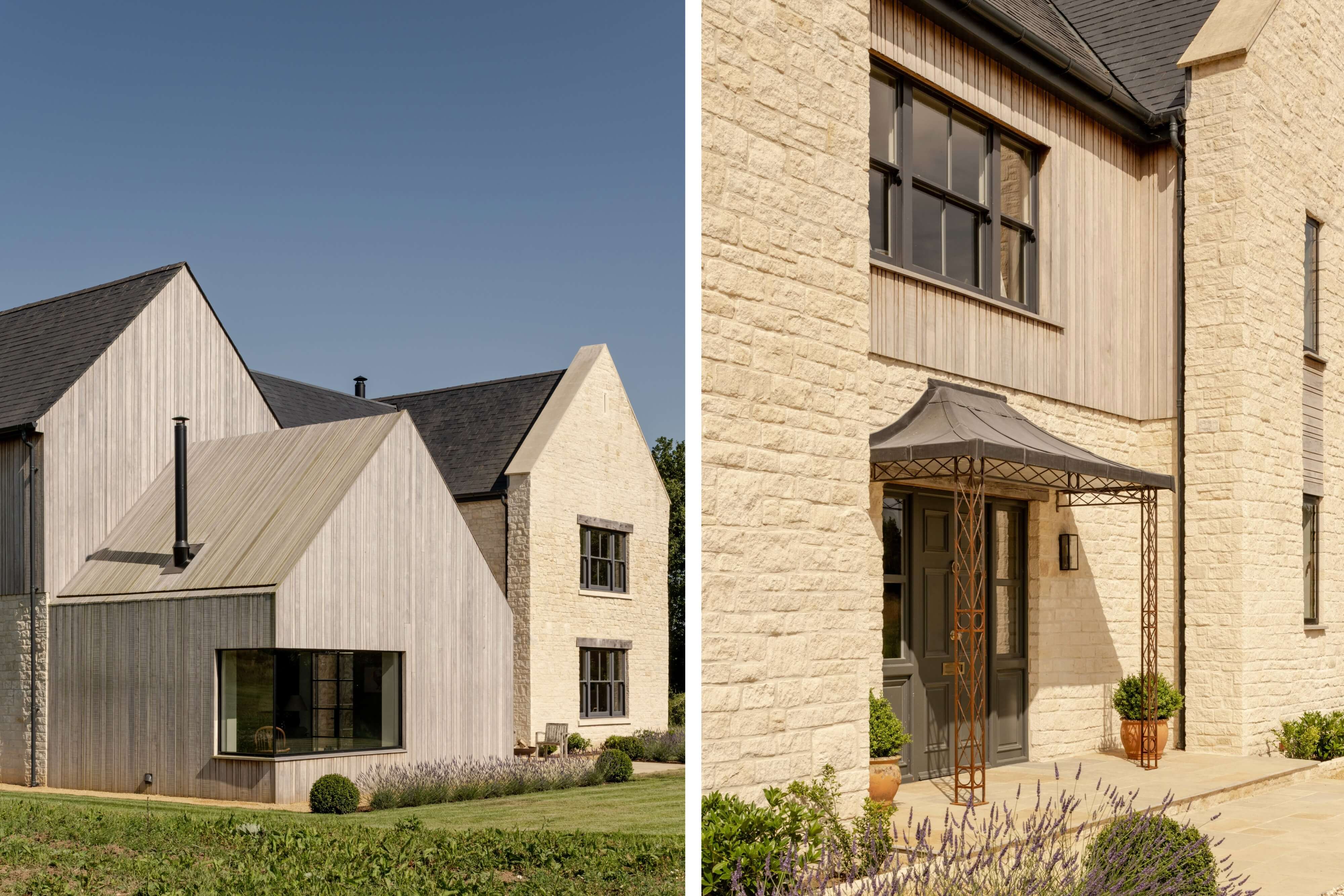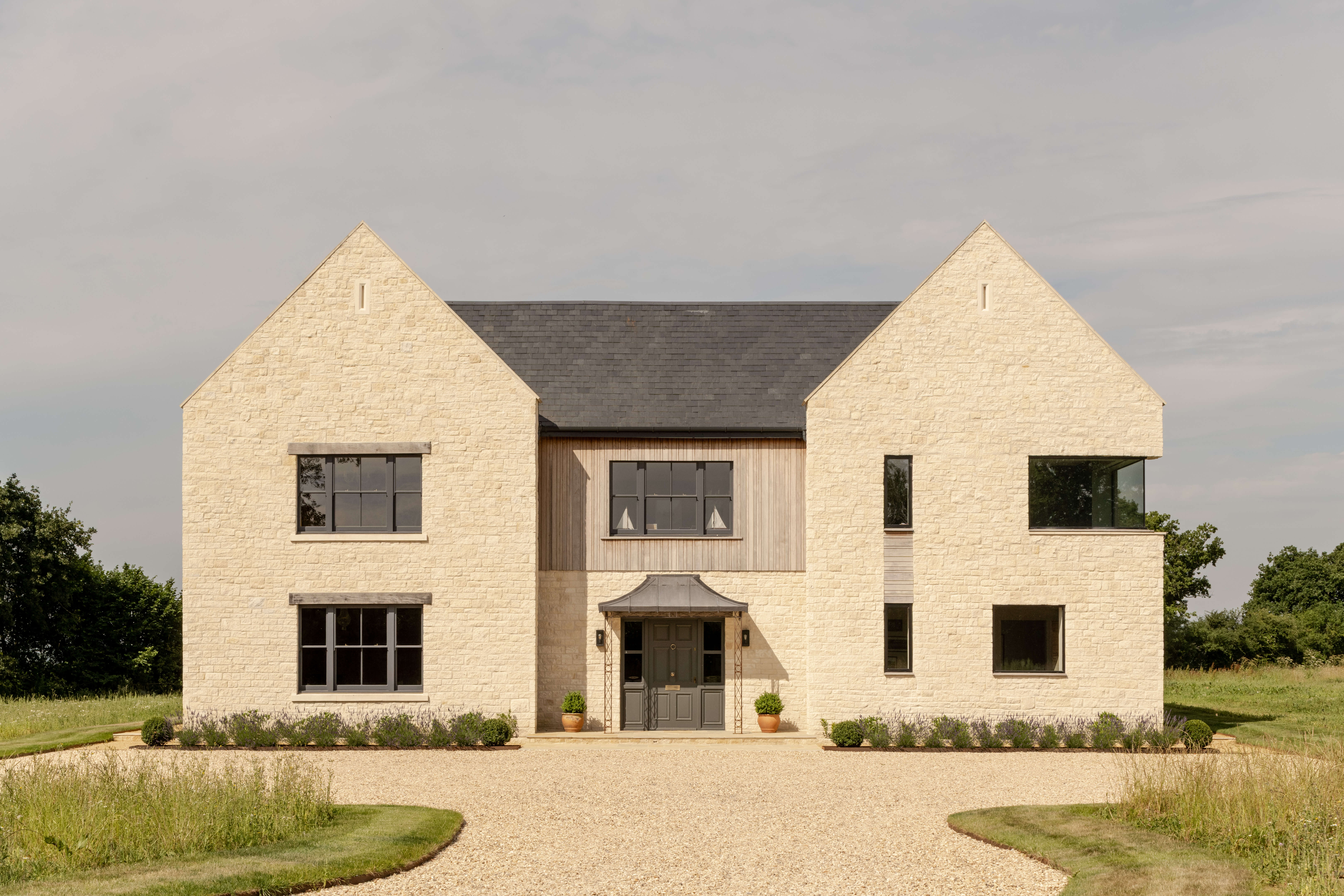Harefield Farmhouse extends to 4,777 sq ft and balances classical Georgian rhythm with modern light and space. The house is built from locally quarried Marnhull stone with timber cladding and an elegant iron and lead roofed porch marking the entrance. A thoughtful mix of natural materials and different window styles — traditional timber sash and Crittall alongside contemporary frameless glass — gives the architecture both depth and variety. The result is a timeless country house, at once rooted in tradition and refreshingly modern.