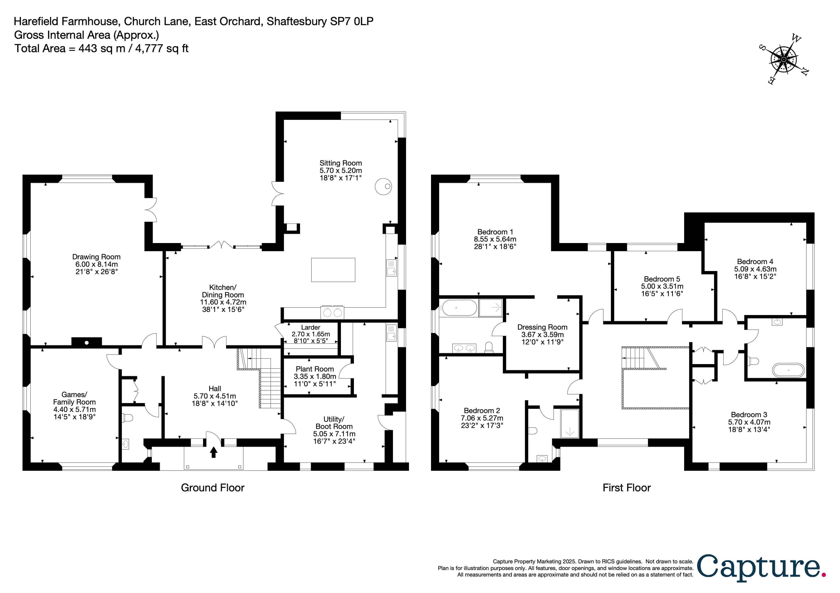 Designed for the realities of country and family life, a large open-plan boot and utility room with its own secondary entrance provides essential space for dogs, coats and muddy boots. Upstairs, five well-proportioned bedrooms and three bathrooms (two adjoining) include a principal bedroom with dressing room and adjoining bathroom. The roof has been engineered for future conversion, with services in place, offering scope for an additional 1,500 sq ft with dormer windows under permitted development.