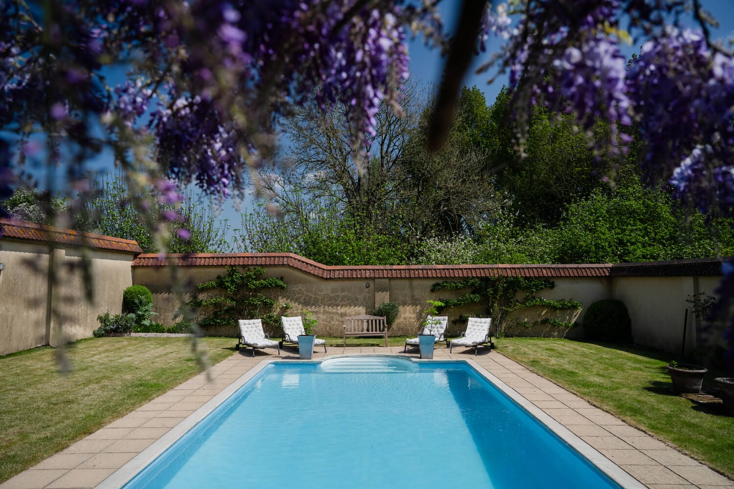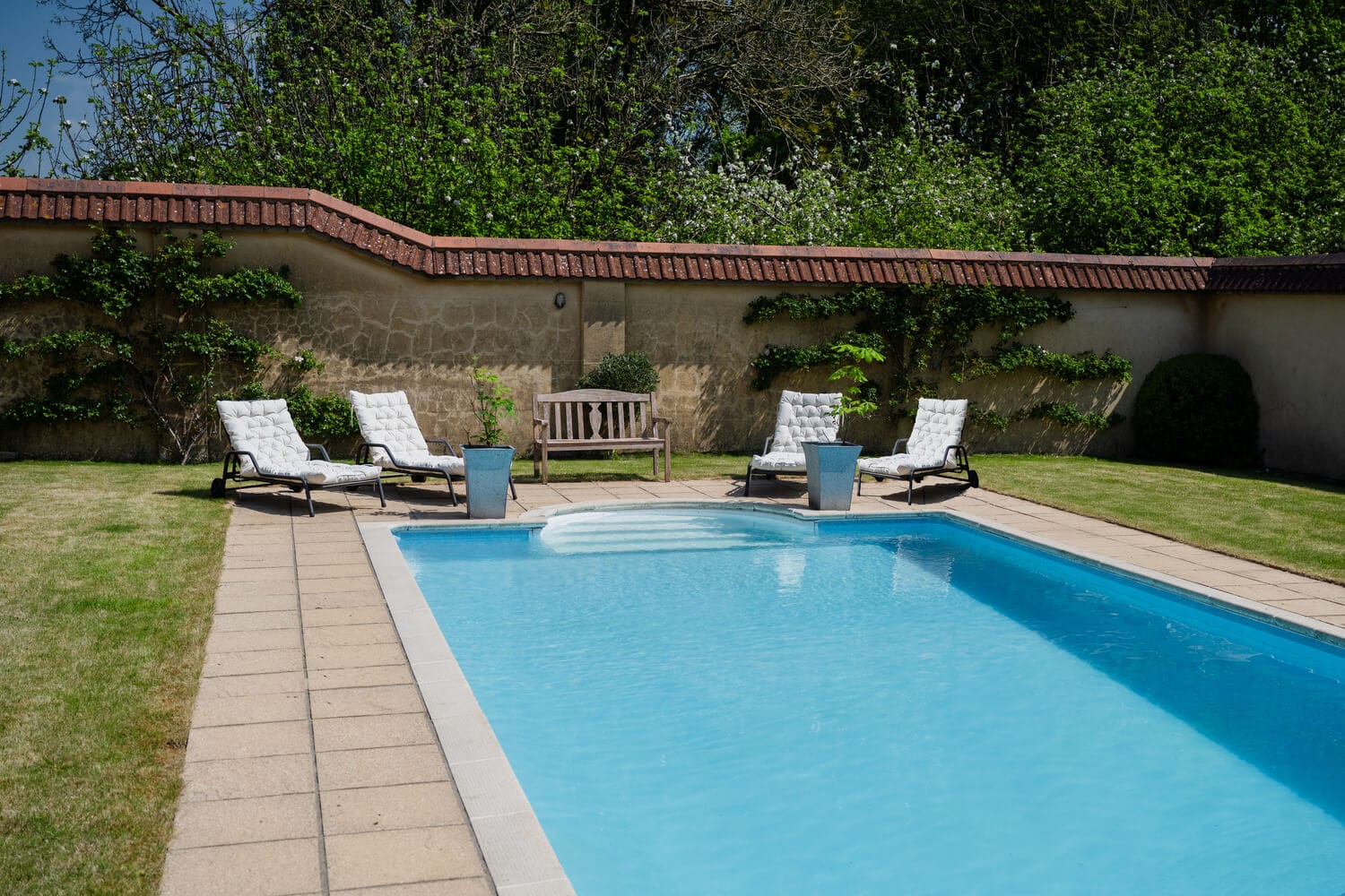 The kitchen garden is neatly laid out, with regimented beds lined with clipped box hedges, a generous brick-built potting shed and well-established soft fruit cage which provides an abundance of fruit in the summer and autumn. This leads to a beautifully converted walled pool area, once the original kitchen garden, now transformed into a peaceful suntrap with olive trees and climbing roses along the rendered brick walls. At the centre is a 30-foot outdoor swimming pool, heated by a cost-effective air source heat pump, ideal for extended seasonal use. A nearby changing room and pump house keep everything tidy and functional.