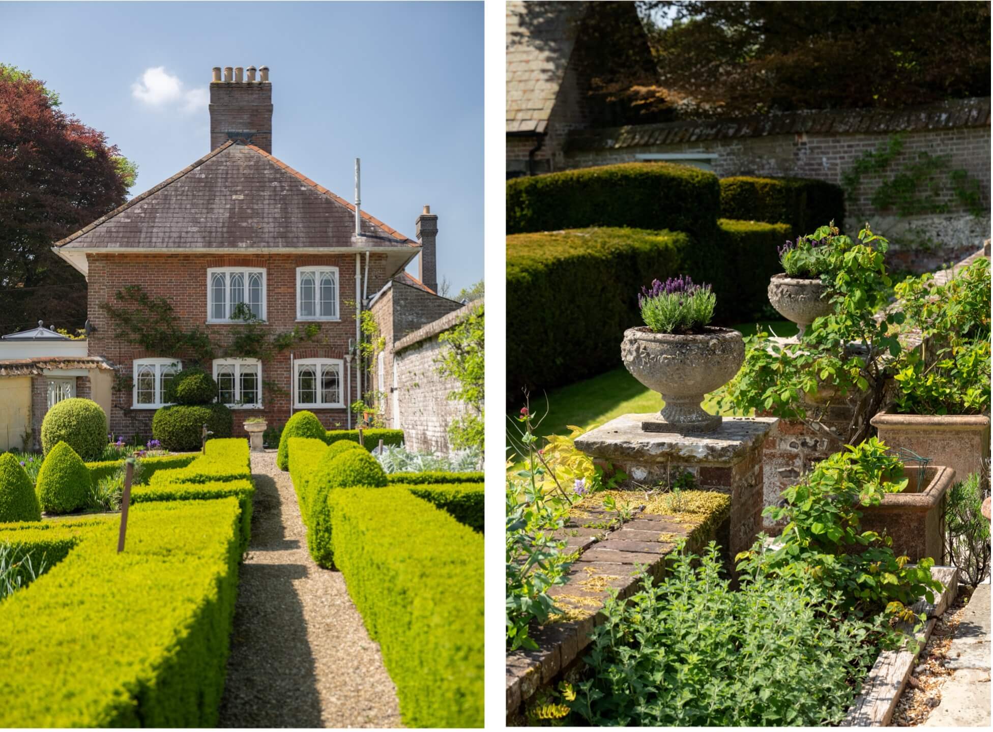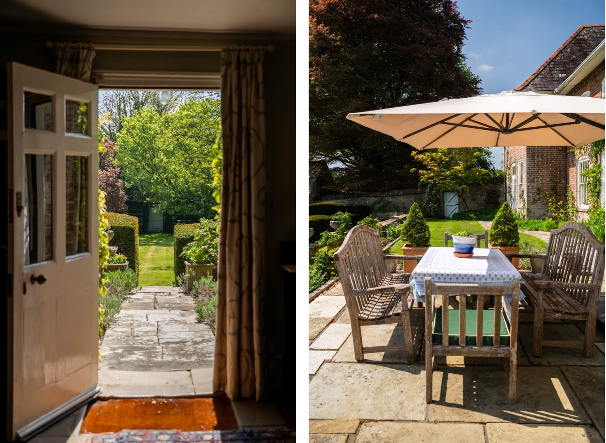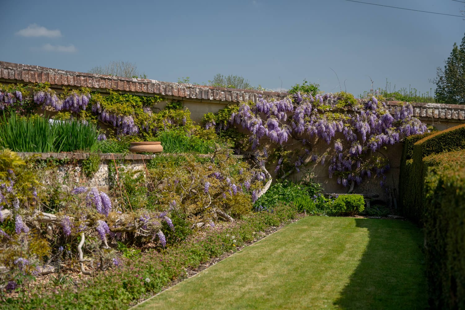 A recently laid terrace stretches along the South East side of the house with plenty of space for outdoor dining and entertaining in spring and summer. This overlooks the main area of formal garden which is smartly arranged, with tiered lawns connected by a pathway of flagstone steps. Brick and flint walls, herbaceous borders, and clipped yew hedging bringing both colour and structure to the space which also has a charming brick gazebo and an old stone water trough. This area of the garden is well-sheltered as it is walled on three sides, with a mature yew hedge at the bottom providing year-round greenery and privacy.