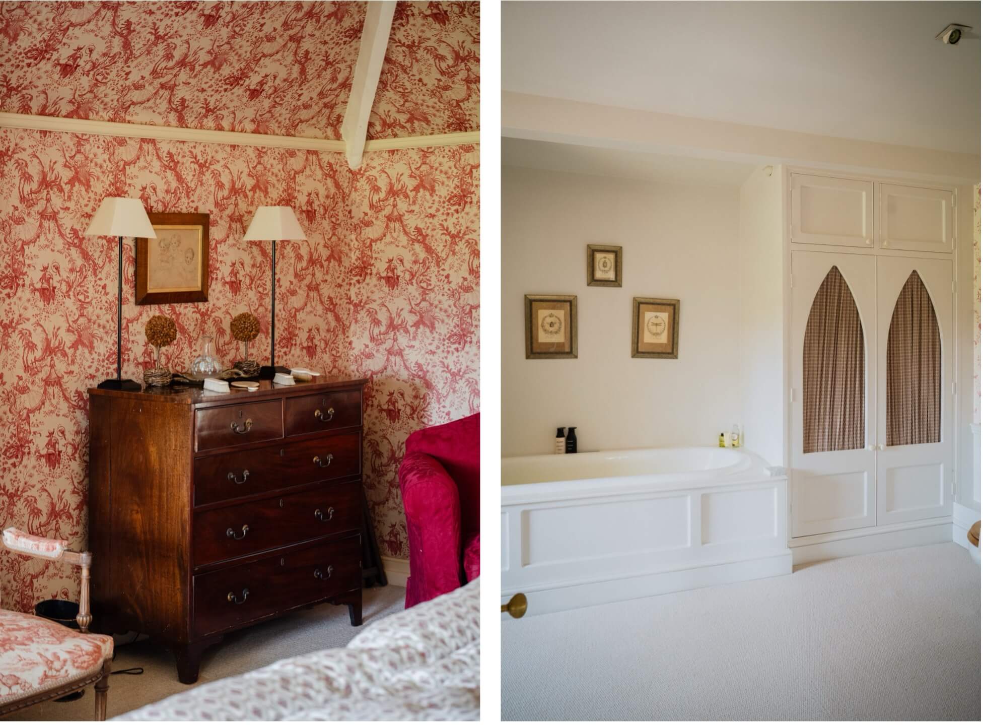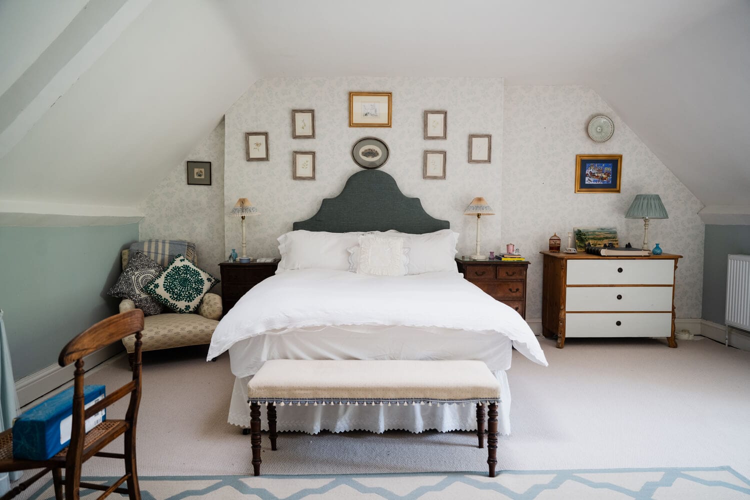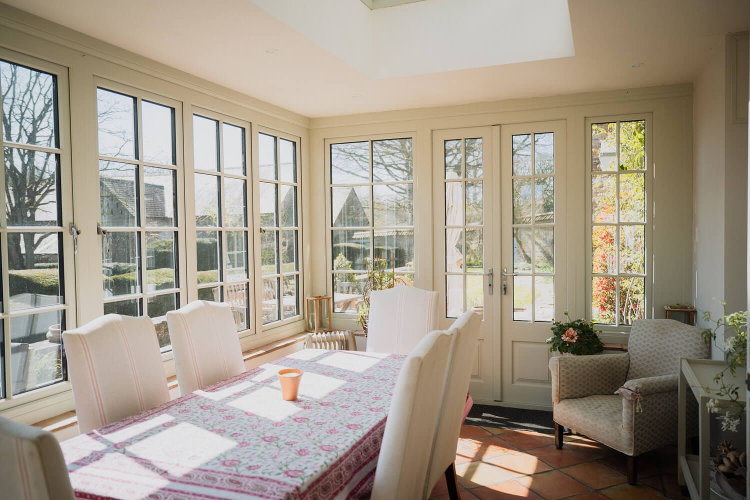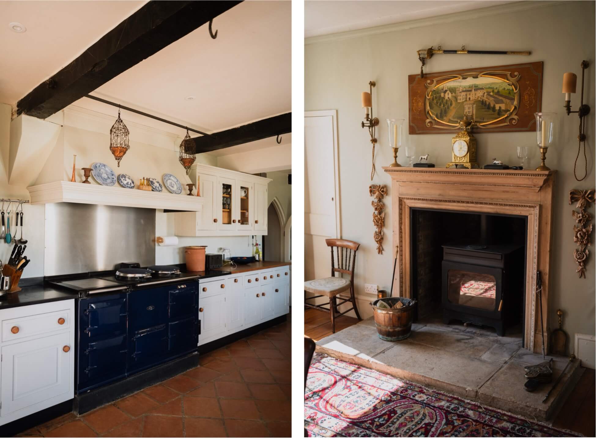An arched door leads into the bright and sociable family kitchen/breakfast room with fitted cabinetry, AGA and pretty tracery windows looking onto a walled garden. An adjoining garden room provides an excellent area for relaxed dining and provides a connection between the house and gardens. A larder, laundry room, utility, and boot room are sensibly arranged around a secondary hall next to the kitchen. The cloakroom/downstairs loo and butler’s pantry sit next to the front hall.