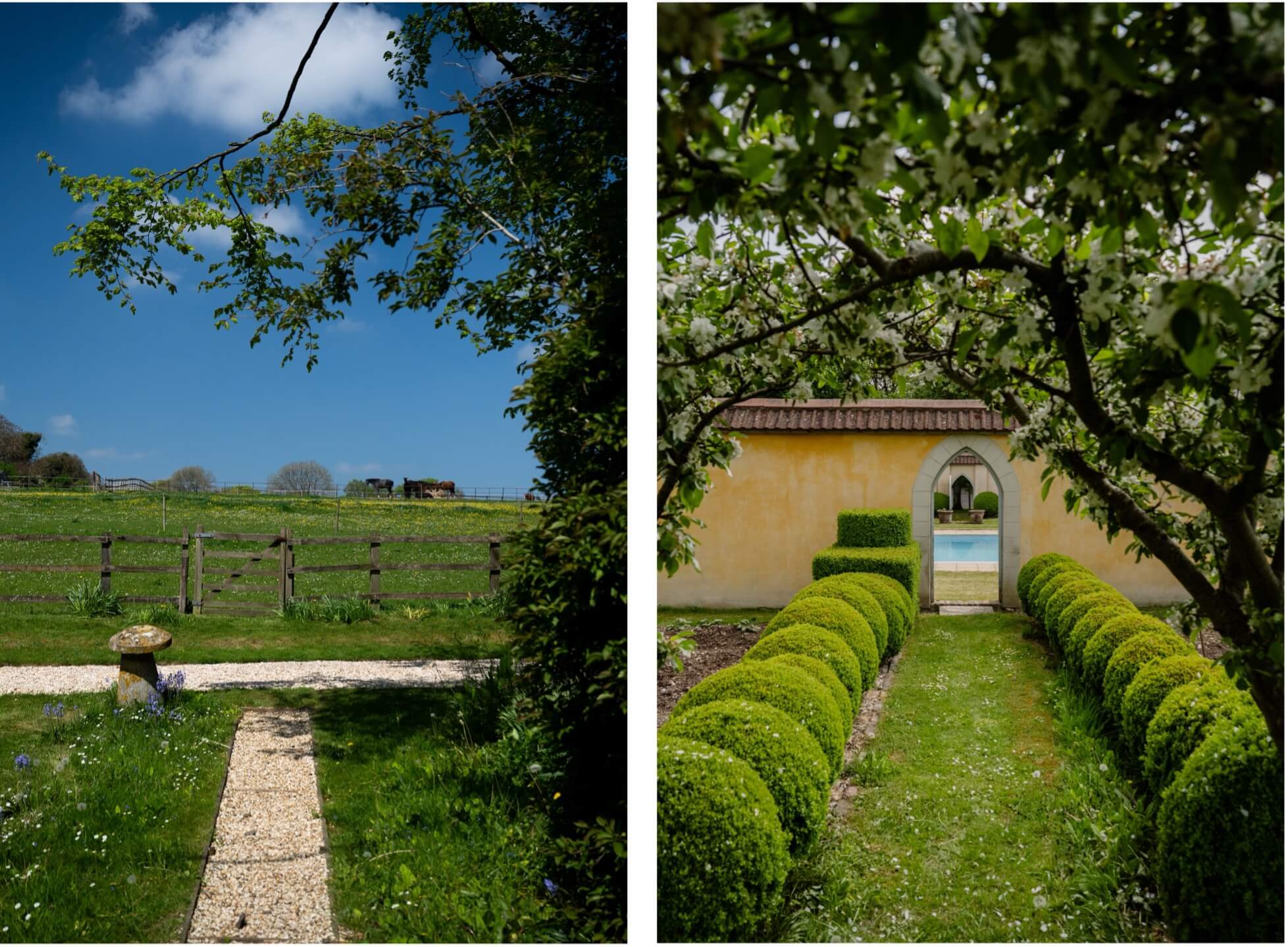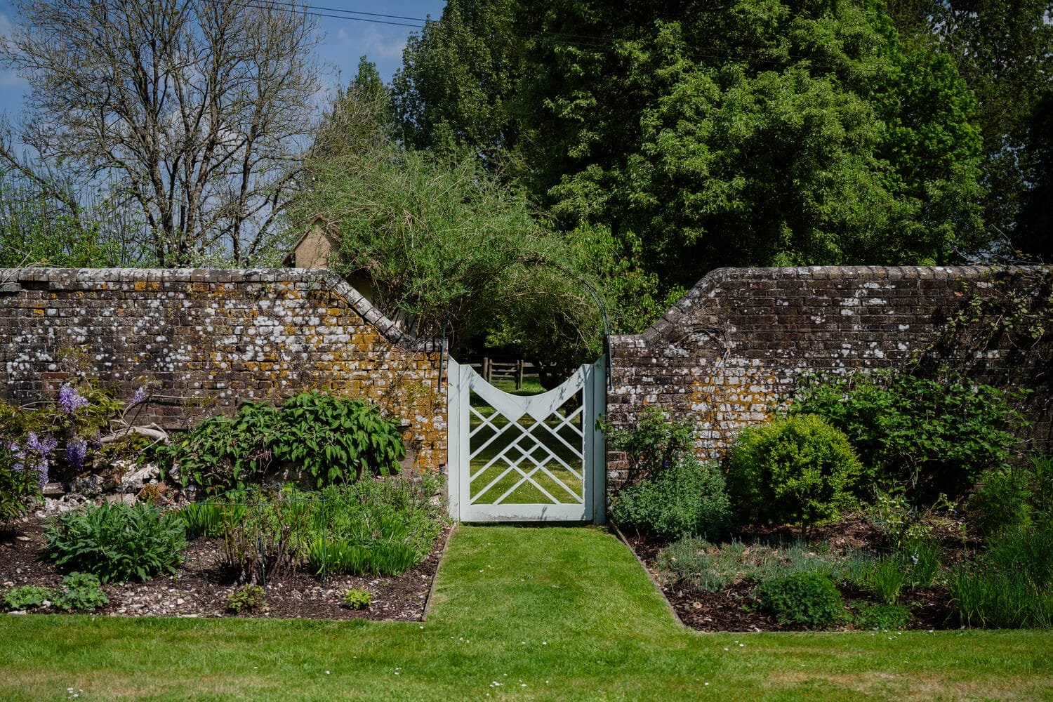 A number of mature trees, including both beech and copper beech, prunus, Tibetan cherry, Robinia and acer, add to the established feel of the garden, particularly near the drive. A pretty chinoiserie style garden gate leads through from the formal garden to the tennis court which is screened by a mature orchard with crab apple, fig, and neatly trained espaliered apple and pear trees with multiple varieties including cookers and eaters.