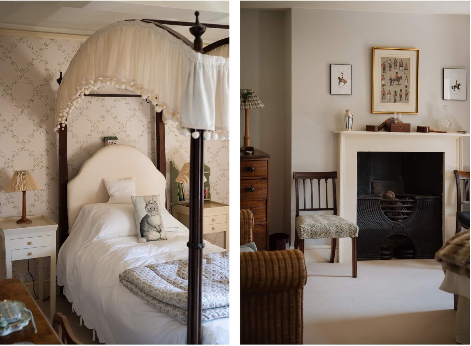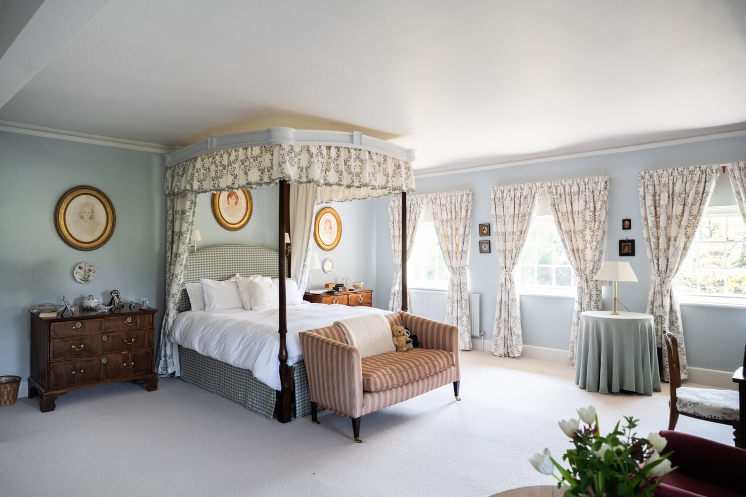 The large and lovely dual aspect principal bedroom is on the first floor with sunny outlook over the formal garden and an adjoining bathroom with pretty inbuilt storage cupboards. Four further double bedrooms (most with fireplaces) and two family bathrooms sit along the corridor. A sixth bedroom with its own landing and its own adjoining bathroom sits apart from the rest and currently serves as a guest bedroom, but would work very well as accommodation for a nanny, as it has a door link to the next door bedroom. There are also extensive linen/storage cupboards on this floor.