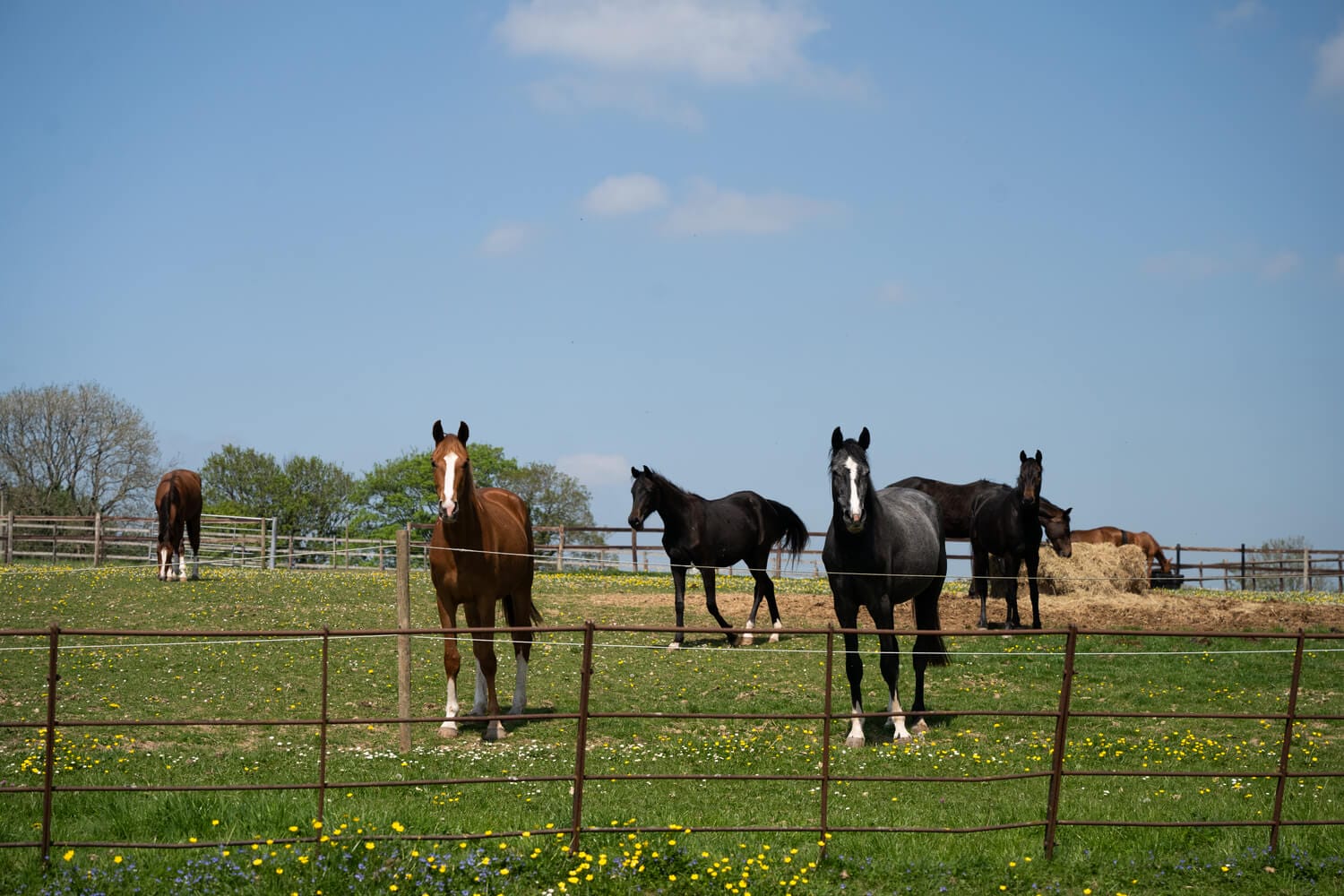 The wider grounds stretch predominantly to the north and east. This includes several paddocks, enclosed with post and rail and estate-style fencing, perfect for grazing. Two paddocks are equipped with double timber field shelters, and all benefit from a private water supply to troughs. The land is dotted with mature horse chestnut and walnut trees, giving good natural shelter and visual appeal.