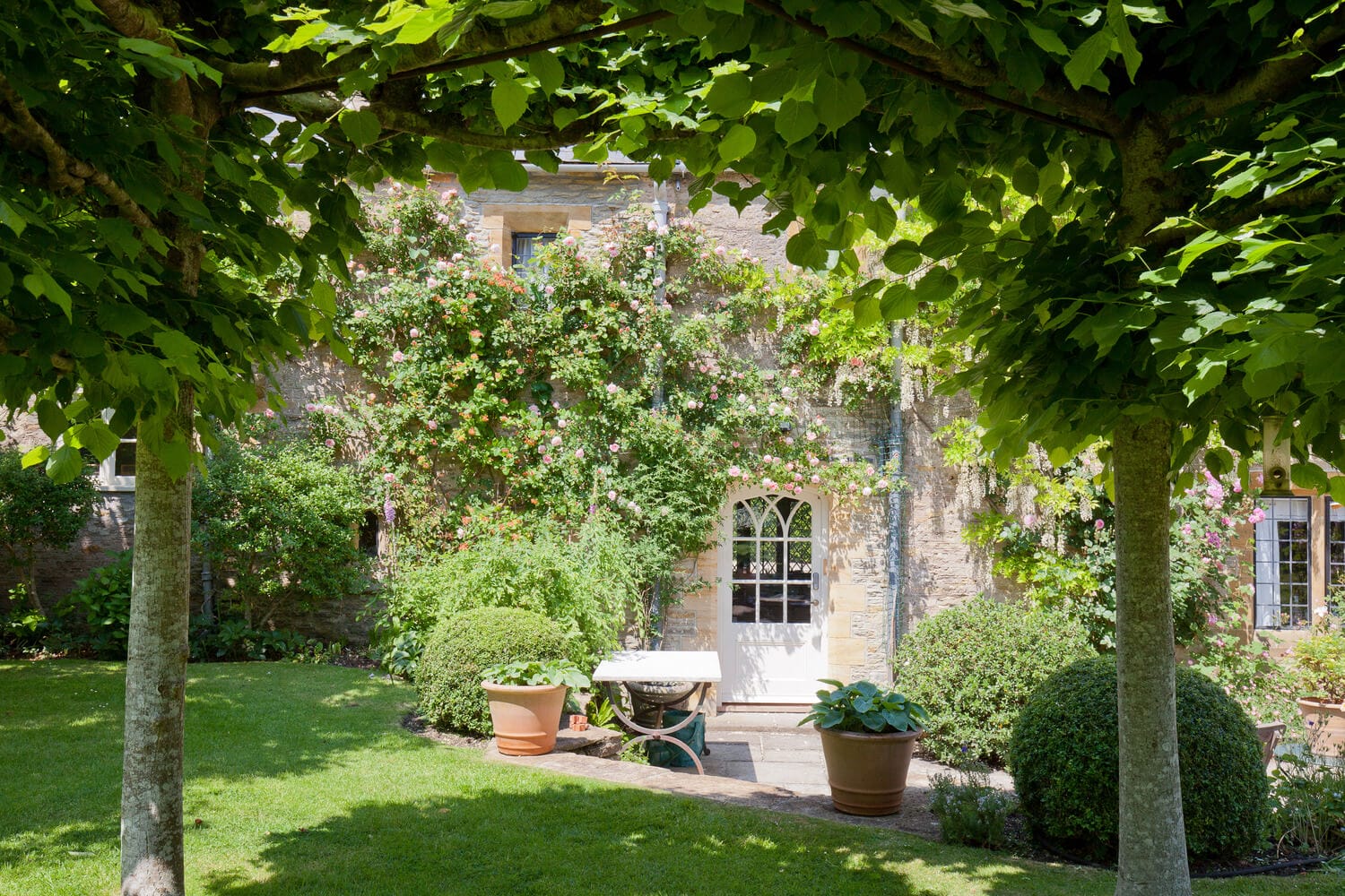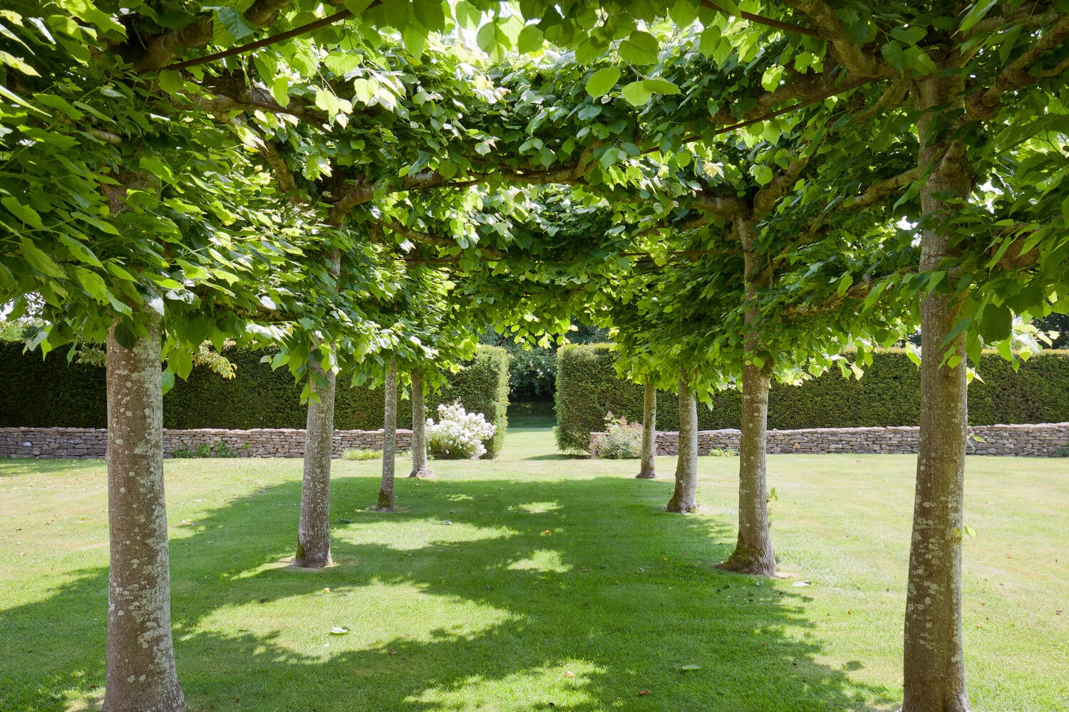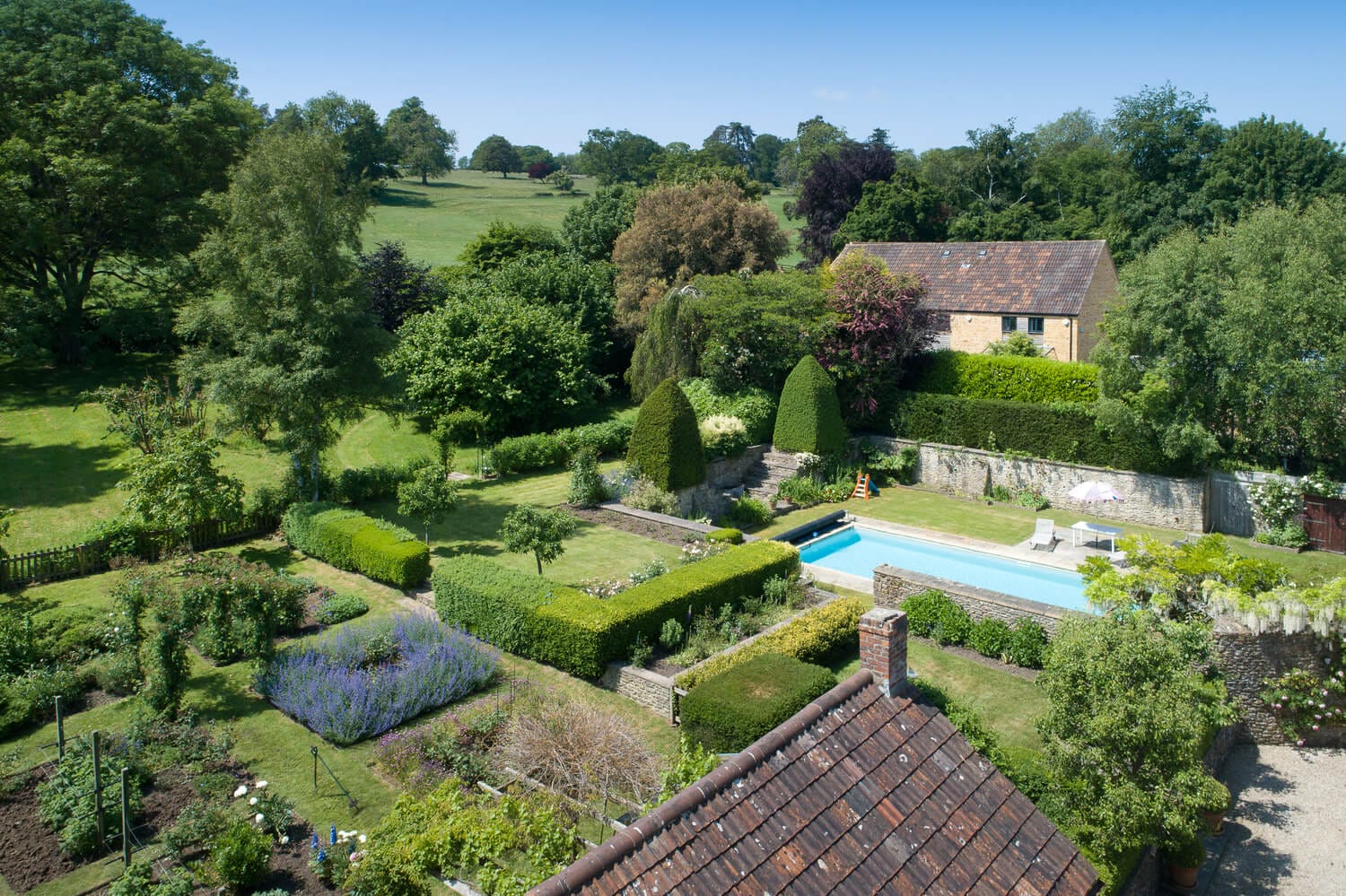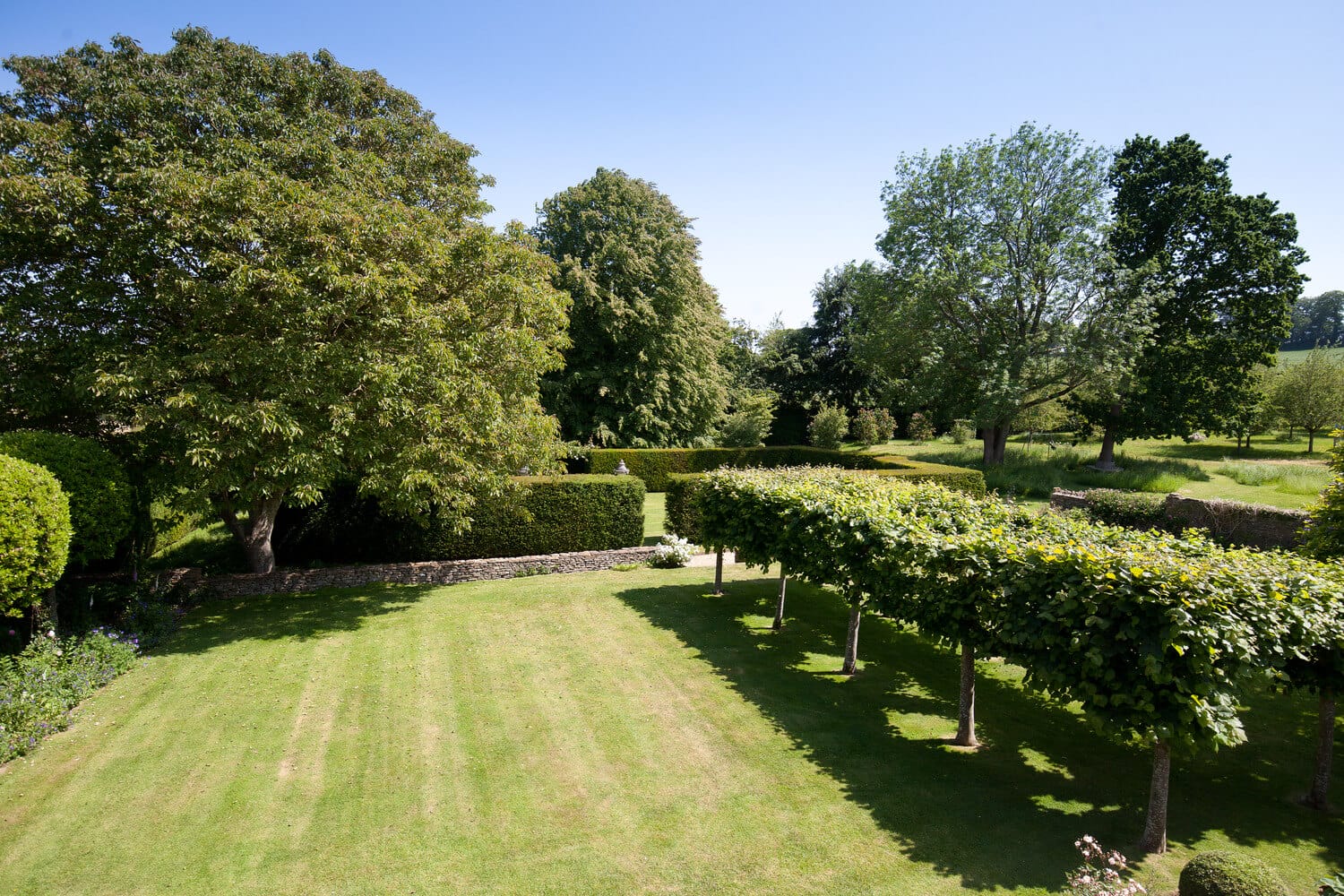 The main formal garden lying to the rear of the house is covered in an elegant white wisteria. A large stone terrace is flanked by rose bushes with plenty of outdoor dining terrace for summer entertaining. The whole garden has been thoughtfully laid out with ample lawns, smart clipped Ilex trees, and yew, beech and hornbeam hedges bringing symmetry and structure. An avenue of pleached lime trees draws the eye to the orchard beyond the formal garden created in a paddock previously used for grazing cattle.