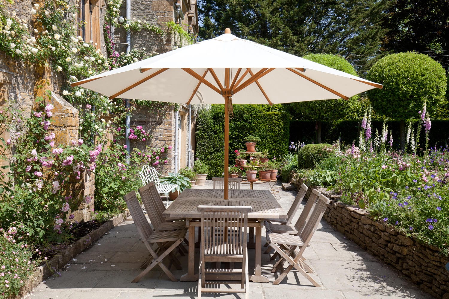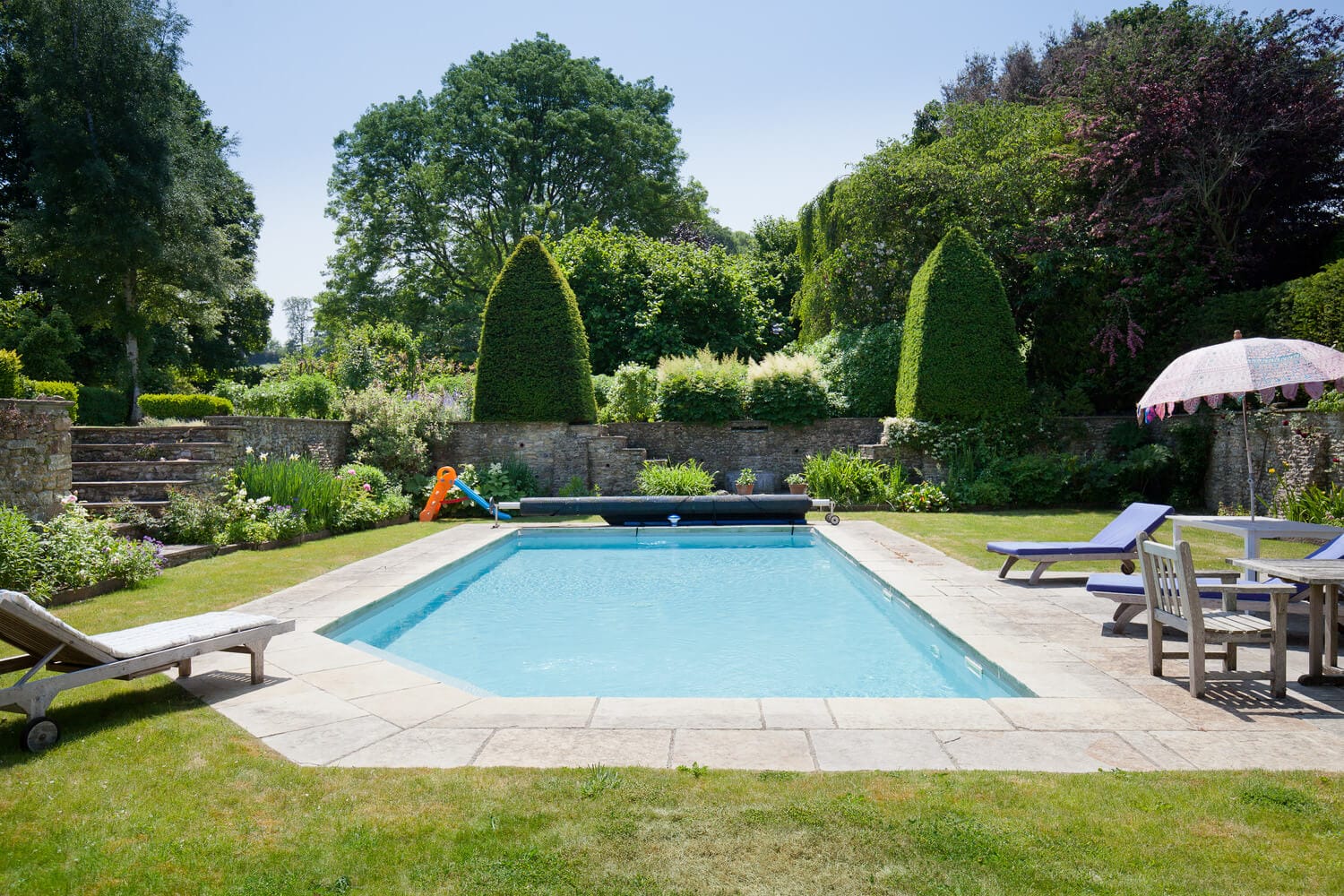 A smart outdoor swimming pool with further outdoor dining space is located on the southern side of the garden in its own drystone wall lined garden.