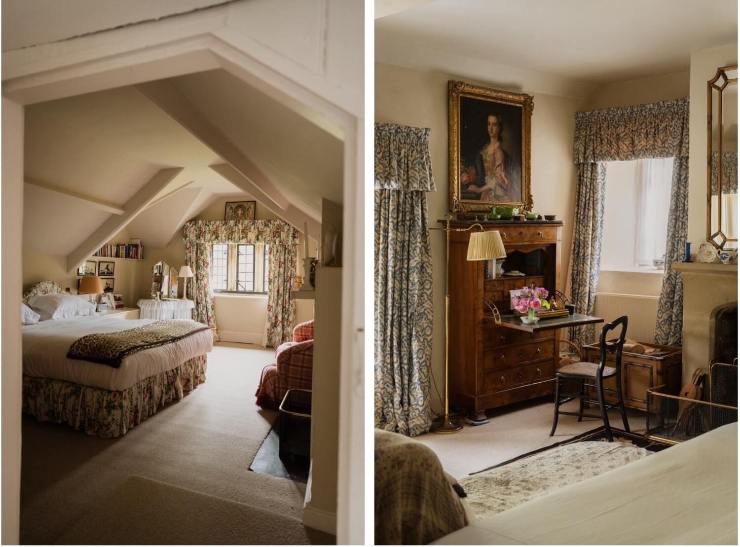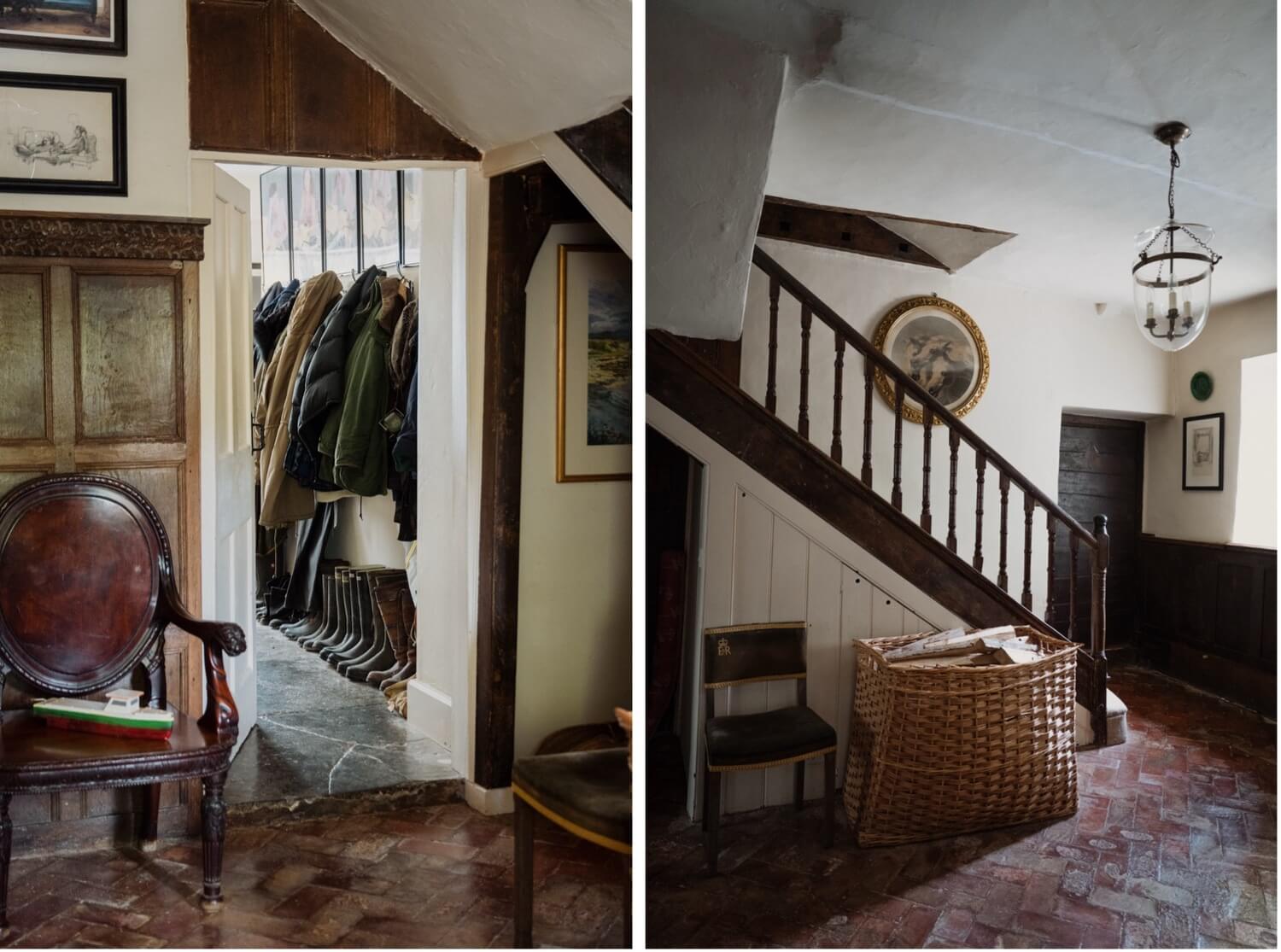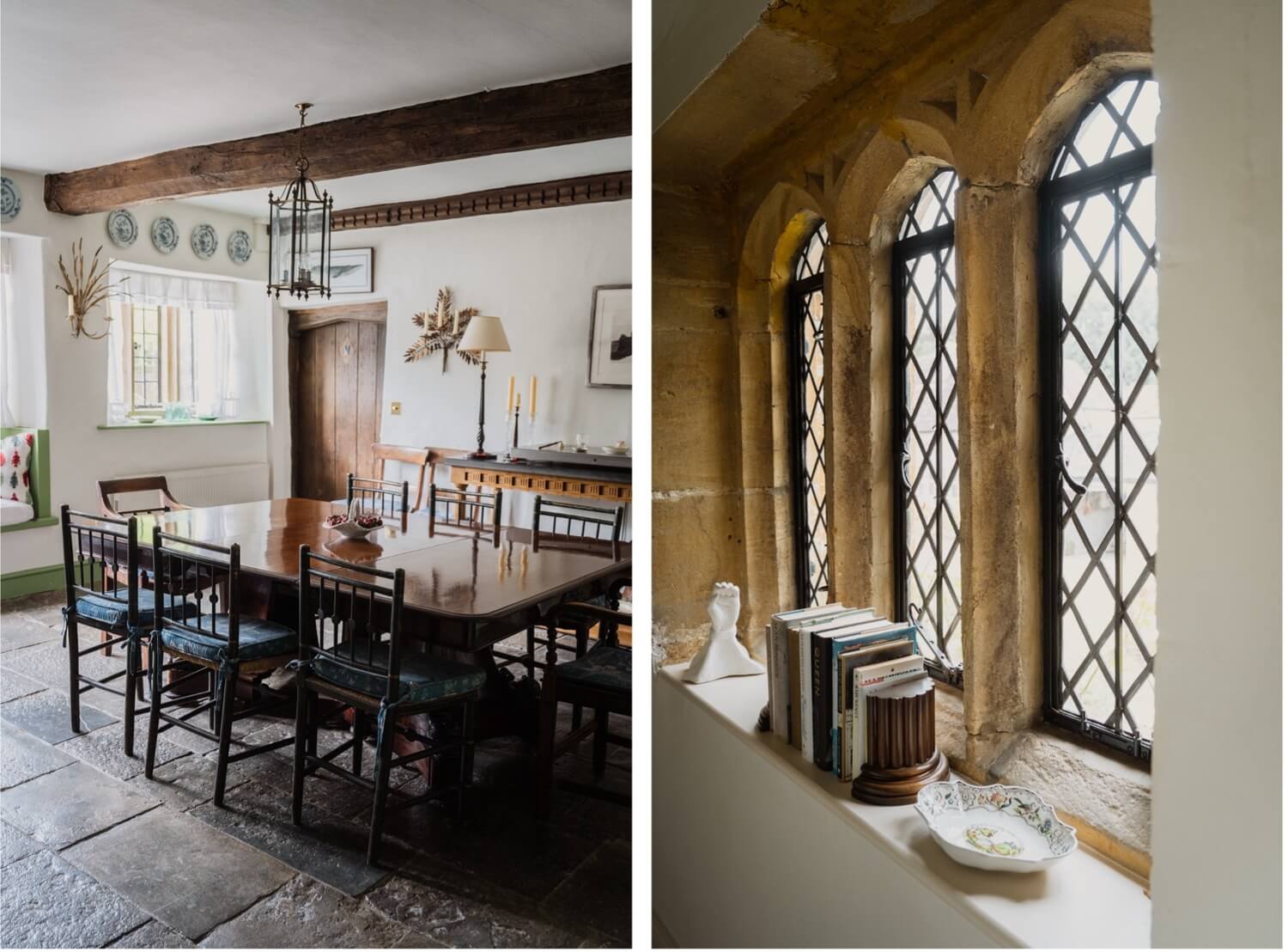 The front hall leads through into the large open kitchen dining room. The kitchen with its huge original beams and Blue Lias flagstone floor overlooks the garden and includes an AGA, a walk-in pantry, and fitted cabinetry painted in Edward Bulmer Invisible Green. This part of the house previously formed a courtyard and still retains a pretty internal lancet window which peeps into the larder. The other end of the room houses a large dining table with plenty of space to entertain family and friends, as well as a huge Tudor fireplace with open fire and deep window seats set into the painted panelled wall.