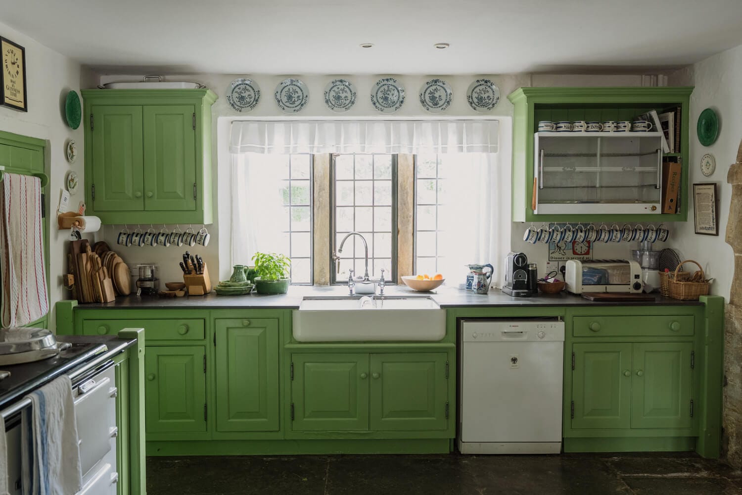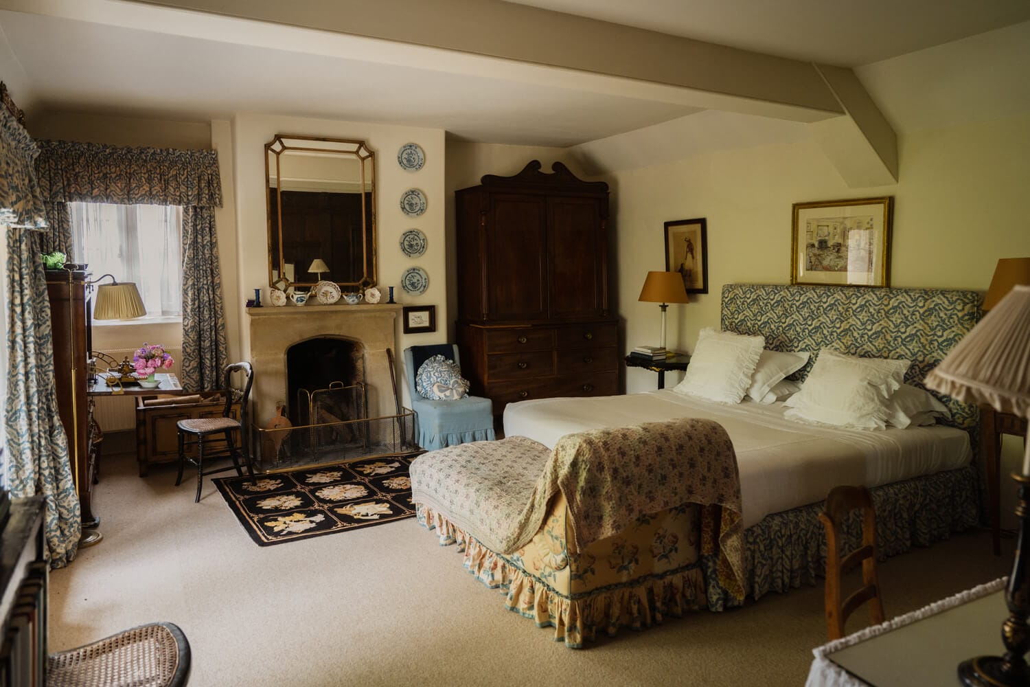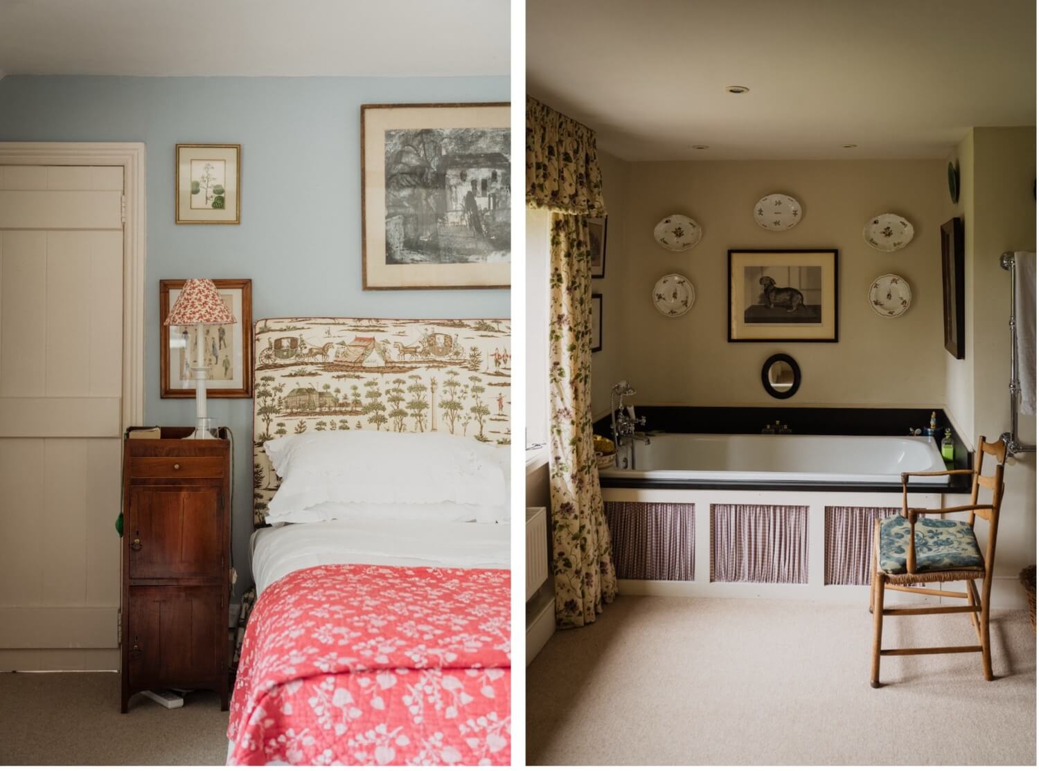 The front hall leads through into the large open kitchen dining room. The kitchen with its huge original beams and Blue Lias flagstone floor overlooks the garden and includes an AGA, a walk-in pantry, and fitted cabinetry painted in Edward Bulmer Invisible Green. This part of the house previously formed a courtyard and still retains a pretty internal lancet window which peeps into the larder. The other end of the room houses a large dining table with plenty of space to entertain family and friends, as well as a huge Tudor fireplace with open fire and deep window seats set into the painted panelled wall.