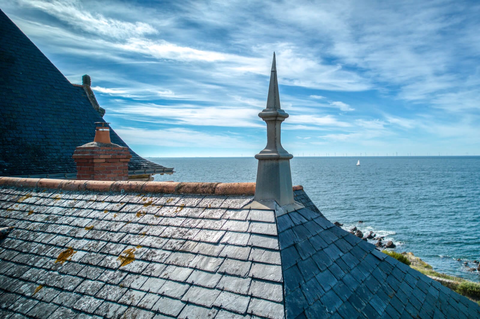 Along the coastal road, a picket gate, framed by two granite pillars, opens onto a breath-taking view of the villa with the ocean in the background. Behind the gravel courtyard, large enough to park several vehicles, the dwelling stands in the middle of the property, surrounded by the garden and the sea. Near the gate is an inhabitable two-storey outbuilding, while the villa itself was built over two separate periods: its western section dates back to the middle of the 19th century and includes two floors, one of which is under the eaves, while later on, around 1900, the building was flanked to the east by a slightly larger, but considerably taller, extension with three storeys, including one under the eaves. Built out of rubble stone and covered in light-colour plaster, the villa’s corners are highlighted by toothed ashlar stone quoins, while its symmetrical windows are also framed by ashlar stone and topped with chiselled granite lintels. Topped with a gently sloping hipped roof over the initial construction, which is cadenced on either side by two gable dormer windows, whose wooden structures, decorated with understated mouldings, are painted white, its newer and larger section, crowned with a steeper hipped roof, features roof finials and dormer windows with granite triangular pediments on three of its four sides. These stone dormers, larger in size, not only highlight the extension’s verticality, but give it the look of a tower as well, which emphasises its role as an architectural centrepiece within the villa’s overall composition.