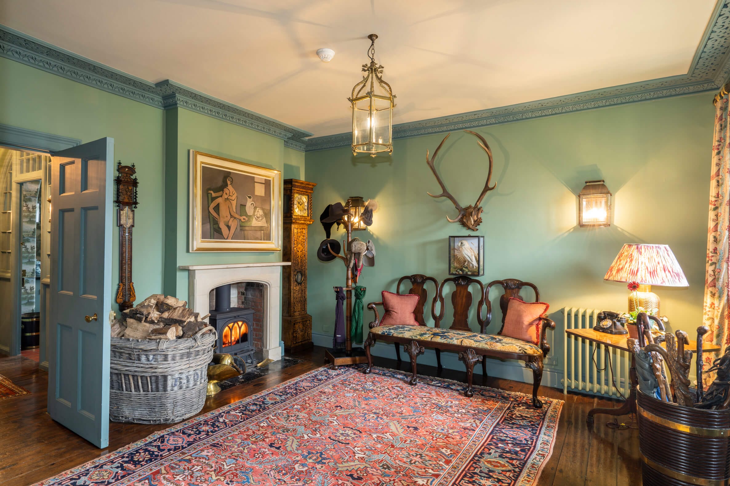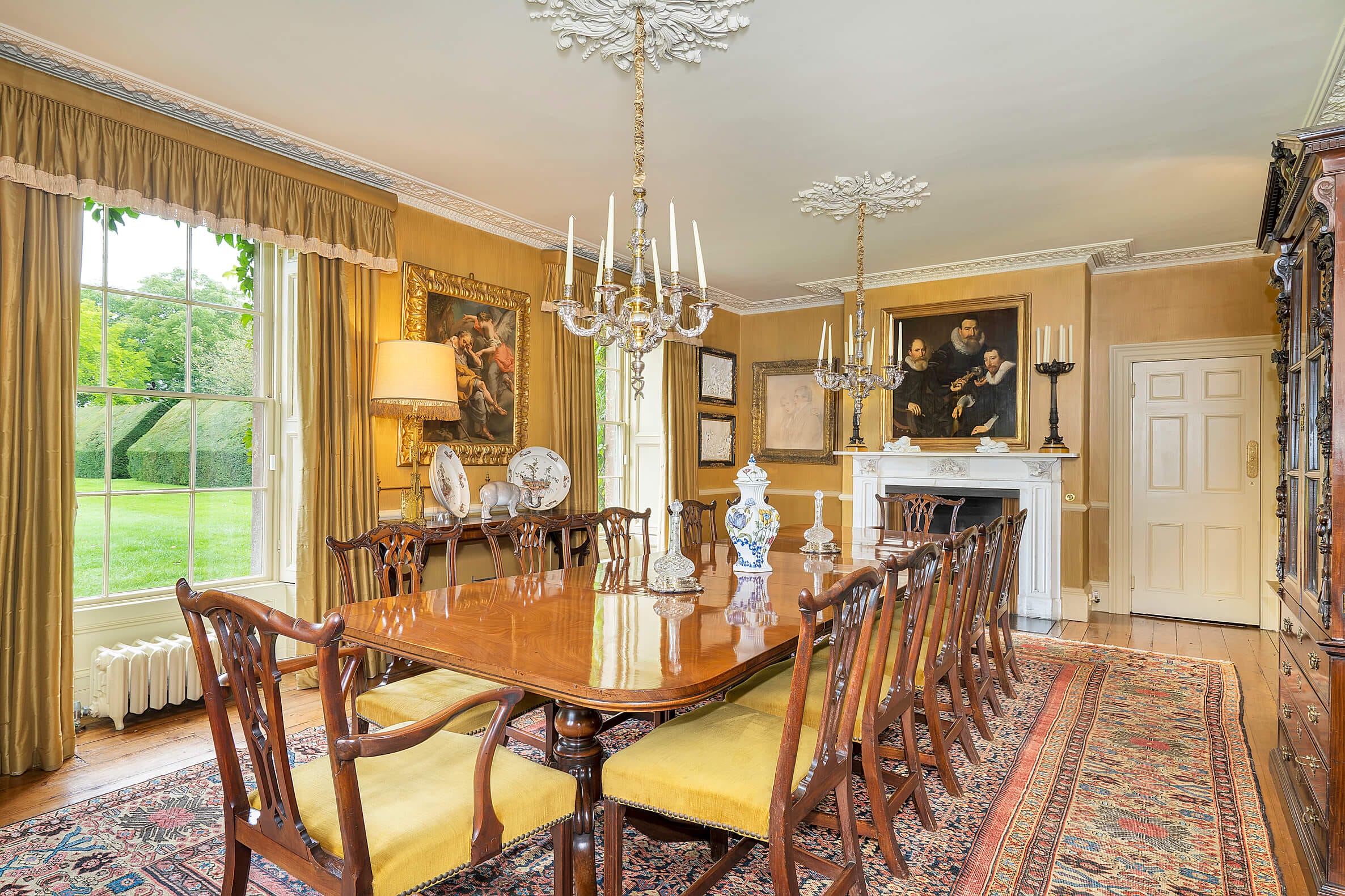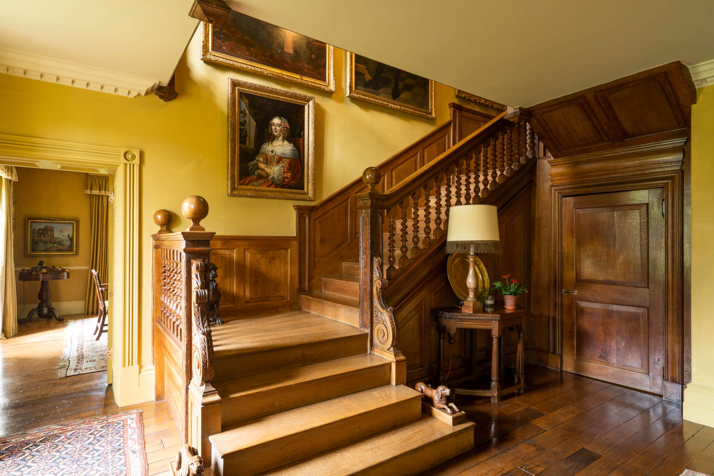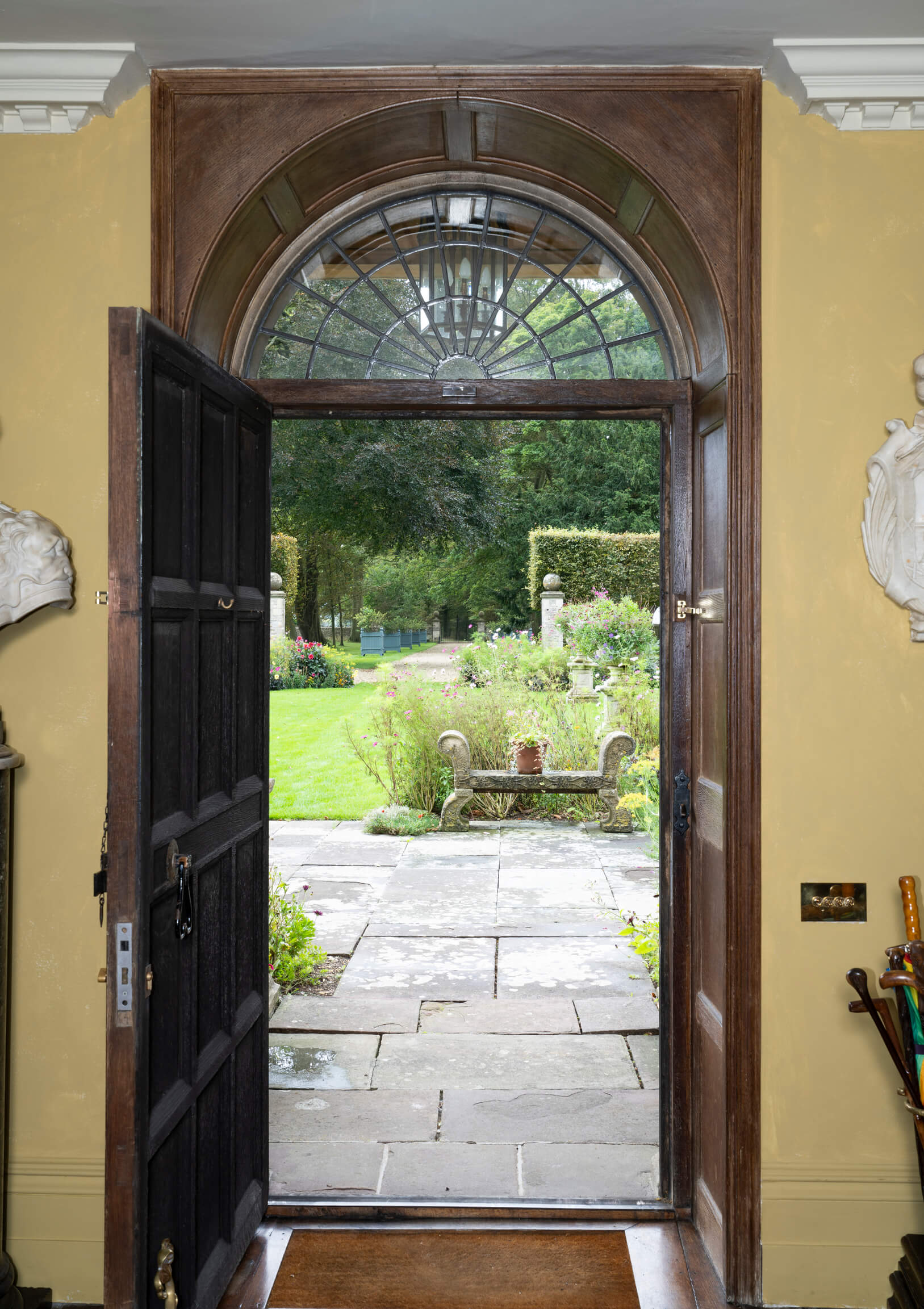 The house is approached through fine gates with ball capped stone piers, past the lodge and along a half mile long avenue of beech and lime trees. The drive ends, just short of the house, by a grass forecourt leading to an elaborate stone porch with pillars and moulding. This leads to the panelled front door with fanlight window above.