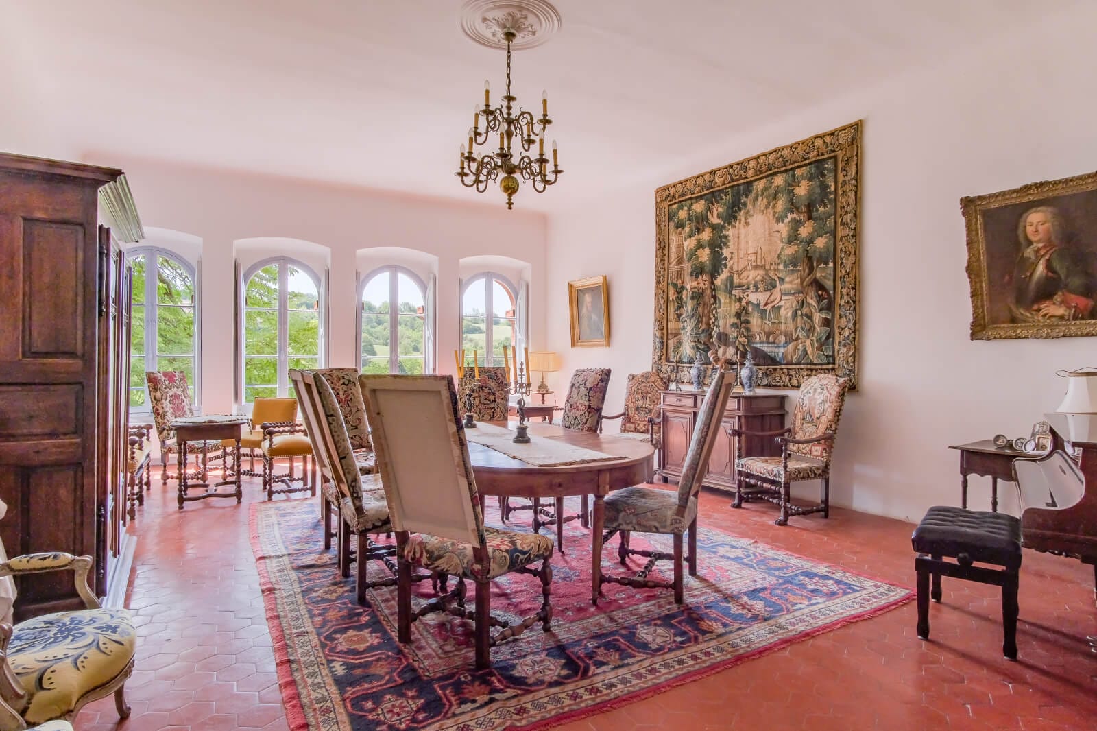 A raised driveway bordered by hedges leads from the village to the estate. A wide wrought iron gate, framed by two masonry pilasters and topped by an interlaced decorative motif, marks the entrance to the property. The terrace in the upper part of the estate reveals a succession of buildings and the long eastern facade, as well magnificent views towards the valley in the distance. The scent of boxwood and roses wafts across the landscape, while the sound of trickling water can be heard in the moat below. Built in the 17th century and enlarged in the 18th century following the main stylistic principles of classical Provence architecture, the building was extensively altered in the 19th century with the addition of a corner tower and an aviary, giving it its current castle-like appearance. The various parts of the edifice, which have survived the centuries, thus present a unique appearance, somewhere between a bastide (Provence farmhouse) and a chateau.