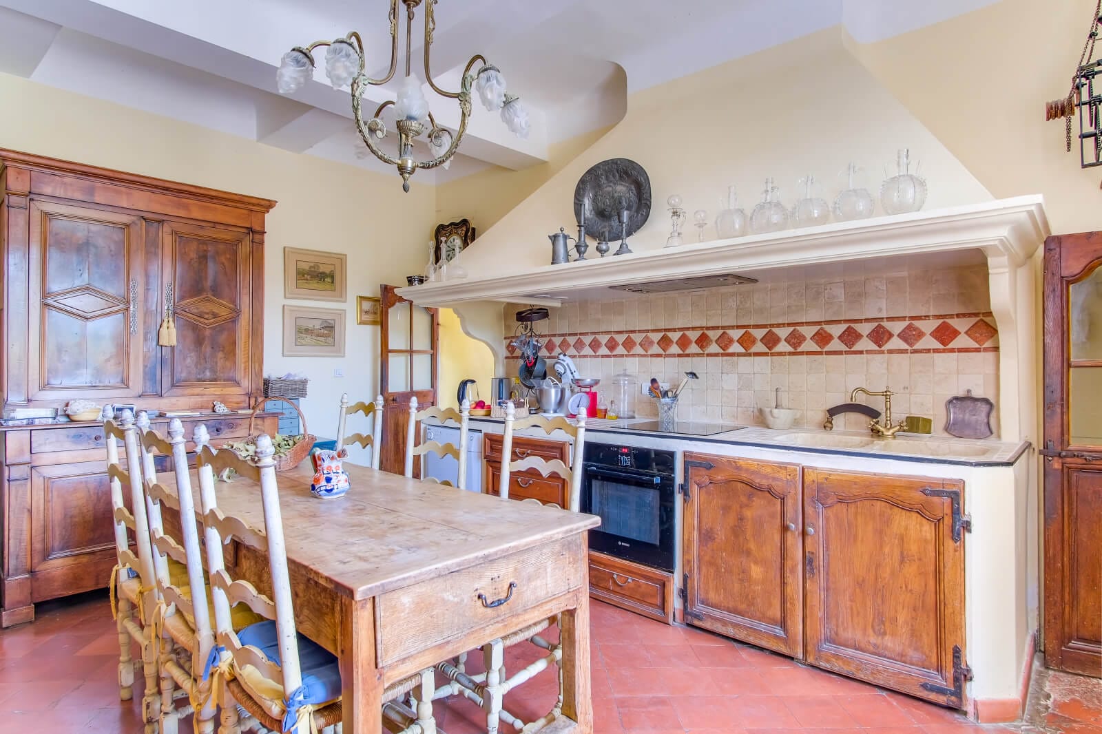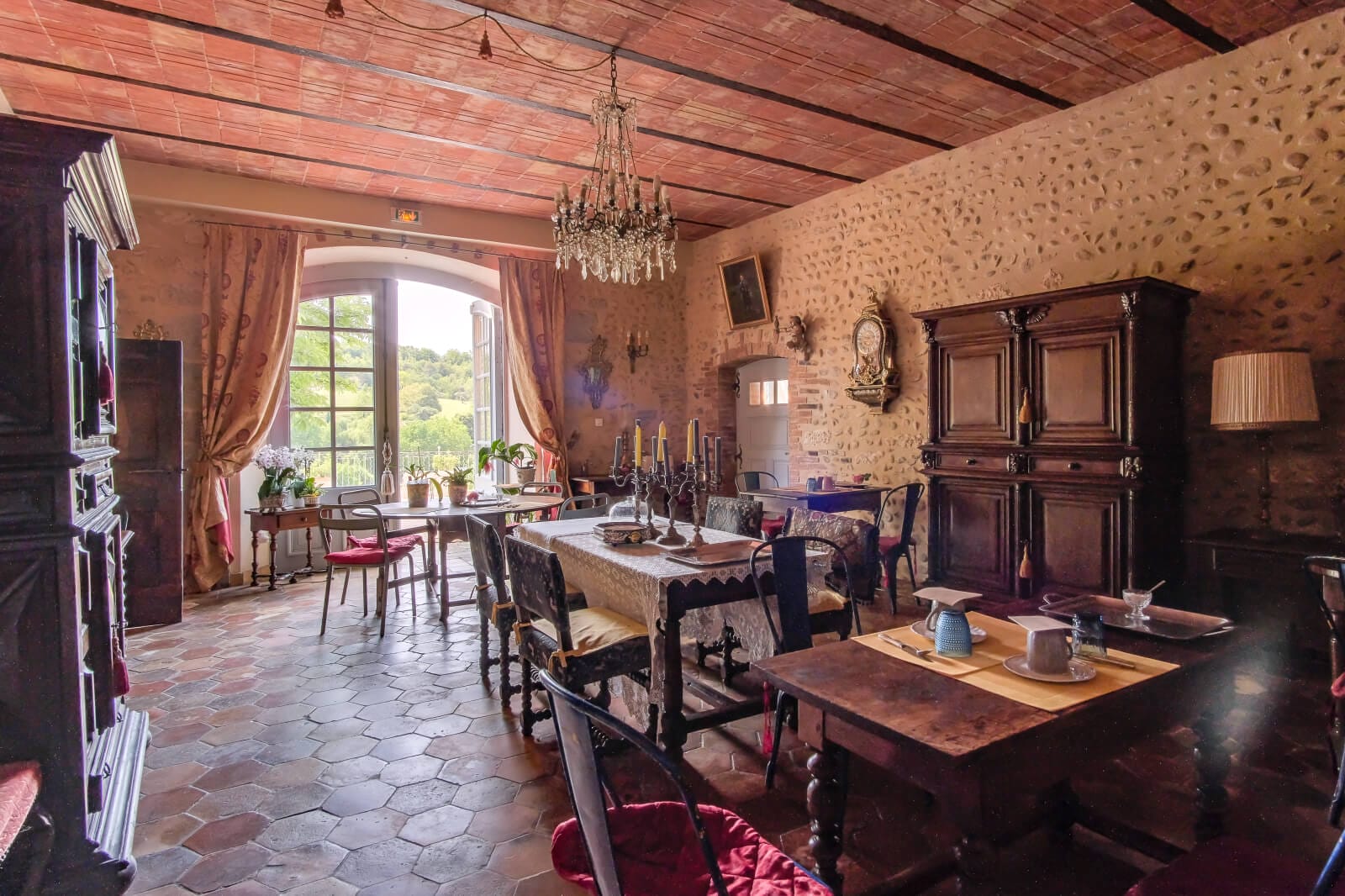 A large double-leaf wooden door, topped by a glazed fanlight, leads into the chateau. It opens onto a hallway with multicoloured hexagonal terracotta floor tiles, faux marble walls and a painted sky with botanical motifs on the ceiling. This leads to the main staircase with terracotta tiled steps, wooden nosing and a wrought iron banister. On the split-level landing, there is an ornamental marble fountain. On the south side, a double wooden door leads to a sitting room with a large wooden window opening on to the terrace and its chestnut tree. Its grey marble fireplace, decorative ceiling mouldings and cement tiles illustrate the chateau’s eclectic style. Continuing through, a passageway leads to a dining room with a terracotta-tiled floor, lime-grouted exposed stone walls and a brick ceiling with iron girders. On the other side of the hallway is the kitchen with a dining area, a large plaster fireplace and old brown terracotta tile flooring.
