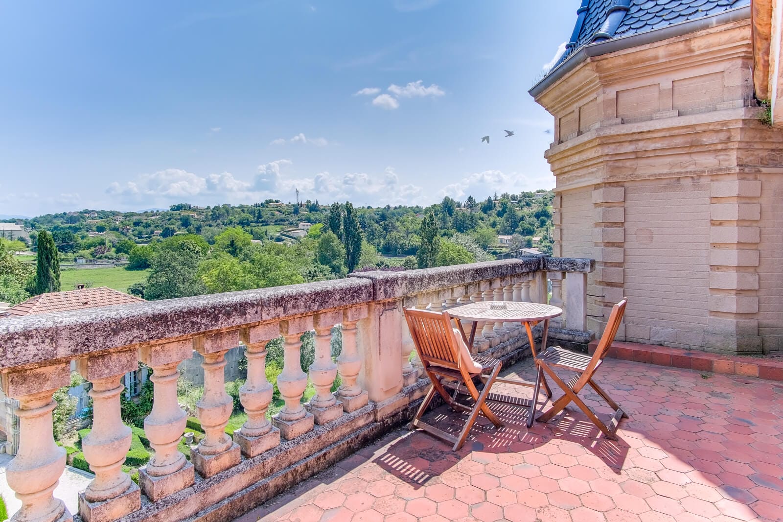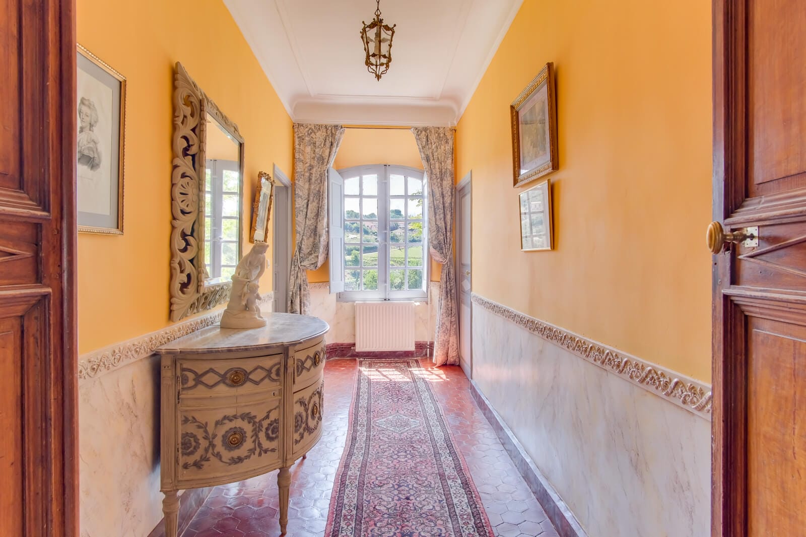 The traditionally crafted main staircase, with its unique moulded stucco frieze, leads to the three upper levels. The first intermediate level comprises a large reception room with hexagonal terracotta floor tiles and white walls. From here, four large semi-circular windows, which take up almost the entire wall, offer a view of the terrace and the valley. The first landing leads to three bedrooms with en-suite shower rooms, two of which face east towards the valley. All the rooms have the same hexagonal terracotta floor tiles as the staircase, typical of the 19th century. Two bedrooms feature marble fireplaces with overmantel mirrors, adorned with paintings, gilding and stucco work.