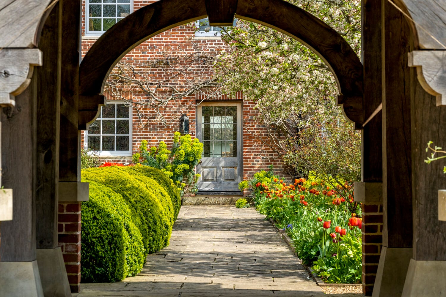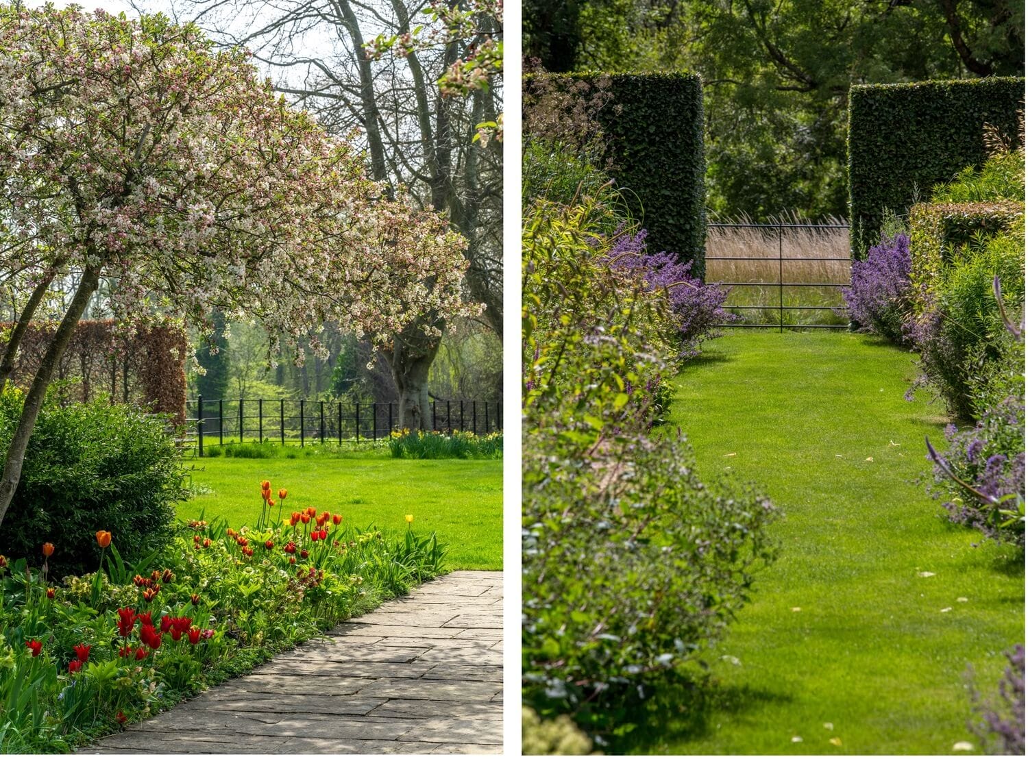 The garden at Moor Hatches is made up of three distinct parts. First, there is a formal courtyard area in front of the house which in the spring has a sea of wonderful tulips flanking a large outdoor dining terrace outside the kitchen; then there is a walled garden and finally an open lawn and wildflower meadow that leads down to ponds and the riverbank with its wilder feeling. The layout has been planned to allow for simplifications and adaptions to meet different needs if required.