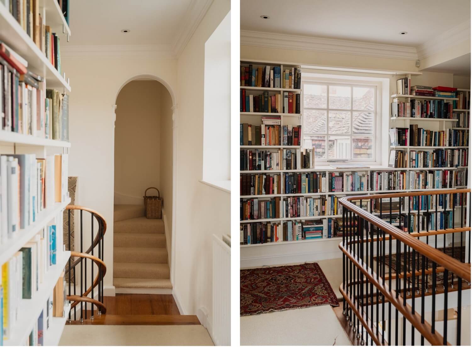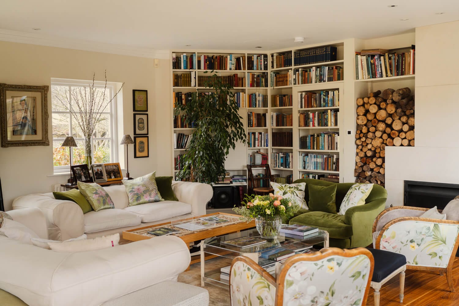 The front door opens into a large formal entrance hall, with open fireplace and sight right through to the garden. This space comes into its own as a perfect reception space for parties. The elegant sitting room is adjacent, featuring another open fireplace, a polished hardwood floor that flows through all the main reception rooms, and a charming 18th century bow window with a deep window seat. The stunning triple aspect drawing room is a wonderfully light and airy room, perfect for entertaining with sets of double doors opening out to both the walled garden and the courtyard garden. There is also a modern limestone fireplace and a series of smartly recessed bookshelves which bring a lovely warmth to the room.