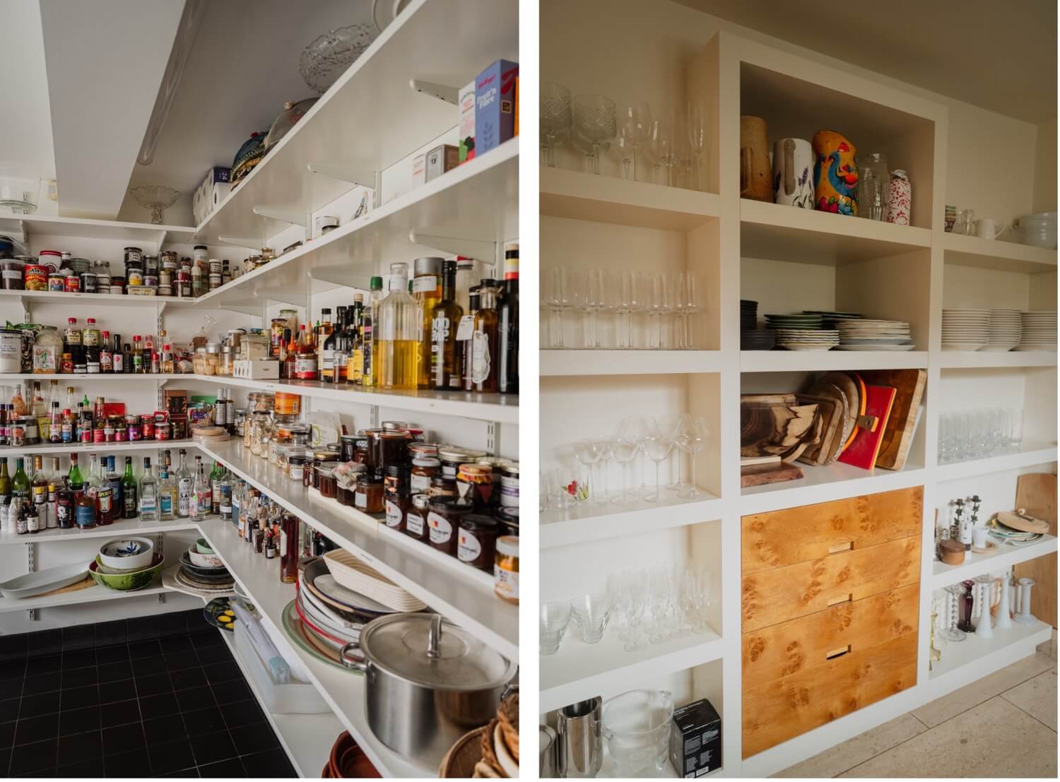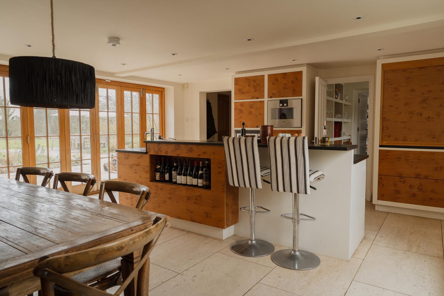 From the other side of the entrance hall there is a cinema room which formerly worked equally well as a formal dining room and has a hidden hatch connecting to the kitchen. The large family kitchen/breakfast room has a double set of folding doors out to the courtyard garden and was meticulously designed by Artichoke as a proper foodie’s kitchen. It features a central island, Pippy oak fitted cupboards with leather finished black granite counters, and Gaggenau appliances including a combi steam oven and an extra large conventional oven. In addition, there is a large scullery, walk in catering fridge, a fantastically large larder/pantry room, and beyond a useful laundry and boot room.