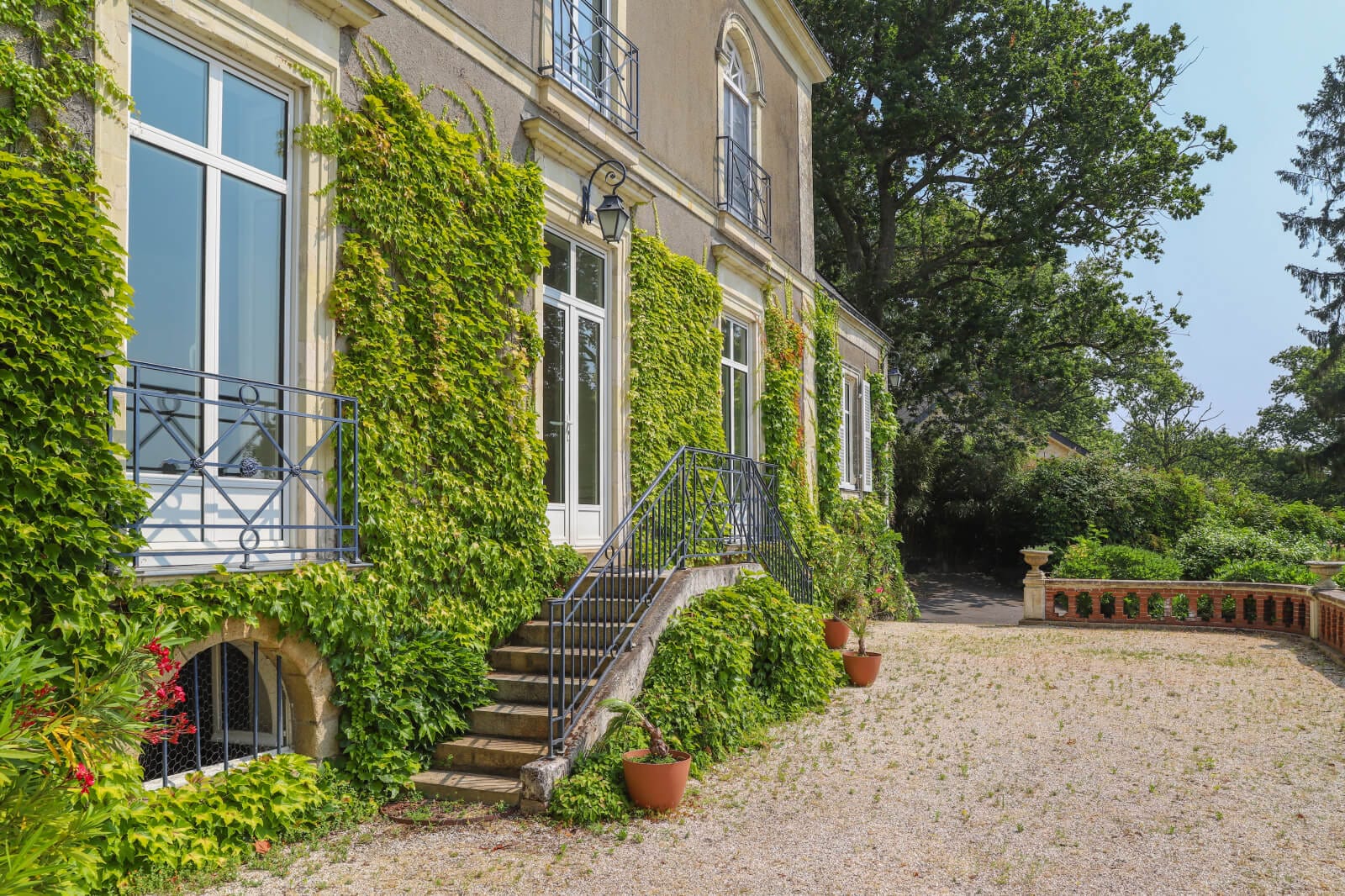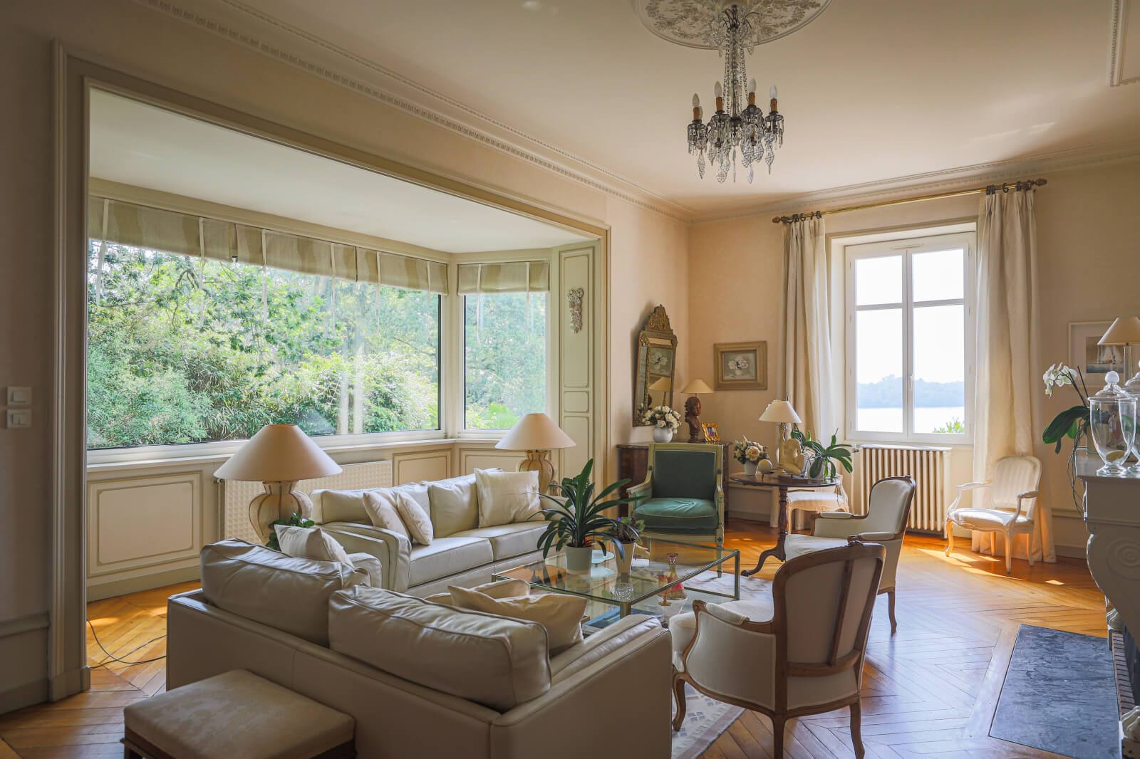 The entrance to the property is via a motorised, wrought iron gate at the end of a cul-de-sac off a small local road. A drive traverses a thicket and runs around the back of the house, leading to garages and a Directoire-style terrace. From here, the majestic view opens out over the parkland below and the Erdre at its widest point. The steeply sloping grounds, planted with centuries-old trees, end in a bank almost 100 m long, featuring a private jetty. A small country house built by the town’s former mayor on the banks of the River Erdre in 1821, it was subsequently remodelled with the addition of a Directoire-style double dormer window. Two wings were added in the early 20th century, lending the residence its true “folie nantaise” (Nantes folly) appearance, named after the summer villas built by wealthy industrialists at that time. The rectangular folly has a central section with three bays, flanked by two single-bay wings. At the top of the grounds, close to the entrance gates, there are discreet outbuildings used for parking vehicles and storing equipment. Their coursed schist masonry walls and tiled roofs stand in no contrast with those of the noble building, with its rendered facades and slate roof.