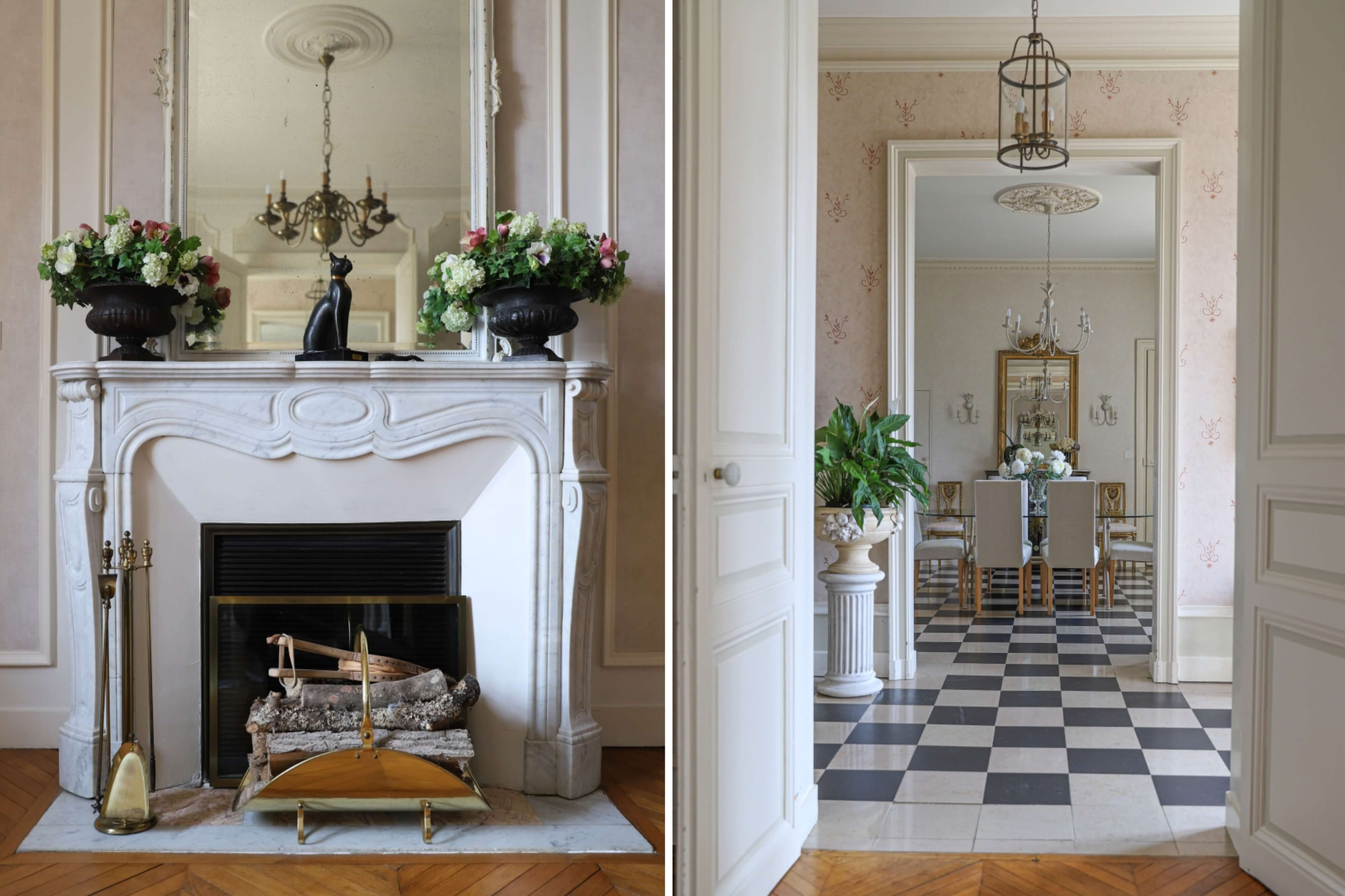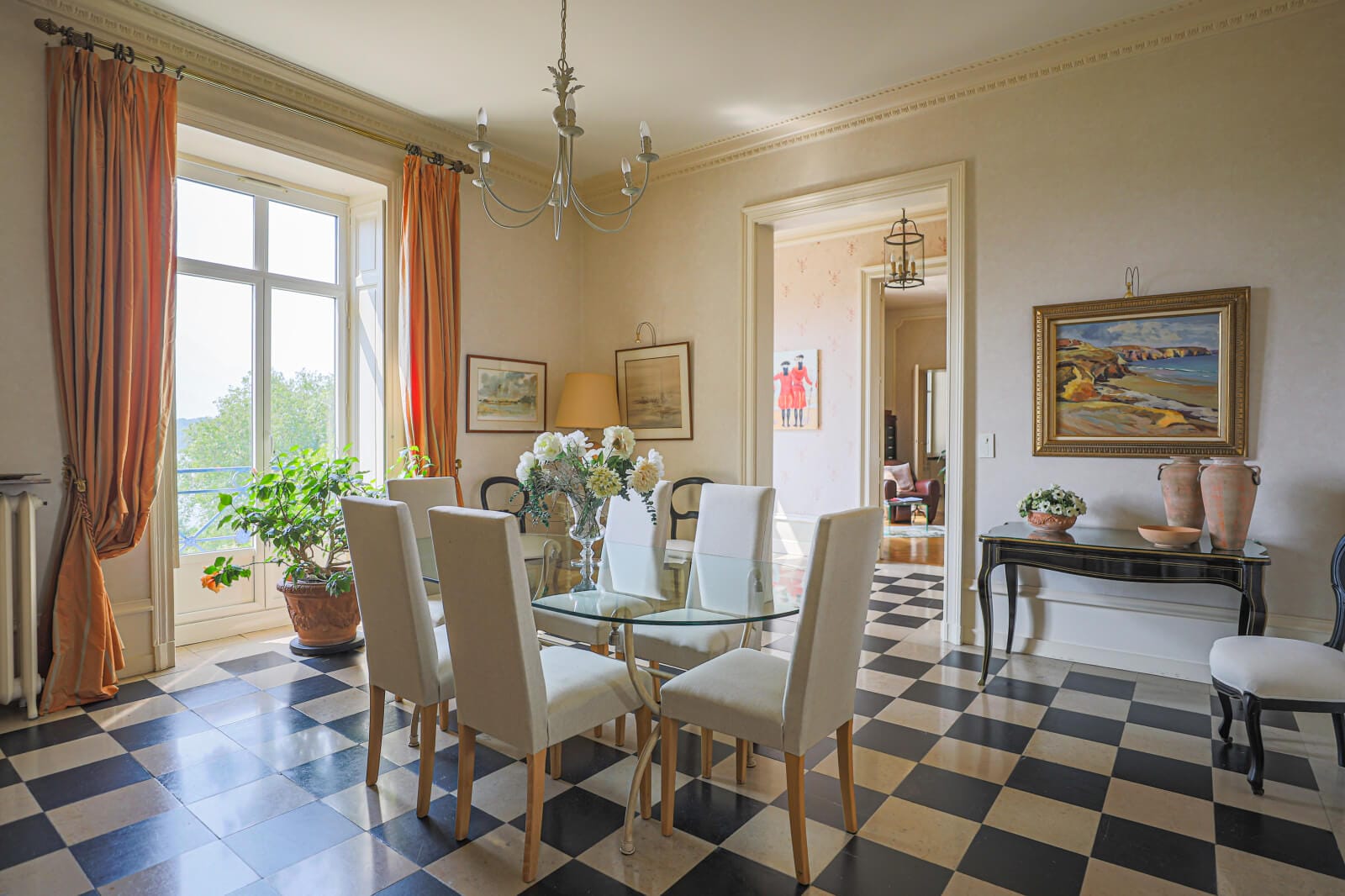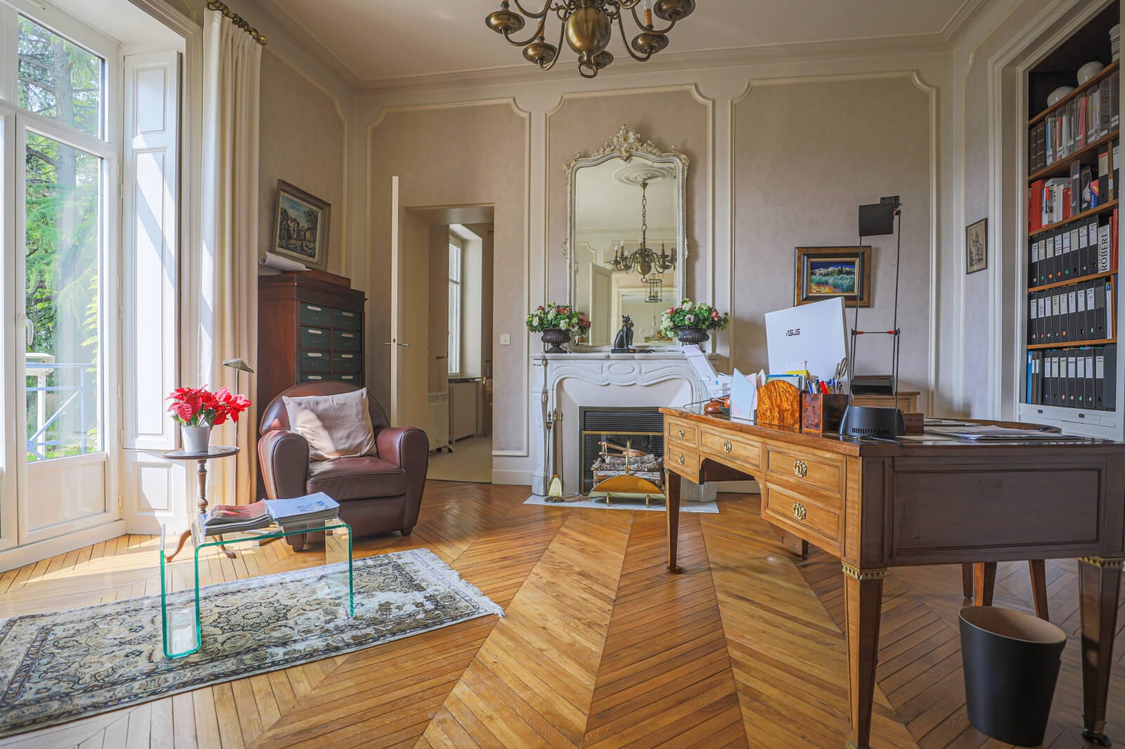 A double flight of approach steps with wrought iron railings leads from the terrace to the central entrance. A double glass door opens onto a double gallery with a black and white chequerboard marble floor. On one side, it leads to a study with herringbone parquet flooring, a Pompadour-style fireplace and a wall-mounted bookcase, followed by a bedroom with en-suite shower room facing the rear. On the other side, a dining room with the same chequered floor as the hallway connects to a sitting room with herringbone parquet flooring and a large oriel picture window on the east gable. All five rooms open onto the terrace, the park and the Erdre as far as the eye can see. Also accessed from the gallery, the modern kitchen features a service door opening out to the back of the house, sheltered by a canopy. There are also an anteroom with herringbone parquet flooring, a small conservatory connecting to the lavatories and two staircases, one leading to the upper floors and the other, concealed behind a door, to the rooms in the basement.