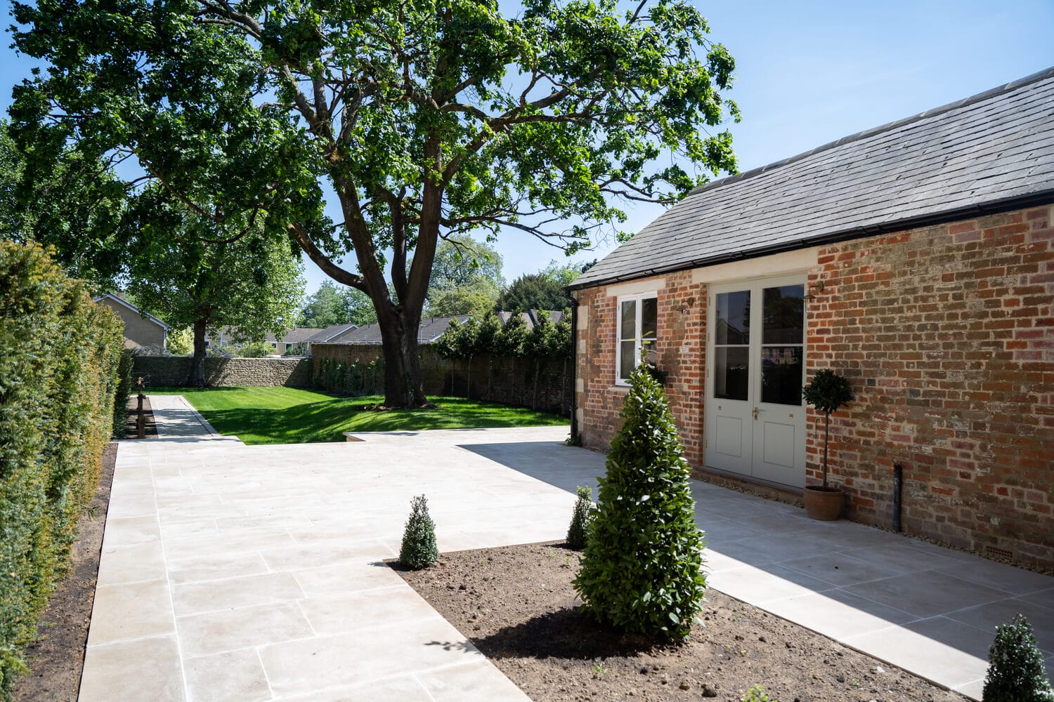 Outside, there is a generous, newly-landscaped private garden with a freshly turfed lawn and an expansive terrace. The garden has been finished with limestone paving, which perfectly complements the stone of the house. Brass lighting features have been provided, plus the opportunity for a buyer to personalise the garden extensively with further planting, lighting and other features. At the bottom of the garden, there is private parking for 4 cars, which is accessed via a shared electric gate at the rear of the property.