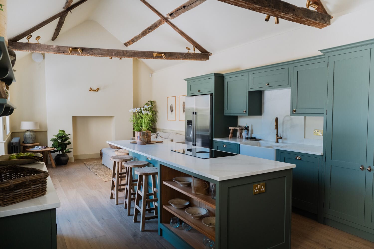 The lovely kitchen is located in an early 19th-century brick extension at the back of the house. This bright space enjoys high vaulted ceiling with characterful beams, panelled wainscotting, and views over the garden with French doors leading directly out to an outdoor dining terrace. The room is a fantastic social space with a smart fitted kitchen including larder cupboard, double butler sink, Neff appliances with two ovens, warming drawer, dishwasher, American style fridge/freezer, induction hob with integrated extractor fan, and wine fridge, and an extensive island with breakfast bar. The far end of the kitchen is set up as an informal sitting area with space for a pair of sofas, but could equally accommodate a large breakfast table.