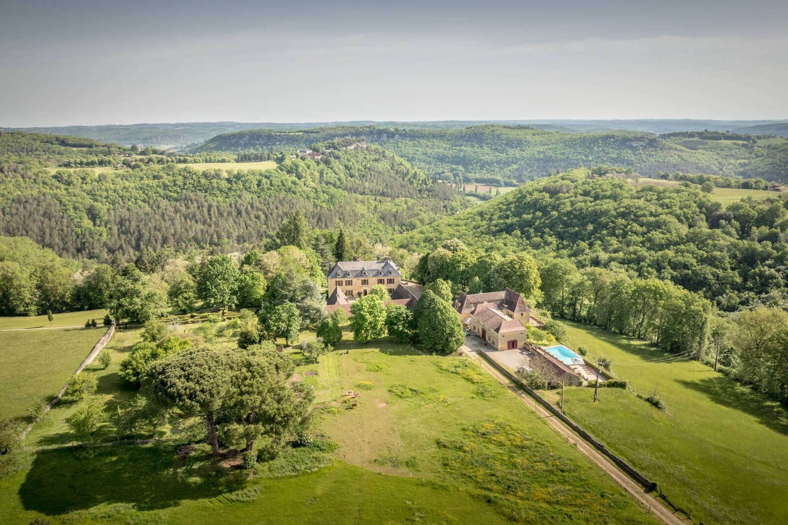The site, absolutely magnificent, is one of these numerous Périgord plateaus sandwiched within a complicated network of large and small valleys with abrupt edges and spectacular views, surrounded on all sides by a landscape practically devoid of all human occupation. Comparable to that of a horseshoe, with its curves corresponding to the property’s north and northwest slopes and the central part to the estate’s cultivated plateaus, the site’s topography culminates at an average of about 200 metres in altitude with an elevation gain of approximately 20 metres, guaranteeing awe-inspiring views of the surrounding woods, hills and meadows. Divided up in the 1970s, the property has, nevertheless, preserved 38 of its original 104 hectares. Remarkably conserved thanks to careful replanting, these spaces underscore this site’s singular value, which still succeeds in offering a meaningful testimony to the splendour of these great estates of yesteryear. Founded in 1571, as indicated in the archives, and passed down from the Lord of Roufflilhac to various bourgeois and local notables, the “noble dwelling”, more commonly known as “the chateau”, and its outbuildings were built during the late 17th century over the vestiges of a medieval dwelling destroyed during the French Wars of Religion. Although possessing the essential Périgord architectural characteristics from the late 17th century, it was reorganised in the 18th and 19th centuries, when it was acquired by the Pontou family, who would go on to keep the property in their possession for more than 100 years. Today, the property includes the chateau, the “Old House”, a former tenant farm now used as a guesthouse, a caretaker’s cottage and former stables partially converted into accommodations, the whole forming a kind of hamlet. In addition, a completely restored dovecote with a stone slate roof, a tennis court and an immense infinity swimming pool are scattered throughout the grounds, the water for which is supplied by the property’s own natural spring located below the main dwelling along with a washhouse and basin. The result? One of the most beautiful properties in Dordogne – the authenticity of which has been carefully conserved – providing breath-taking views of the surrounding Unesco World Heritage-protected landscape.