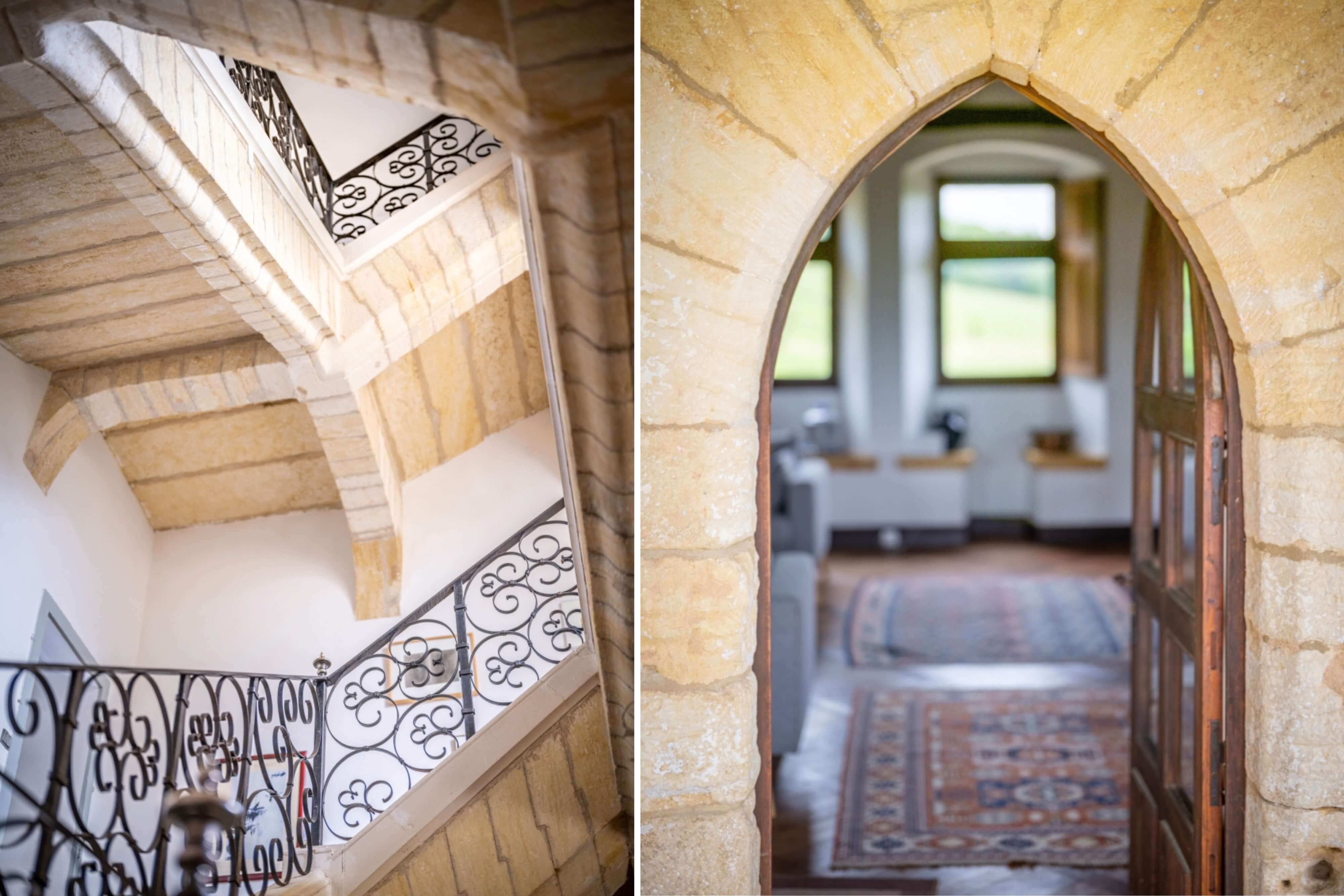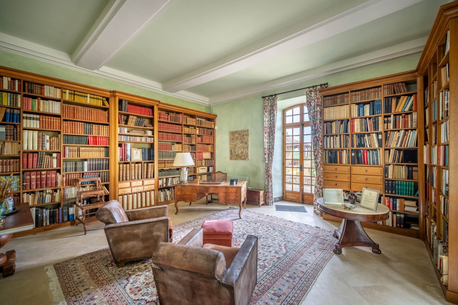 The front door on the house’s southern façade opens onto an entrance hall with a Vèze stone tile floor and an impressive, quarter-turn staircase built out of the same white stone, with landings and a wrought-iron guardrail decorated with arabesques reflecting 18th-century tastes. On either side of the entrance hall, following the layout of grand bourgeois dwellings of yesteryear, a drawing room is located to the east, while a dining room can be found to the west. The drawing room, the walls of which are decorated with chest-height, two-toned wainscoting as well as pale gold damask fabric, is organised around a Louis XV-style fireplace with a wooden mantel. With oak herringbone hardwood floors, it is bathed in light to the east by two sets of glass doors and is extended to the north by a study with a matte travertine tile floor surrounded by marble skirting boards, as well as floor-to-ceiling oak bookshelves and a fireplace topped with a slender stone chimney breast, which abuts another one of its tastefully painted walls. On the other side of the staircase, the dining room continues the house’s overall decorative aesthetics with two-toned wainscoting, a stone fireplace and a series of Versailles-pattern hardwood floor panels, while, to the north, it opens onto a room providing access to a laundry room, a lavatory as well as the completely fitted kitchen, which combines contemporary design with more old-fashioned details and is flanked to the east by a storeroom and, to the west, by a service entrance. In the middle of the dwelling’s northern exterior, a foyer used as a cloakroom is topped with an impressive tunnel vault. This austere-looking ceiling eventually transforms into a quadripartite vault in the last and oldest room on this floor, which is today mainly used as a snooker room and contains a carefully preserved traditional “cantou” stone fireplace.