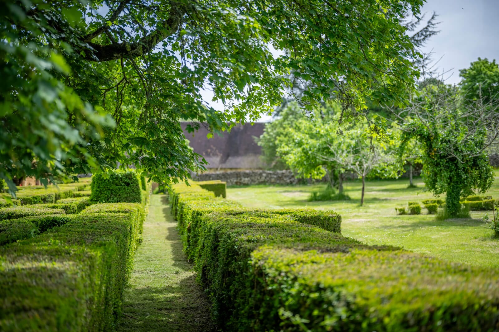Spread out over valleys and hillsides, the property, traversed by numerous independent access roads, creates a perfectly bucolic, if not Virgilian, landscape. Divided today into approximately ten hectares of meadows, gardens and orchards as well as 27 hectares of woods, this allocation of land was intended to provide the chateau with enough firewood, vegetables and fruit in order to make it completely self-sufficient. In addition, a large herd of livestock with around one hundred animals (sheep, dairy cows, horses, pigs, fowls, etc.) meant that they did not have to rely on any external food resources, while a natural spring and several vine stocks provided refreshments for its inhabitants, both human and otherwise. Reduced to nearly three-quarters of its original size, the property still alternates between natural meadows, oak groves and fruit trees (walnuts, plums, peaches, apples and cherries), which form part of the orchard located on the site of the former large vegetable garden, now planted with ornamental boxwoods, but whose contours are still outlined by low dry stone walls.