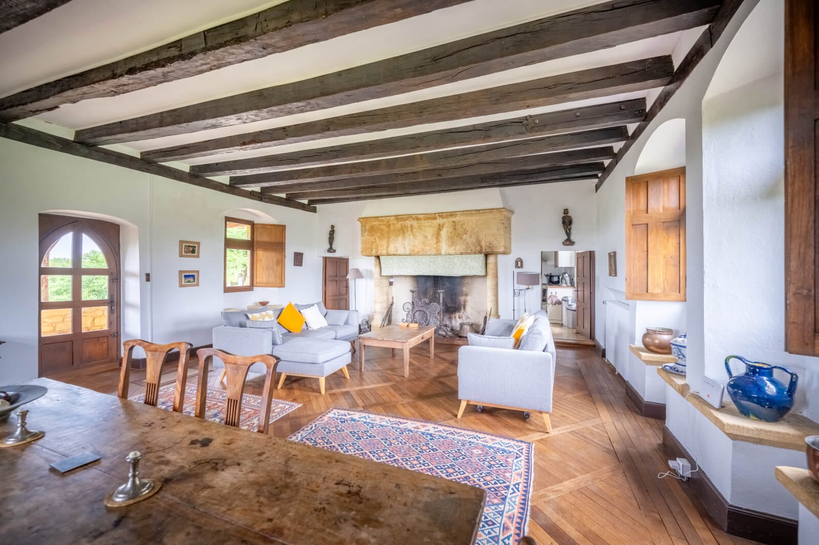 Renovated more recently, this former farm building, the origins of which date back to the 15th century, has now become a guest cottage with approximately 184 m² and views of the surrounding landscape, or, to be precise, spectacular vistas of the valley, a characteristic in common with the rest of the property’s highpoints. Reachable from a private lane, the three-storey building breaks from traditional Périgord architecture with its steeply sloping flat tile gable roof, its wide chimneys and various levels, which help counterbalance the slope on which it was built. The dwelling is accessible from several different levels and, specifically, an exterior stone staircase leading to an intermediary patio with a Périgord pisé floor, the stones of which are held together with a natural binder made out of raw earth and lime. As for the house’s garden level, it contains a room used as a dormitory with approximately 43 m², a shower room, a lavatory as well as a furnace room located in a room where the presence of a cantou fireplace indicates that this was once the kitchen. Continuing on to the next floor, this includes an entrance hall of approximately 15 m², a fitted kitchen of approximately 10 m², as well as the living room, of approximately 50 m², with an immense medieval-looking stone fireplace, window seats and direct access to the patio via a lancet arch door, while, upstairs (with a sloping ceiling) there are two bedrooms with approximately 31 m² and 10 m², respectively, a shower room and a lavatory. Renovated with high-quality materials, its hardwood floors, wooden beams, ancient doors, stone walls and terracotta tile floors all come together to create an authentic living environment where contemporary comfort has been elegantly combined with the original details of this former tenant farm.