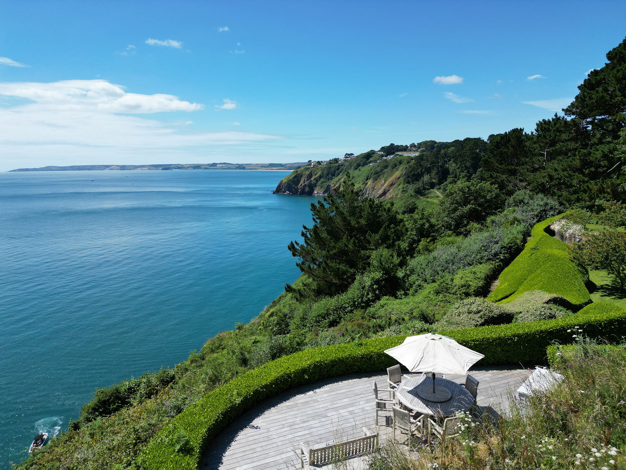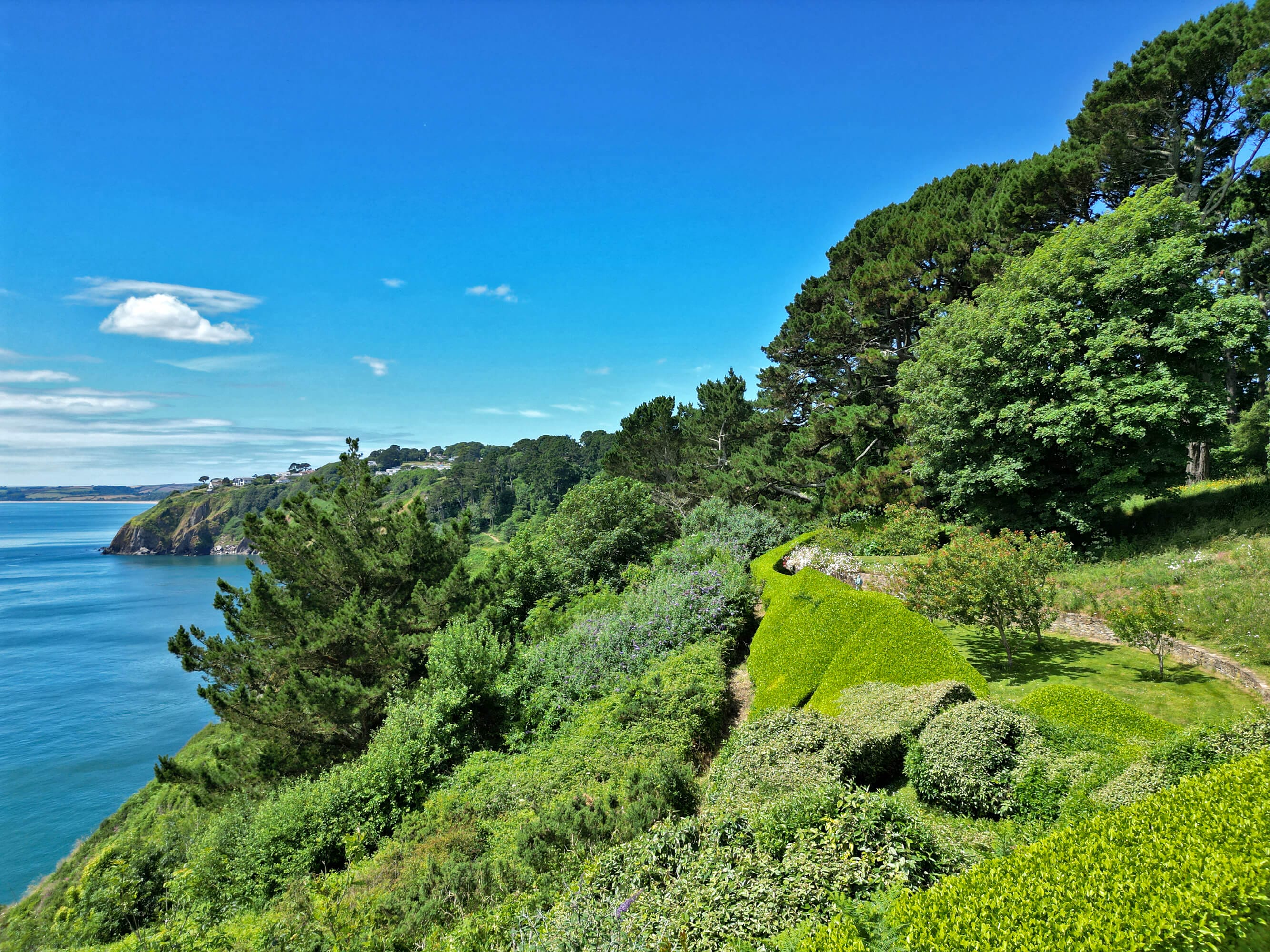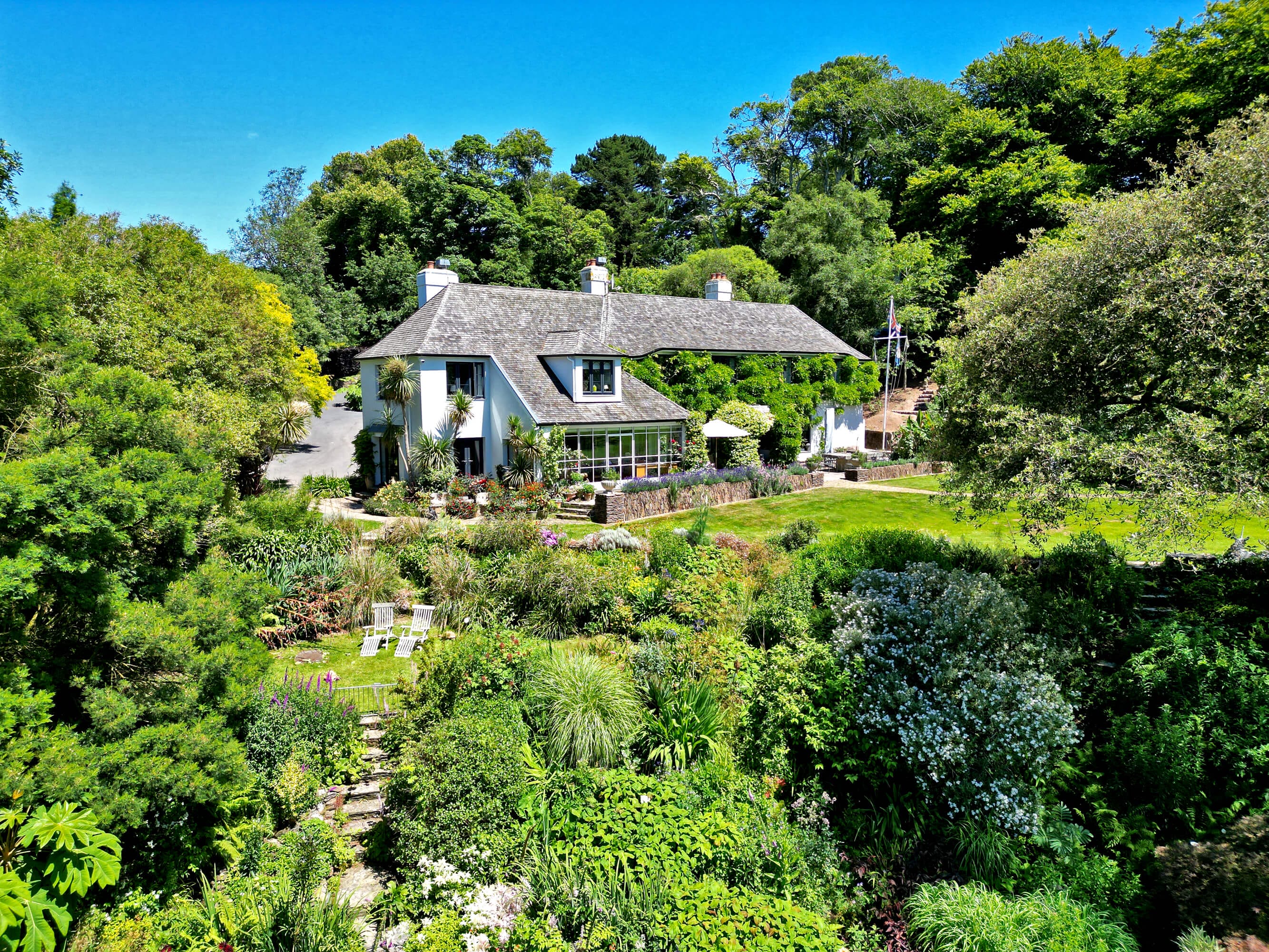 The estate blends formal structure with wilder romanticism. A stream runs through the centre of the valley, leading the eye towards the sea. Around the house, lawns and mixed borders give way to woodland, exotic planting, and terraced cliff gardens where tender species thrive in the sheltered microclimate.