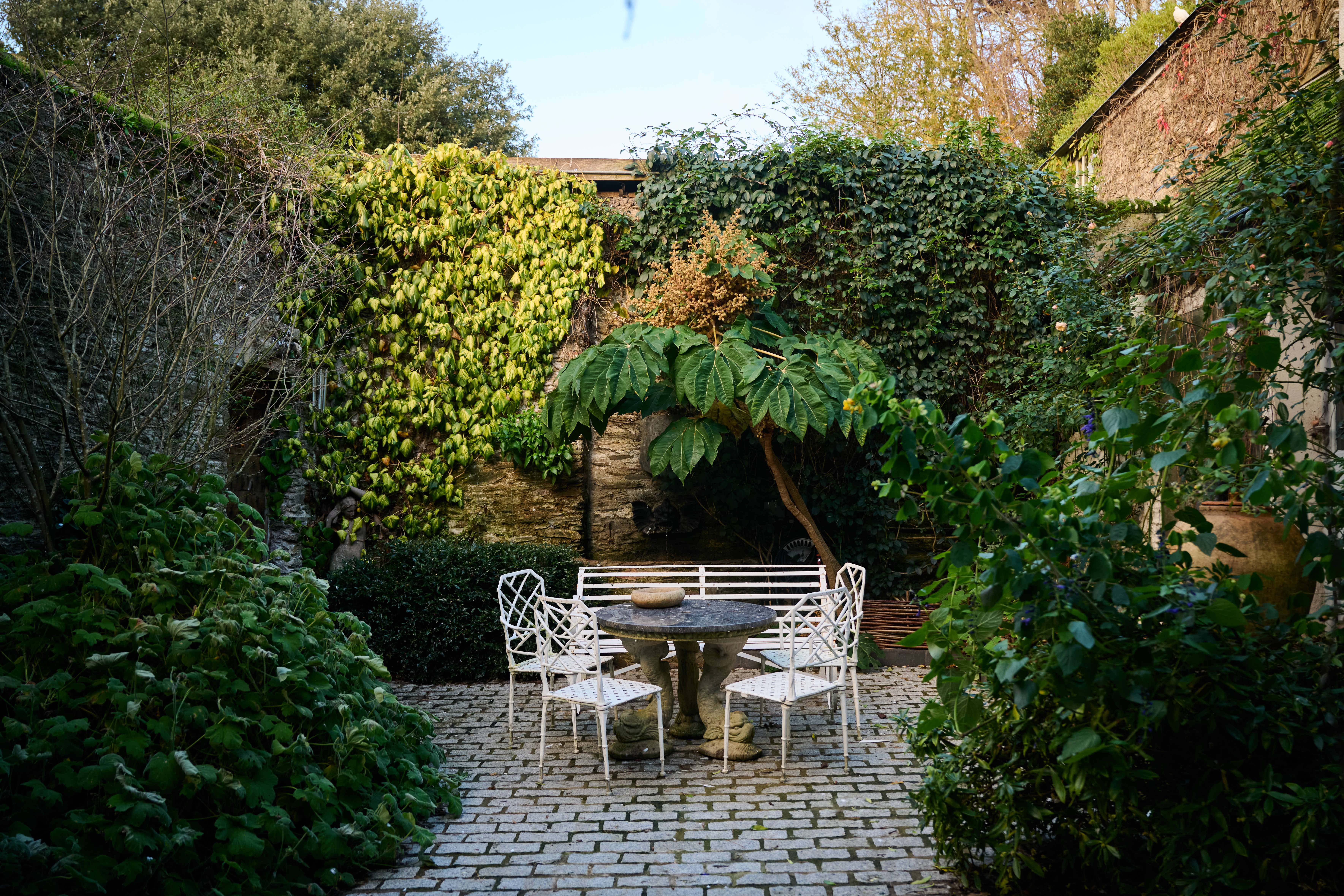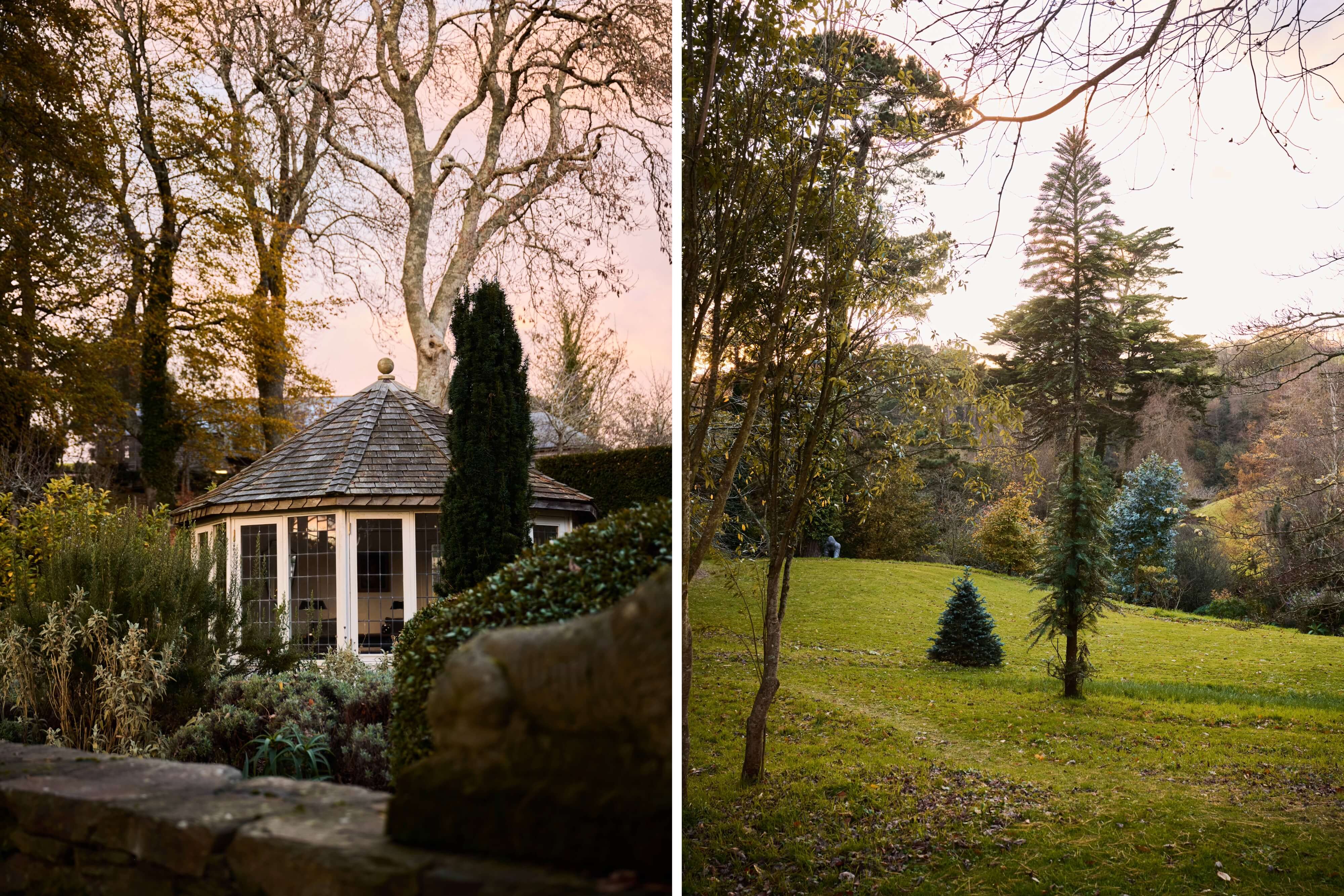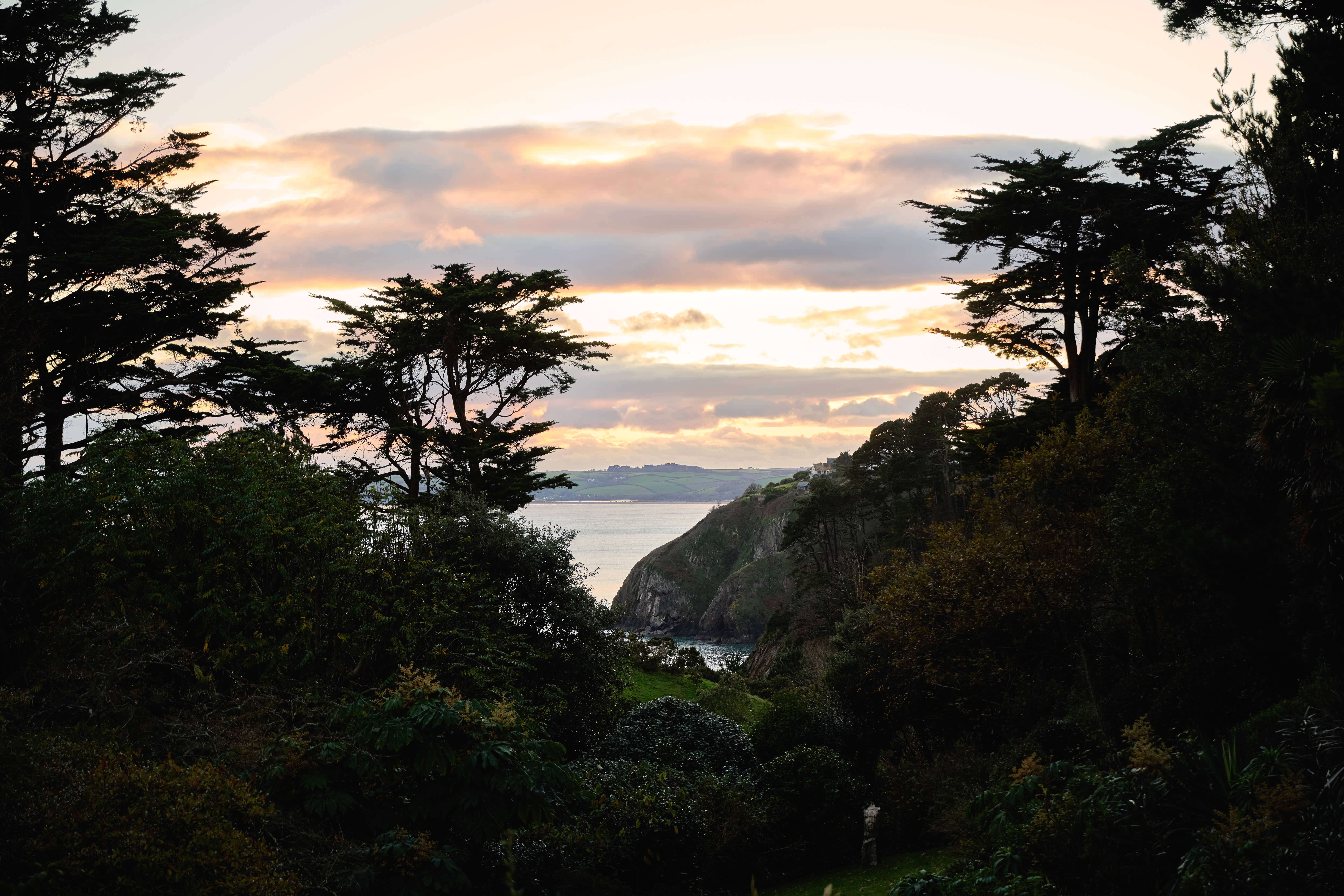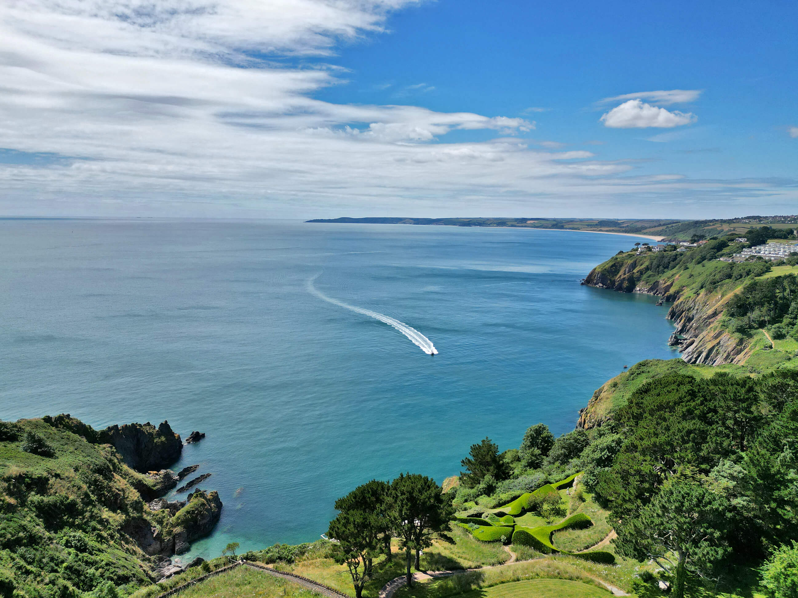 The estate blends formal structure with wilder romanticism. A stream runs through the centre of the valley, leading the eye towards the sea. Around the house, lawns and mixed borders give way to woodland, exotic planting, and terraced cliff gardens where tender species thrive in the sheltered microclimate.