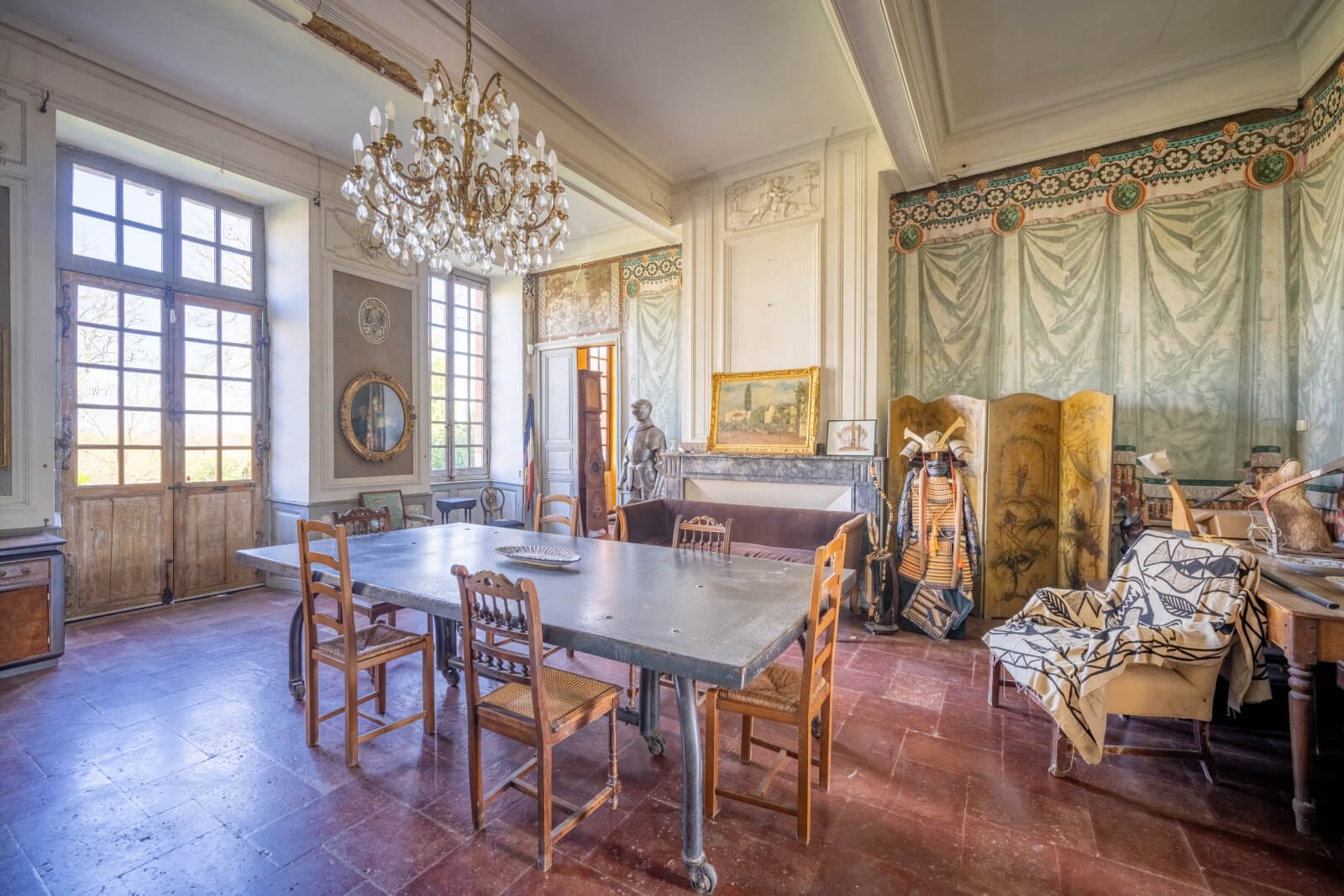 After the entrance door, a vast, symmetrical hall stands beneath high ceilings, with a floor of large, period tiles. It leads to a wide, 18th-century wooden staircase that climbs to the first floor. On either side, tall wooden doors lead into the reception rooms: a kitchen, a ceremonial lounge and a library. In a subtle dialogue between the eras, the kitchen, which is bathed in light and boasts resolutely modern lines, is perfectly integrated with the historical setting. As for the lounge, it boasts an atmosphere that is both theatrical and cosy: the walls are covered with period wallpaper and a veined marble fireplace, topped by an overmantel with allegorical mouldings, stands against one of the walls. Thereafter, two bedrooms can be found at the far reaches of the building, each with an adjoining space that can be converted into an office or bathroom, housed in the towers. The library, which is also bathed in light, is an invitation to reading, peace and quiet. Next to it, an office occupies one of the towers.