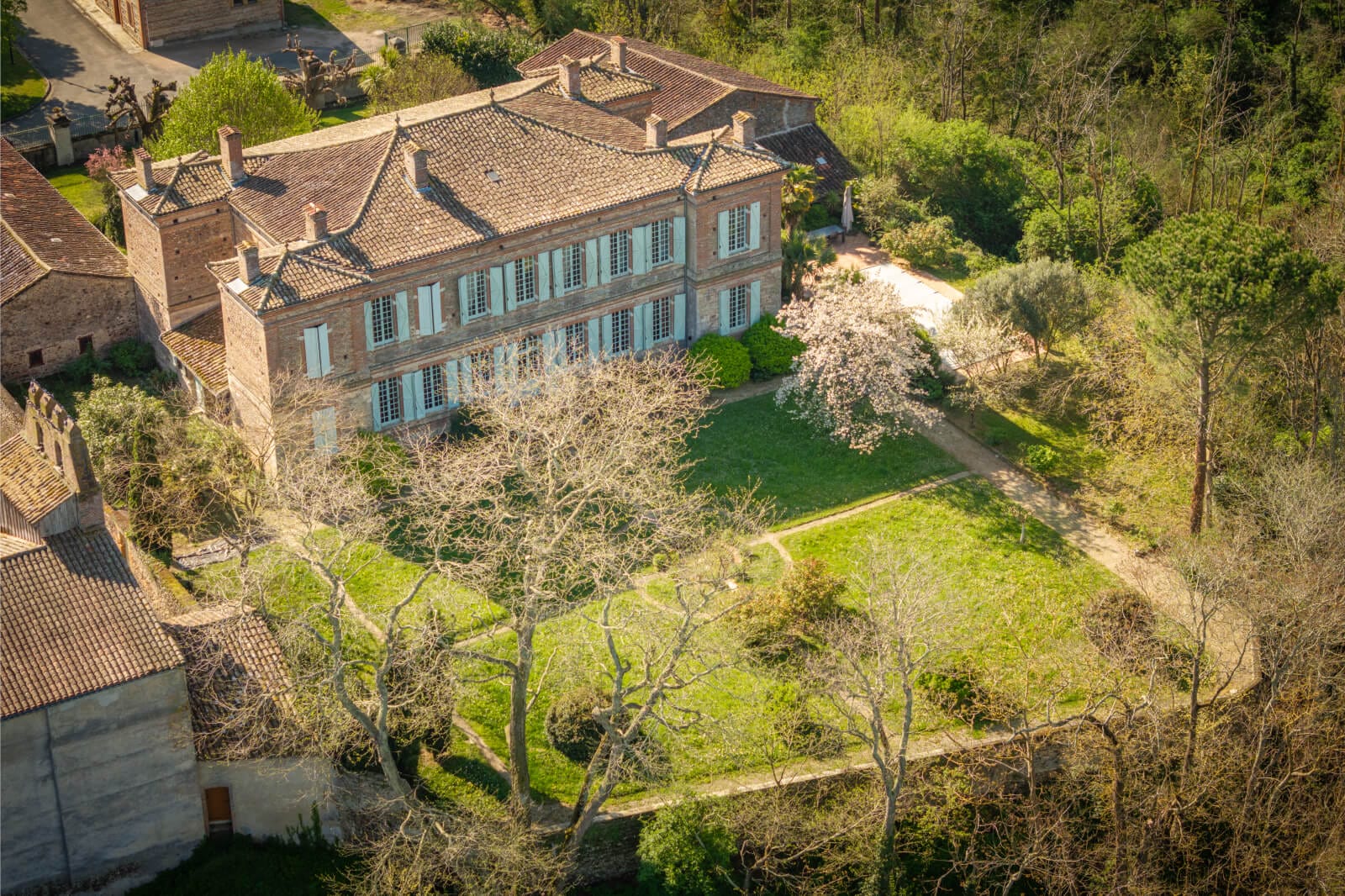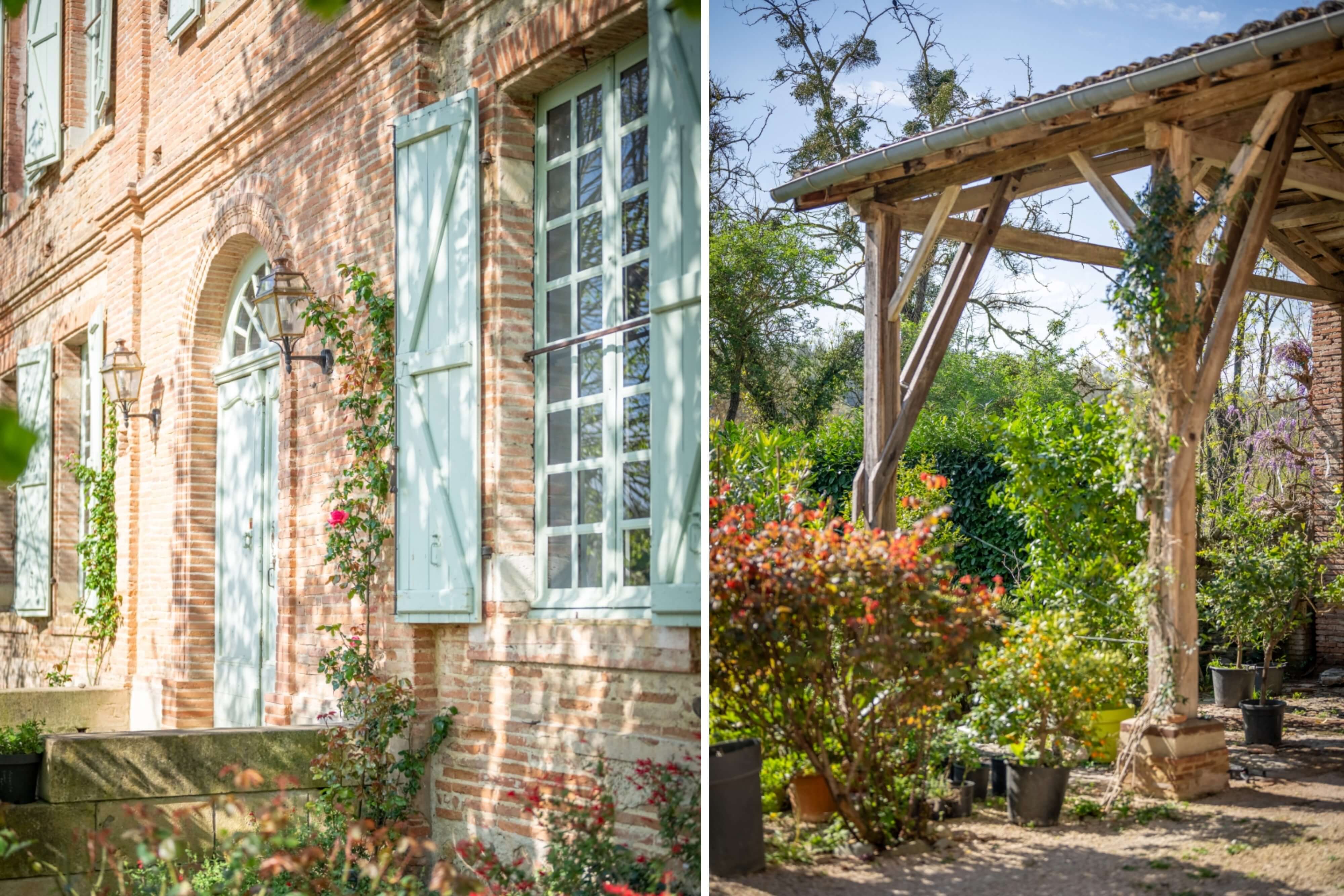 In front of the edifice, the garden / courtyard is planted with rose bushes and rhododendrons, under the finely statured branches of two horse chestnut trees and two lime trees. Together, they provide freshness as well as shade in summer and light plus warmth in winter. The courtyard is surrounded by three buildings: the manor house, former stables and a hangar, forming a coherent architectural whole that protects against prying eyes and wind. Behind this brick screen, there is a second garden - the Garonne garden - which extends up to a discrete gate to the village’s church, which was the castle’s chapel in bygone days. It is framed by two mounds, most likely the former medieval moat. It is square in shape and retains subtle traces of its past as an ornamental garden, with geometric patterns and an elegant thoroughness. Two fountains - one in the garden / courtyard and the other in the Garonne garden - provide a gentle touch to the place. To the west, in a discrete corner of the Garonne garden, a swimming pool stands in its rightful place, lined with irises, rose bushes, olive trees and a few palm trees.