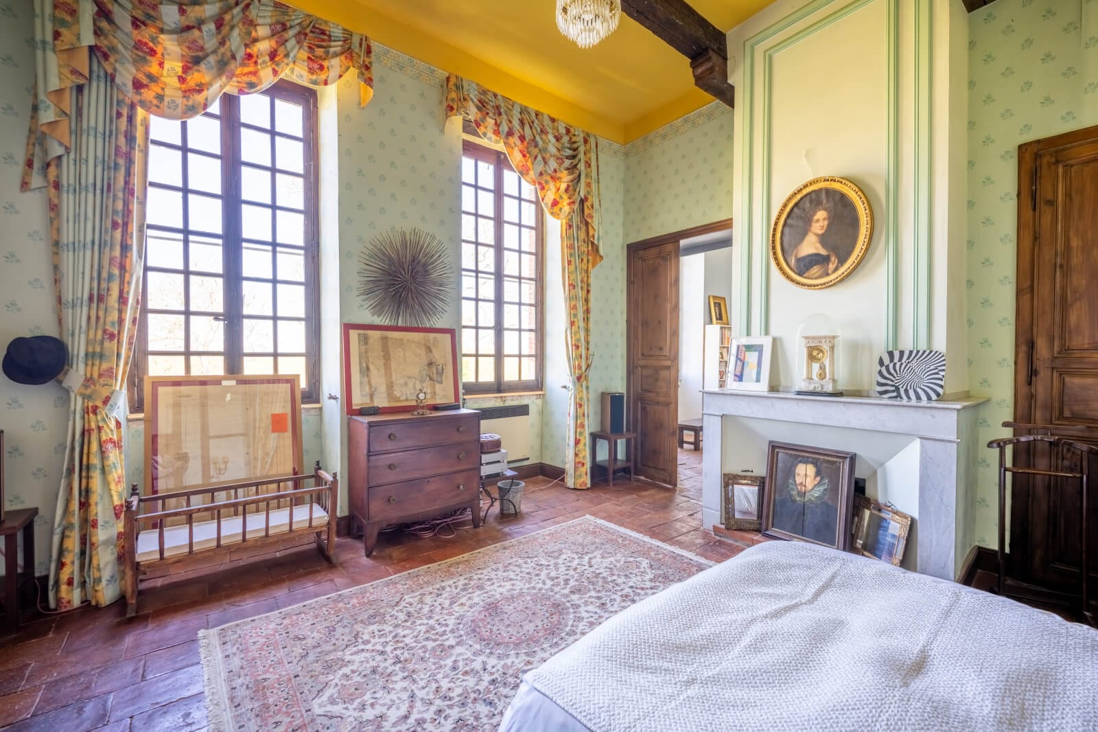 This level is made up of four master bedrooms and a large lounge, all with the same remarkable ceiling height of more than 4 metres, as on the ground floor. Each room is adorned with a marble fireplace standing on period tiled flooring and boasts two tall windows, allowing light to generously stream in throughout the day. Each bedroom is adjoined by rooms in the towers, which could be used as offices or en suite bathrooms, according to needs. The central landing leads into the large lounge, forming a fluid and bright living space.