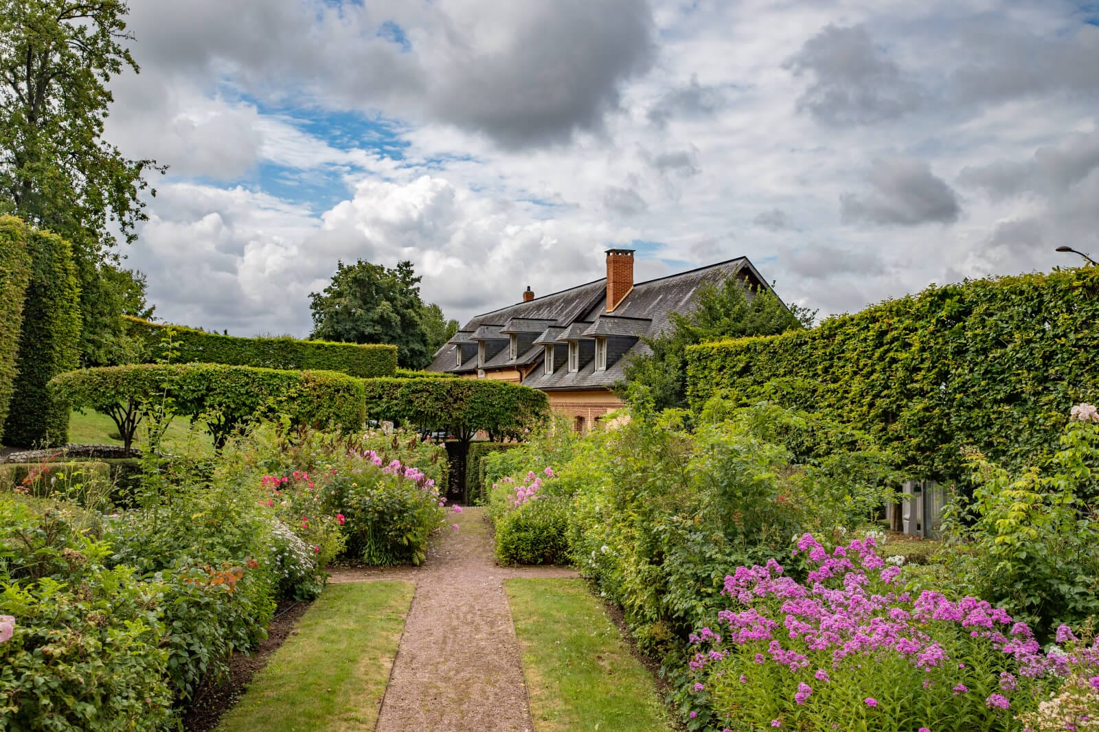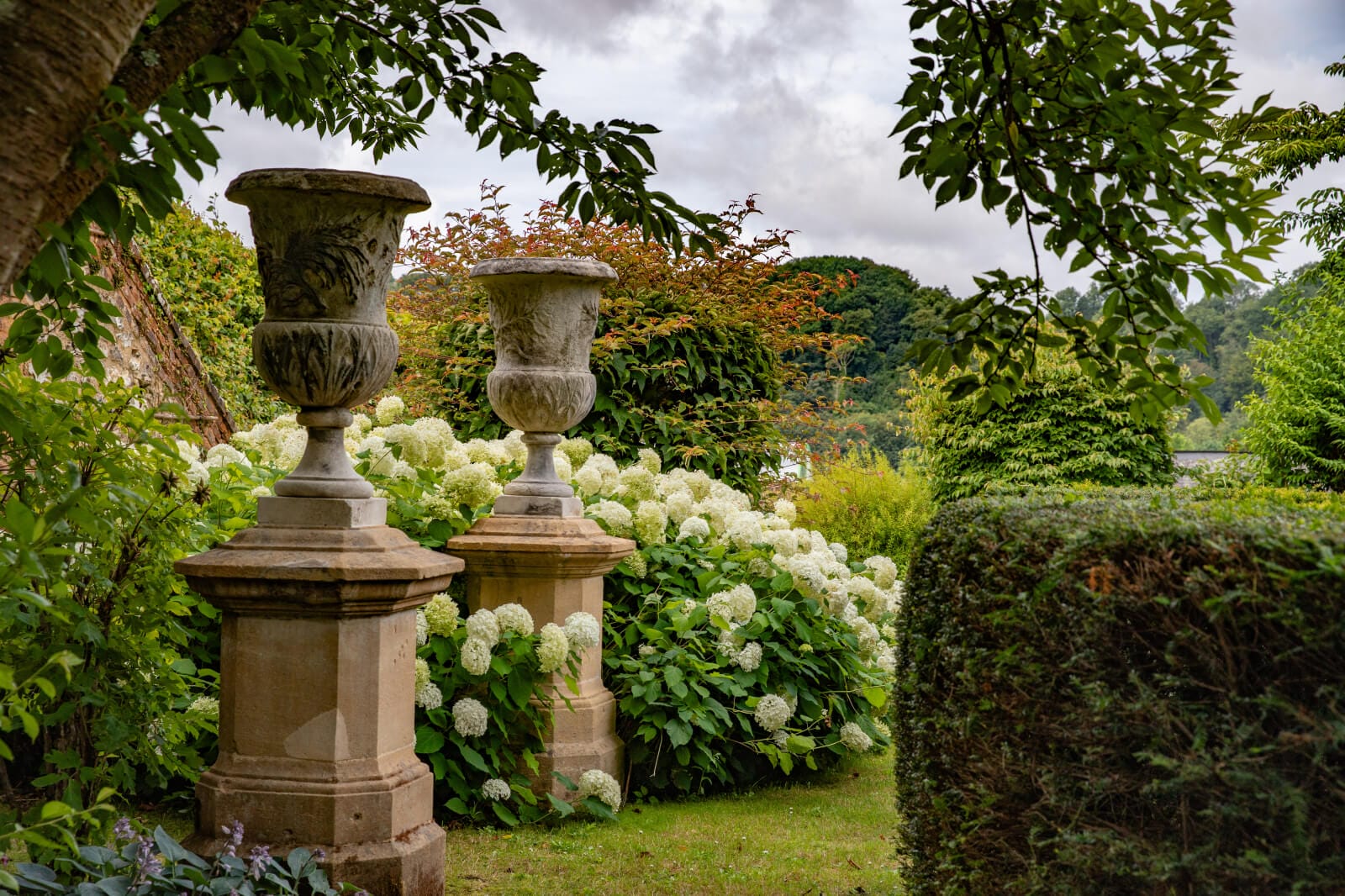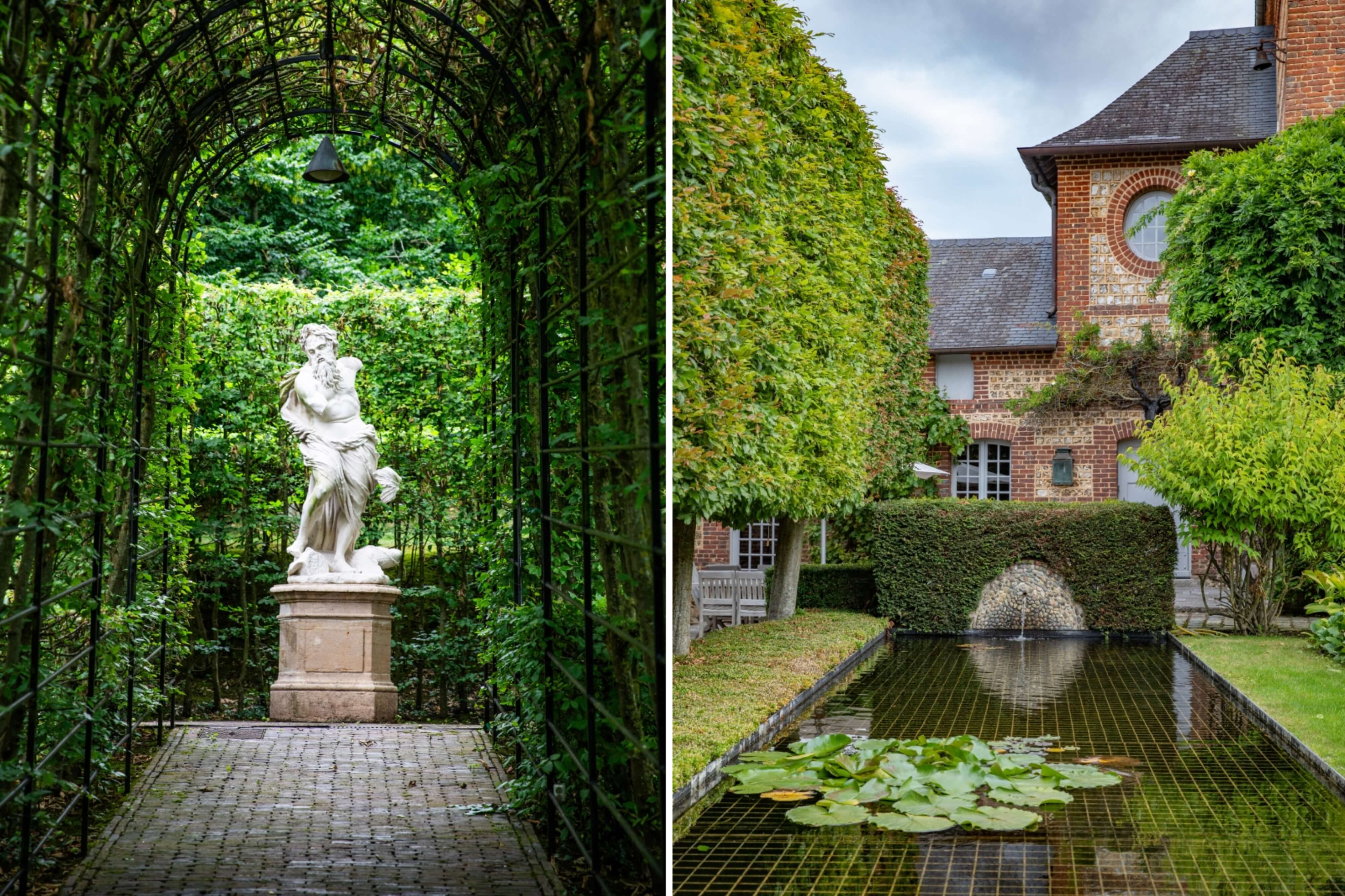 The garden was designed by the famous landscape architect Jacques Wirtz. Its aesthetics are subtle and expressive. It has fluid lines, organic forms and sculpted vegetation, including box hedges and hornbeams. Wirtz used evergreens, plant textures and effects of shade and light to create peaceful, timeless atmospheres. He tried to reveal the place’s soul, rather than impose a style, integrating architecture, nature and landscape in discreet harmony. Covered or open-air paths, sometimes paved with brick and sometimes straight, are edged with neat hedges, yews and rows of trees. Monumental vases also adorn the garden. Rectangular ponds with water lilies are embellished with gargoyles. Lawns with rounded forms have tall trees and clusters of flowering plants. And benches are positioned in well-chosen spots for you to make the most of different times of the day.
