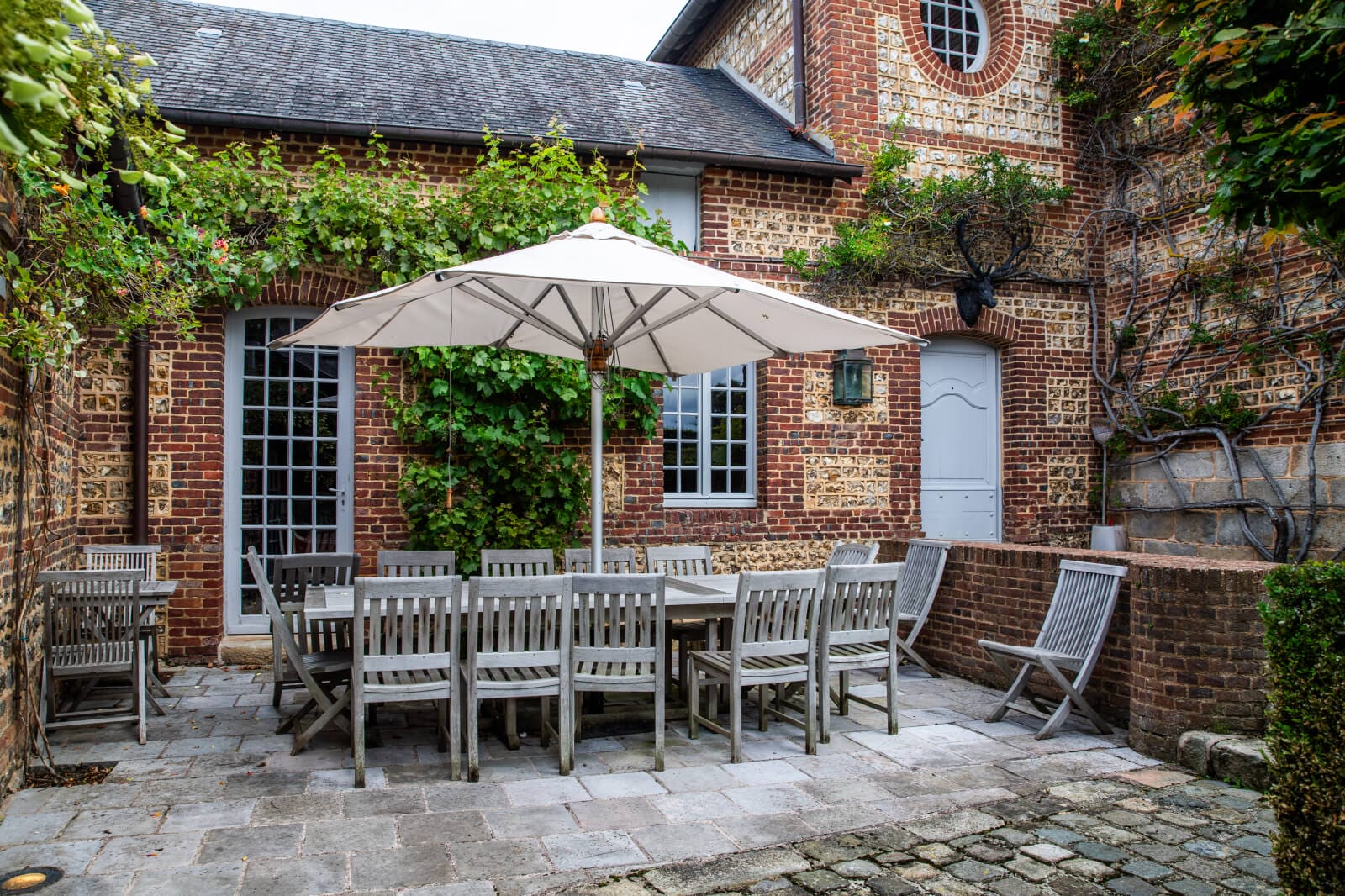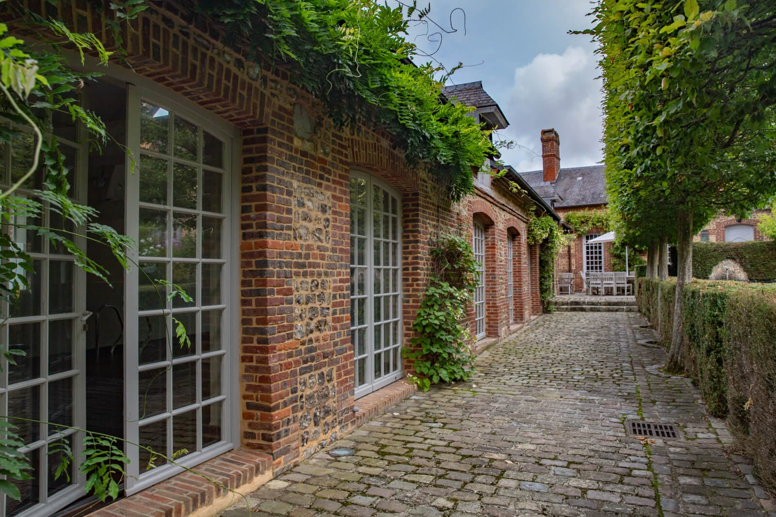 Just outside the village, a broad wooden gate and paved drive lead to a vast space. Two guesthouses and a garage stand on one side. The main dwelling and its extension stand on the other side. The grand house is typical of noble Norman dwellings from the mid-17th century. South-facing and rectangular in shape, it has a ground floor, a first floor and a second floor in the tall roof space. The building is crowned with a hipped slate roof with six dormers. The elevations are made of brick. Red brickwork forms the quoins, cornices and window and door surrounds. The facade has five bays. On one side, there is a 19th-century brickwork extension. It has a two-level section with a three-slope roof, followed by a single-storey wing with a roof space. This wing houses a swimming pool. The garden was designed by Reference 120251 the famous Belgian landscape architect Jacques Wirtz in the early 2000s. Wirtz is known for his work on two Parisian gardens: the Jardin du Carrousel garden in front of the Louvre Museum and the garden of the Élysée Palace. The property’s garden extends beyond the buildings, which it links together with paved paths, some of which are shaded. This magnificent outdoor space offers striking views.