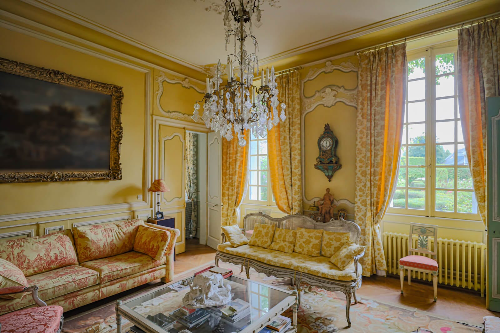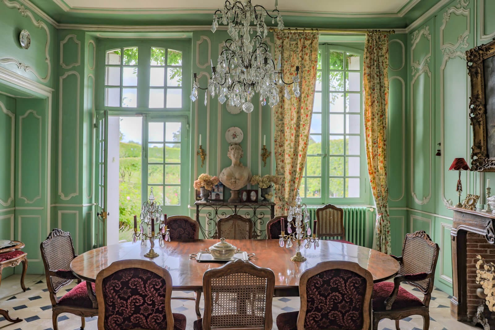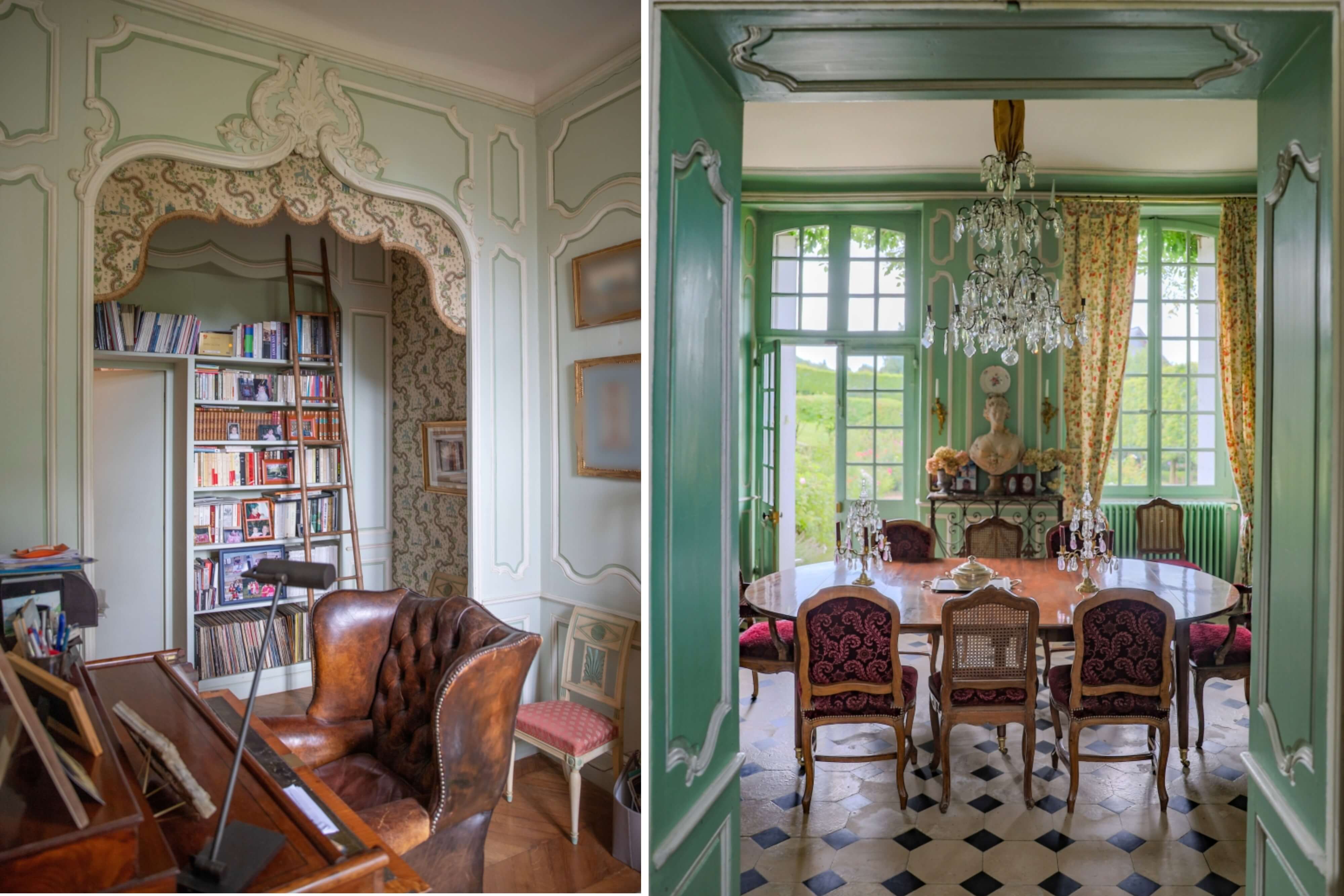 The entrance hall is in the extension’s two-level section. It has a floor of old square tiles. On one side, it connects to a corridor where a timber staircase leads upstairs. On the other side, it connects to a lounge with pale oak panelling and a broad fireplace of sculpted stone, brightened up with natural light from windows on both sides of the room. A door hides stairs that take you down to a cellar. The hallway links the house to the extension with the swimming pool. From the corridor, you can reach the kitchen and dining room. A lounge and an office, originally a bedroom with an alcove, lie beyond them. The floors have pale tiles patterned with black square inserts. Other floors have chevron parquet. The edifice’s 18th-century decorative features are listed for their historical interest. The walls are adorned with floor-to-ceiling wooden panelling like that of the main chateaux in Normandy’s Pays de Caux province.