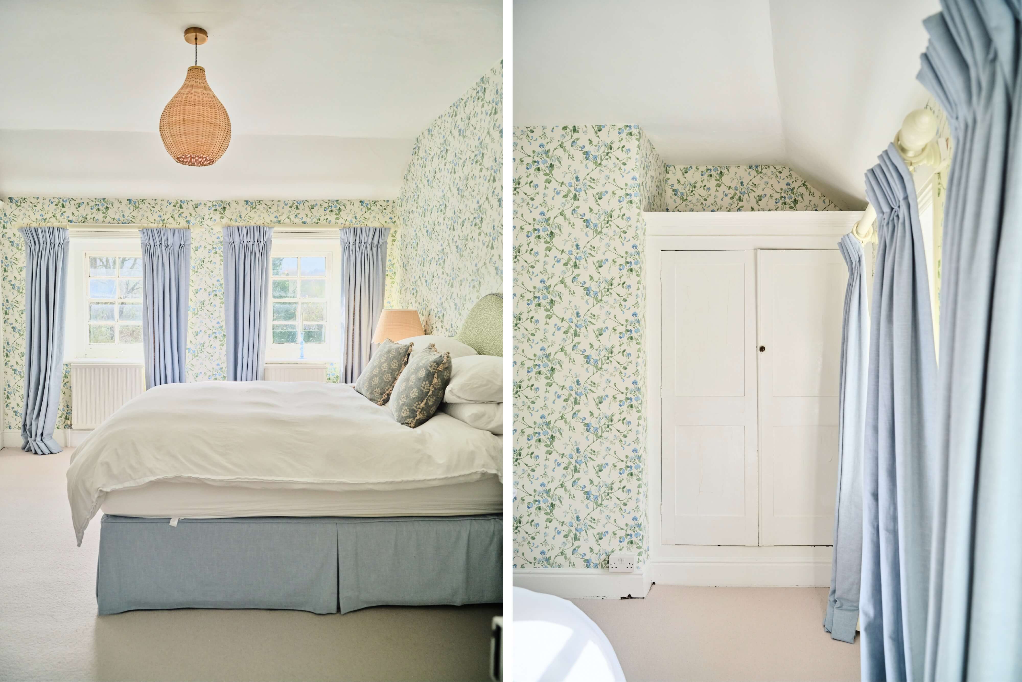 The dining room is the oldest part of the house and retains fantastic period features including an open stone fireplace, half panelling and oak floor, strawberry gothic windows and a glazed door with attractive porch leading onto an outdoor dining terrace. The room is regularly used day to day as well as for hosting by the current owners, who have re-papered the walls in Soane Britain’s timeless Scrolling Fern wallpaper.