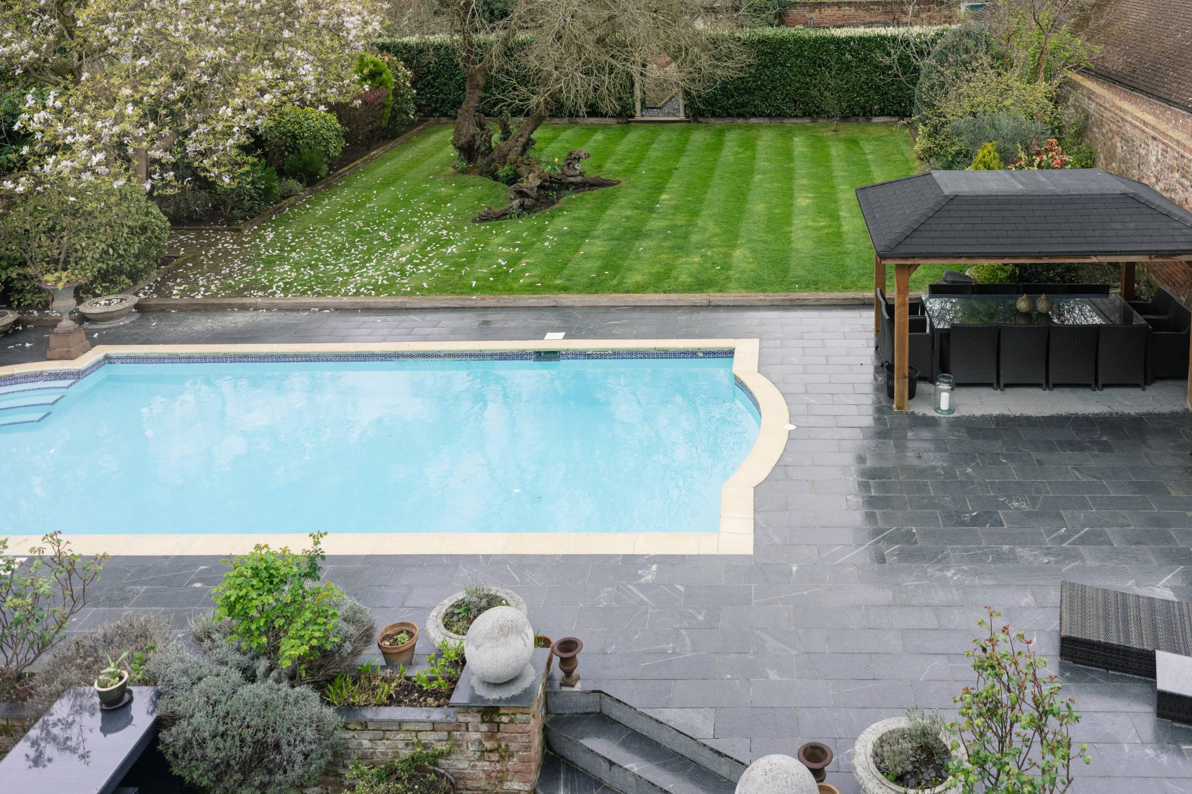 To the left of the garden stands the original coach house, still featuring its historic rein hooks. This characterful building has been thoughtfully converted to include a bathroom, pool maintenance area, and garage on the ground floor, with a study and studio room above. With its own access and amenities, it offers excellent potential to become a self-contained annexe or to continue serving as home office, children’s playroom and dedicated cinema space, providing exceptional flexibility for modern family living.